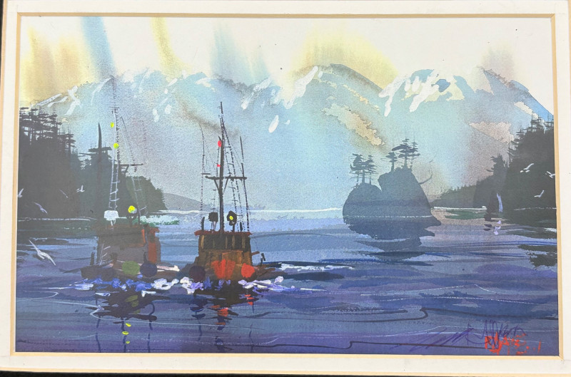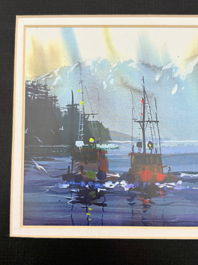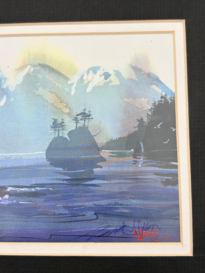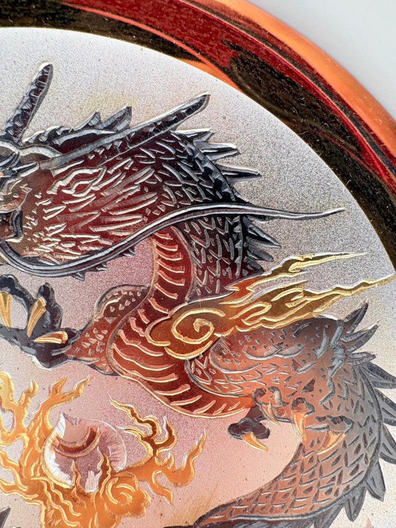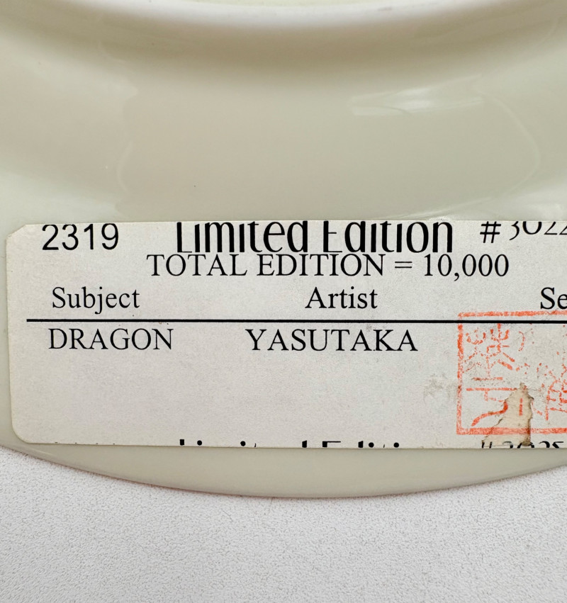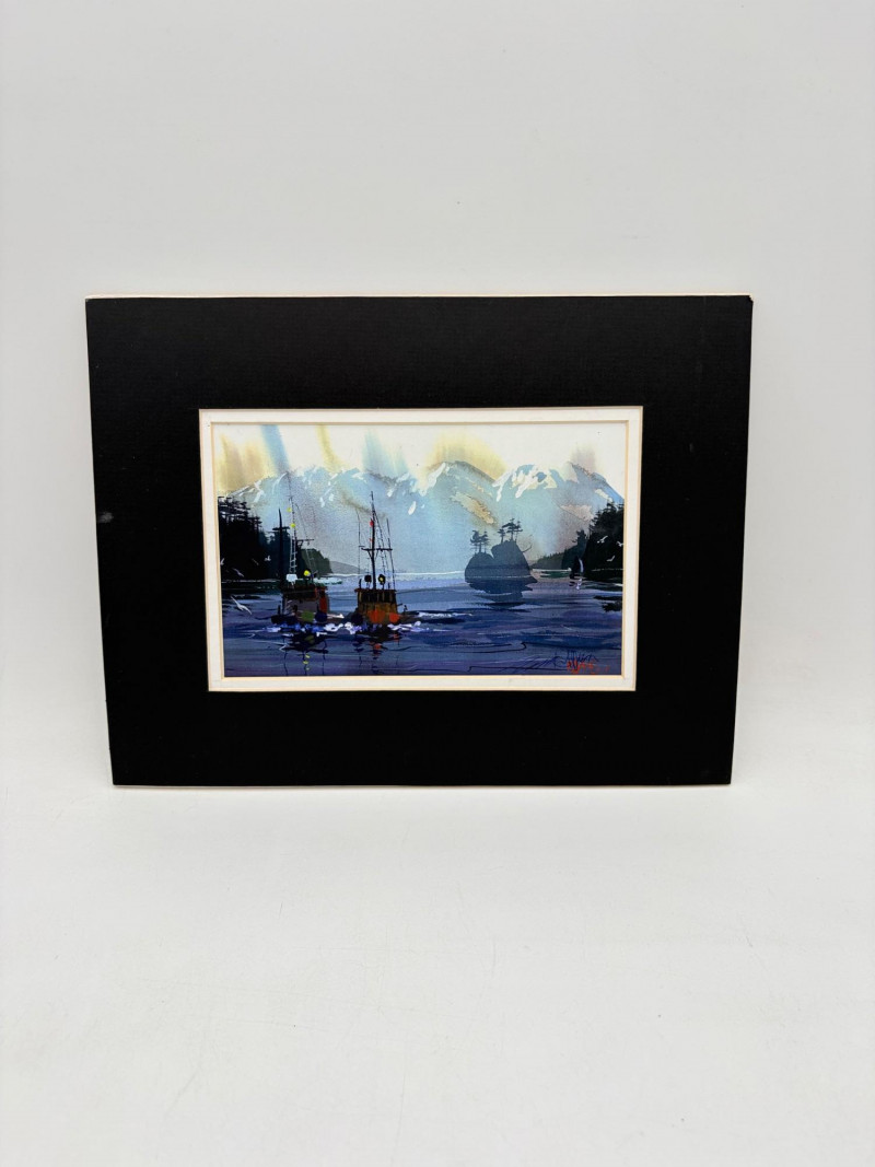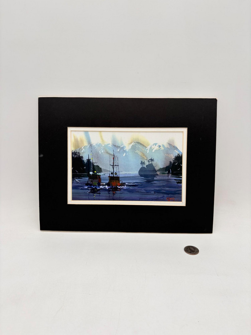 Quartet of art pieces from east & west. - Two 1970s prints of scenes in Strasbourg, France. From Krisarts of Paris. They are printed on quality paper which has a couple of slight ripples that should flatten out when framed. Printed area measures approx.8.25" H x 11.75" W on each. - print of an original watercolor maritime scene by artist Nancy Wages. Note that while this is a print, the artist appears to have signed in pen over the printed signature on the lower right. In a black double mat with overall measurements of 9.5" H x 12.25" W. Chokin Art plate of a dragon in gold with a 24K gold rim. Comes with stand & certificate. Measures just over 9" diameter.
