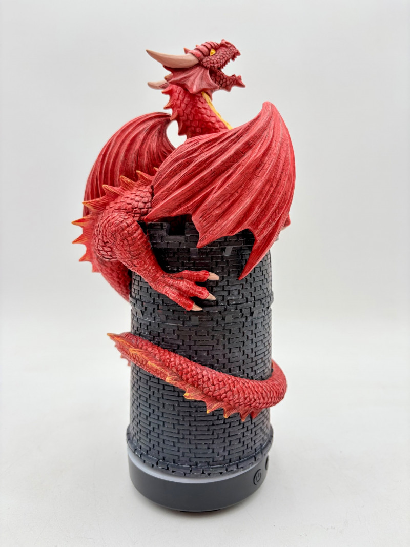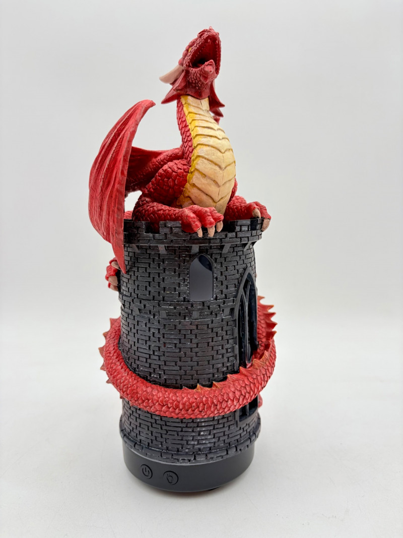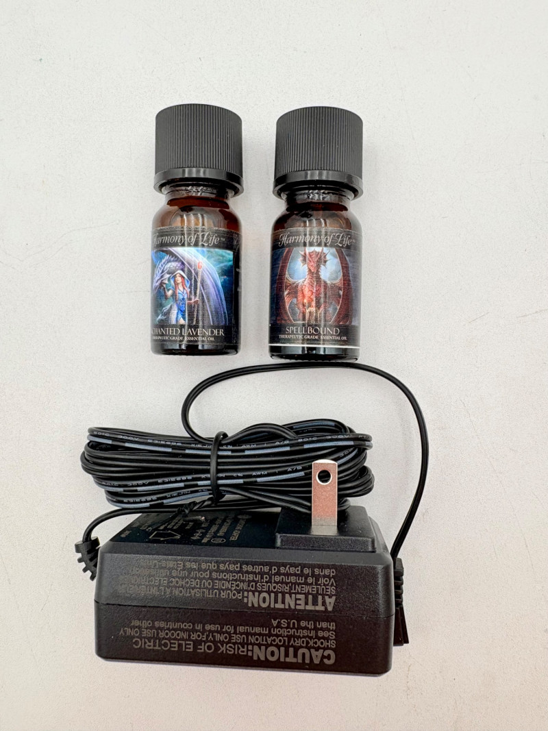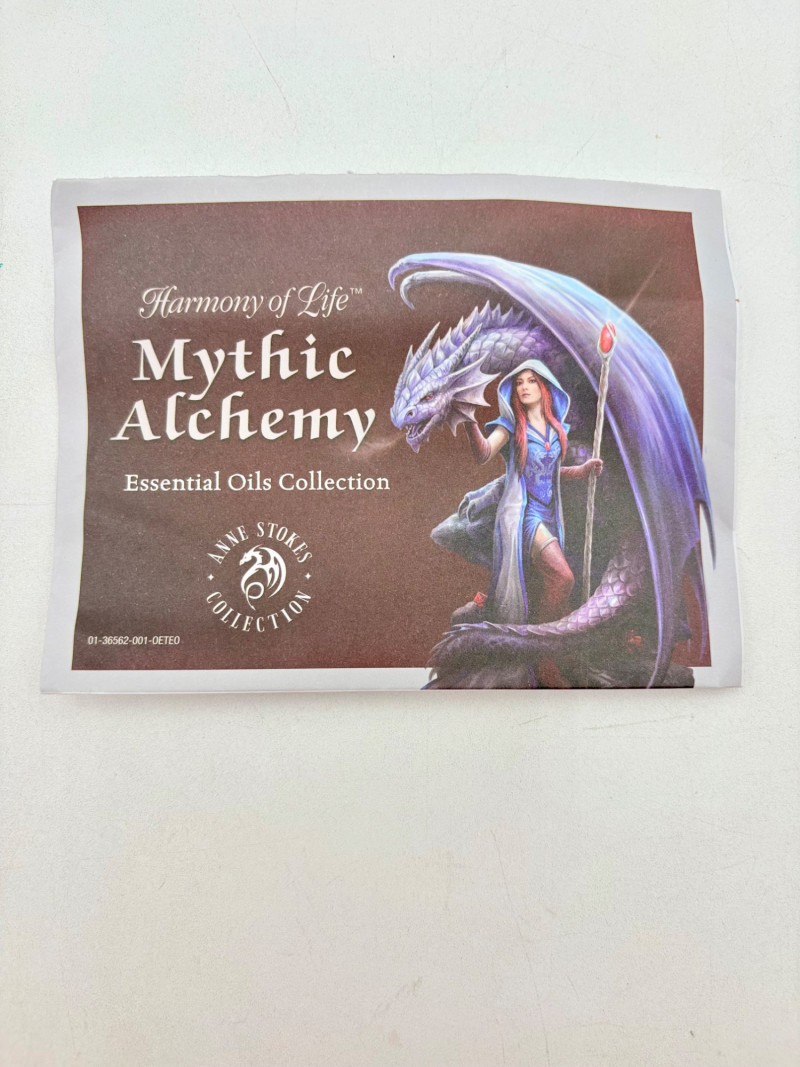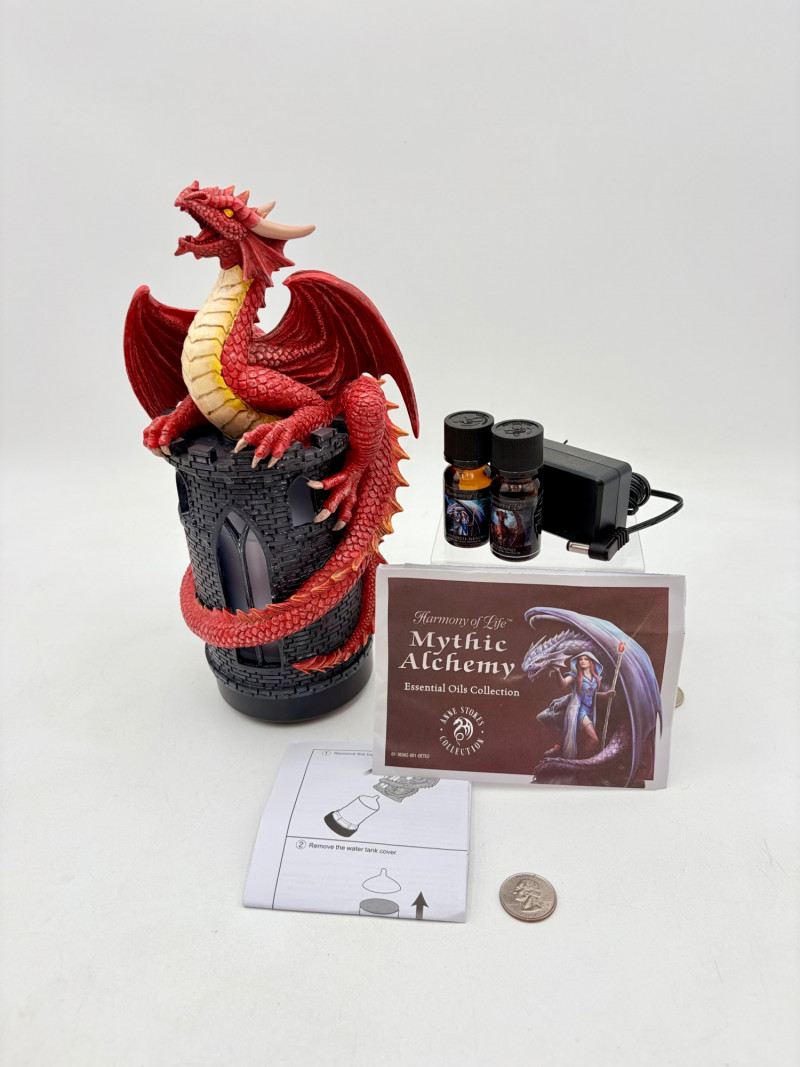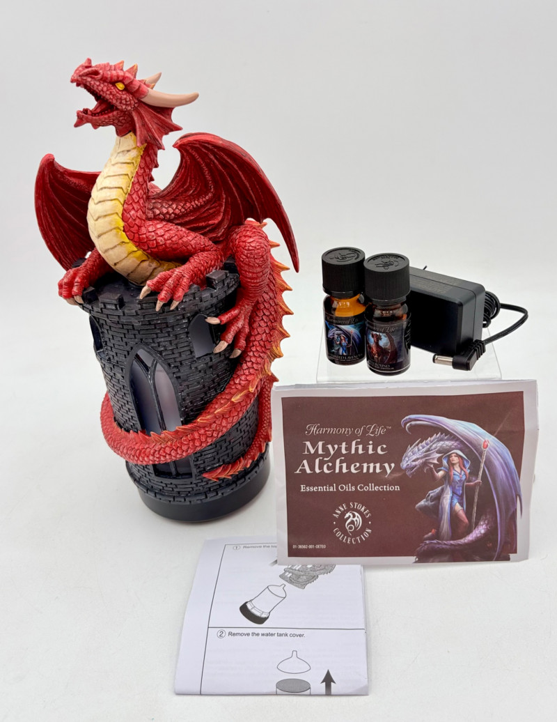 This is a Mythic Alchemy essential oil diffuser from Anne Stokes*. We think it is new and unused given that the oils are still sealed and the original wrap is around the electrical cord. Thus, we opted not to test it so its new owner has everything fresh. Includes: - Red & white dragon atop castle diffuser. Measures 10.5" H - Power cord - 2 bottles of oil - Spellbound & Enchanted Lavender - Instructions in sealed envelope * Stokes' silver dragon is in Lot #12.