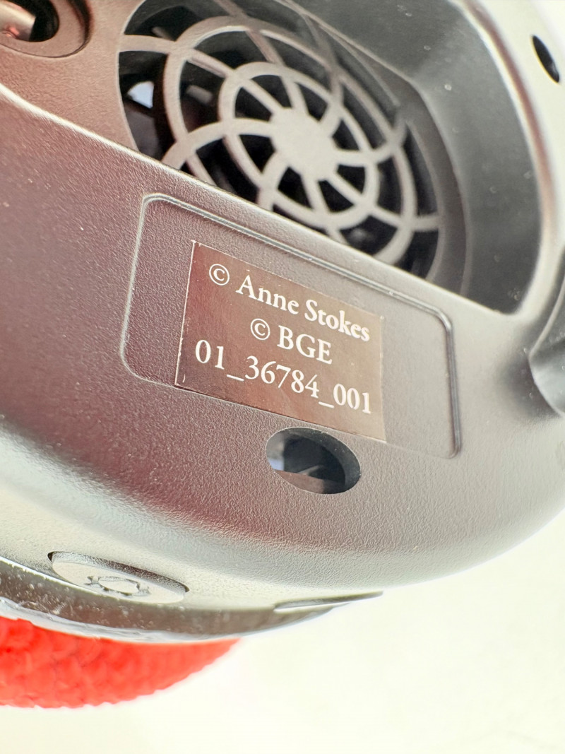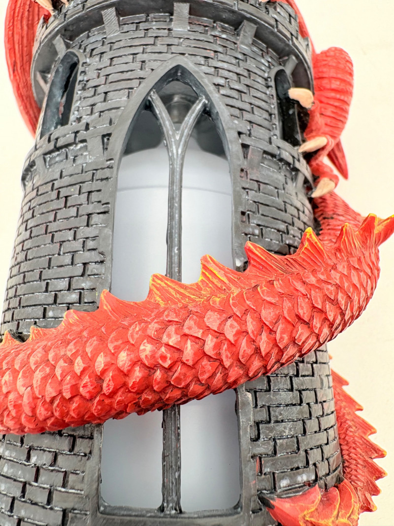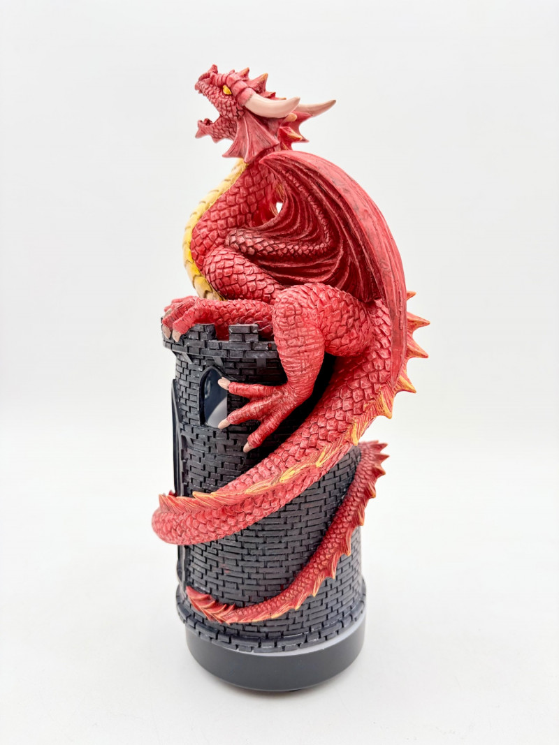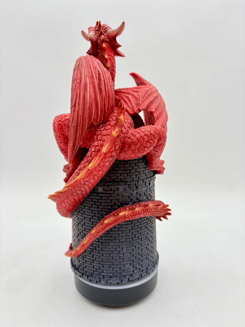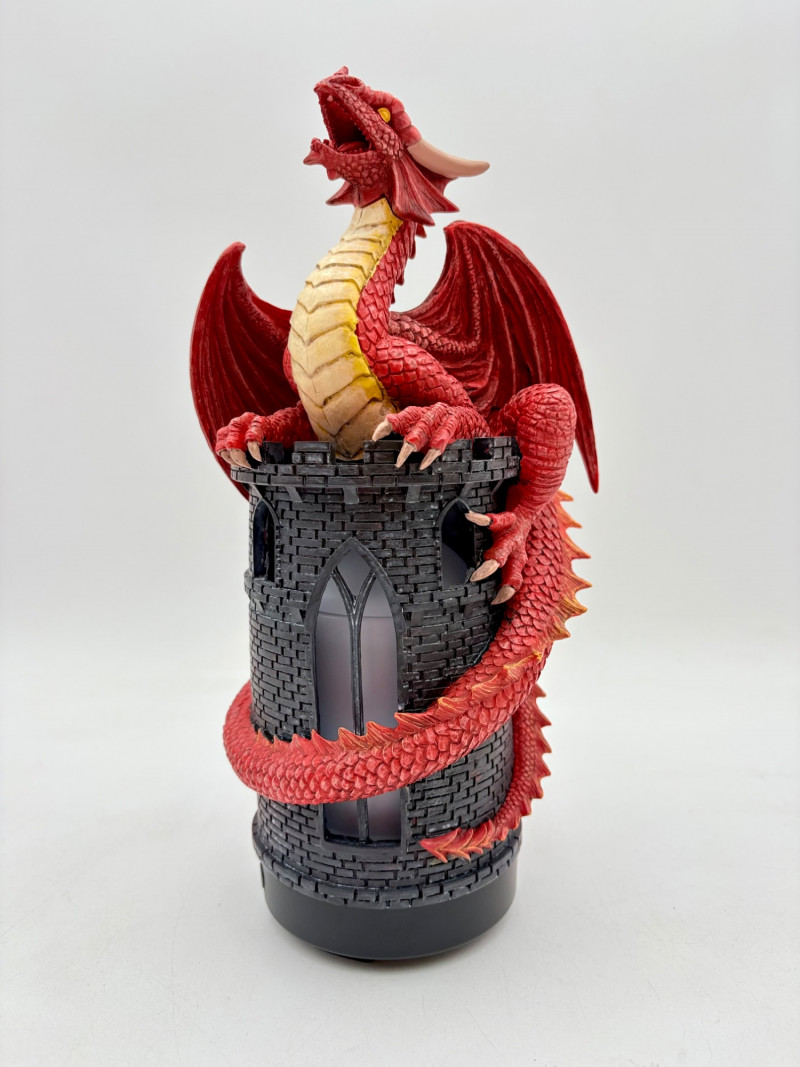This is a Mythic Alchemy essential oil diffuser from Anne Stokes*. We think it is new and unused given that the oils are still sealed and the original wrap is around the electrical cord. Thus, we opted not to test it so its new owner has everything fresh. Includes: - Red & white dragon atop castle diffuser. Measures 10.5" H - Power cord - 2 bottles of oil - Spellbound & Enchanted Lavender - Instructions in sealed envelope * Stokes' silver dragon is in Lot #12.