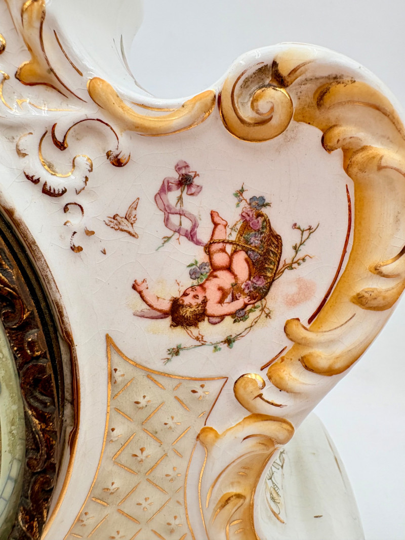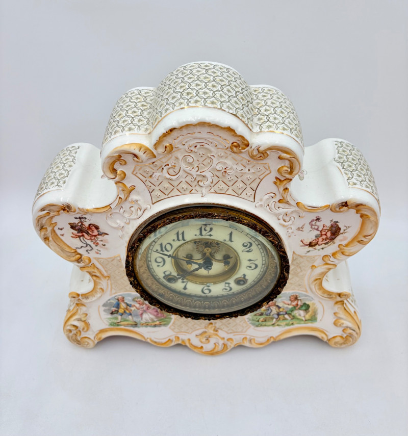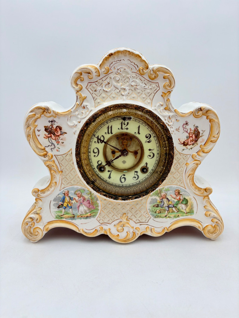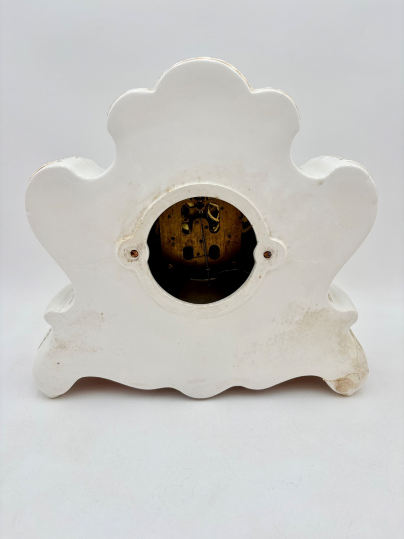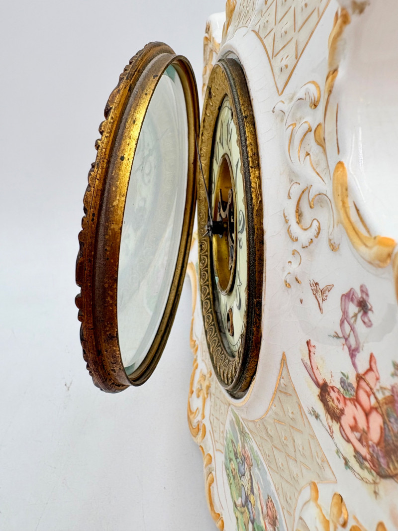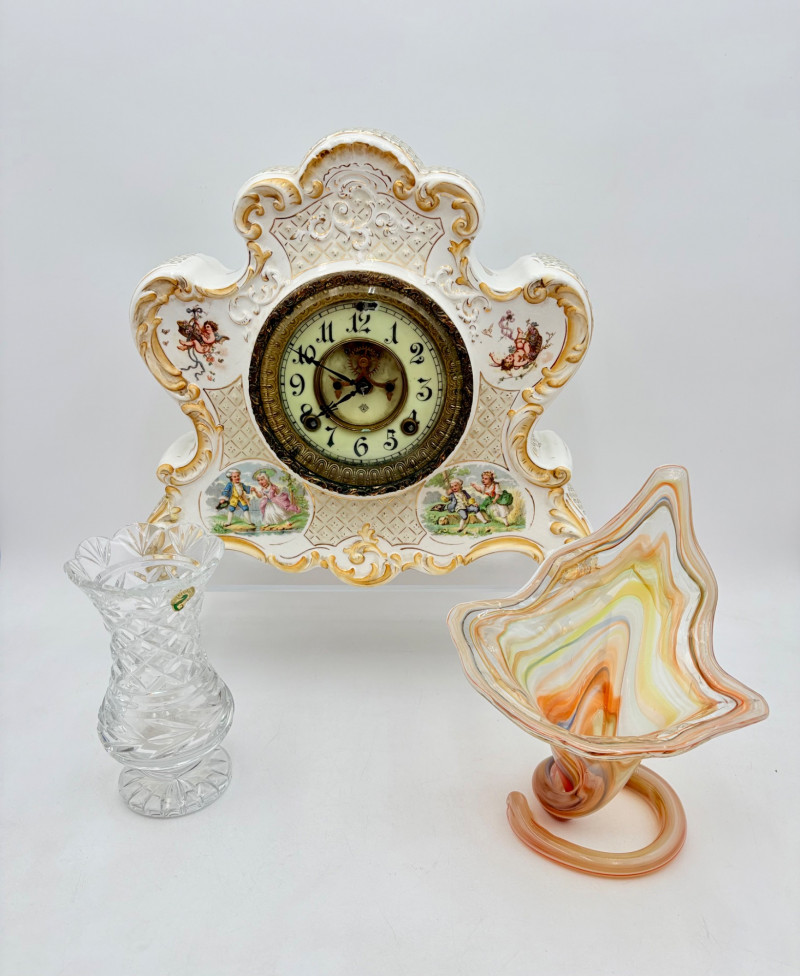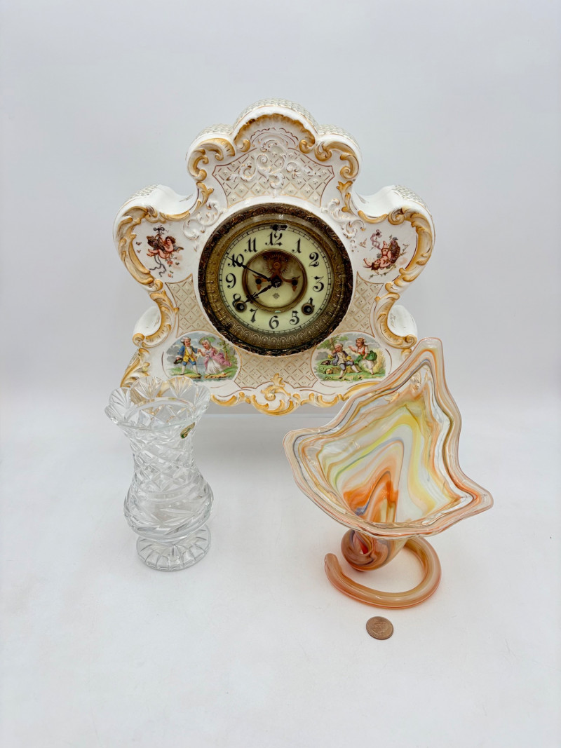 Two vintage glass display vases and an antique clock! - Classic lead crystal vase from Waterford is in the Clara design. We know this is an older piece as it made in Ireland and most of their production moved offshore in the past decades. Measures 7" H. - Striped free-form vase with a swirled base is blown glass, but has no maker mark. However, we think it is an art piece given the depressions where the artist would hold the pieces to stretch the glass points. Measures 9" H. - To be honest, we debated about including this antique clock, but finally couldn't resist. It is a wonderful piece but has a couple of major flaws we want to draw your attention to. We don't think they really interfere with the enjoyment of the design, but you can judge for yourself. The exterior of the clock is porcelain and looks very German/French in origin - extremely close in design to Dresden clocks. It has Ansonia clockworks (see close up of clock face), but the only mark we can find on the exterior of the clock is on the base where is says "HG Bates". The design is lovely with intricate interlocking floral patterns on the sides and great gold highlighting around the cherubs and lovers on the front. The curly edges and delicate butterflies make it a wonderful feast for the eyes and the metal finishing around the face/glass cover are really pretty! Measures 12" H x 14" W x4.5" D. Please be advised that while it will look nice on a shelf, be aware of the following as shown in the last 3 photos: there has been a poorly done repair to a break on the lower left base, the back inner workings door is missing, and the clockface near the numeric 12 has been damaged. The clock has not been tested as we didn't have a key, so you may need to check the inner workings, too.