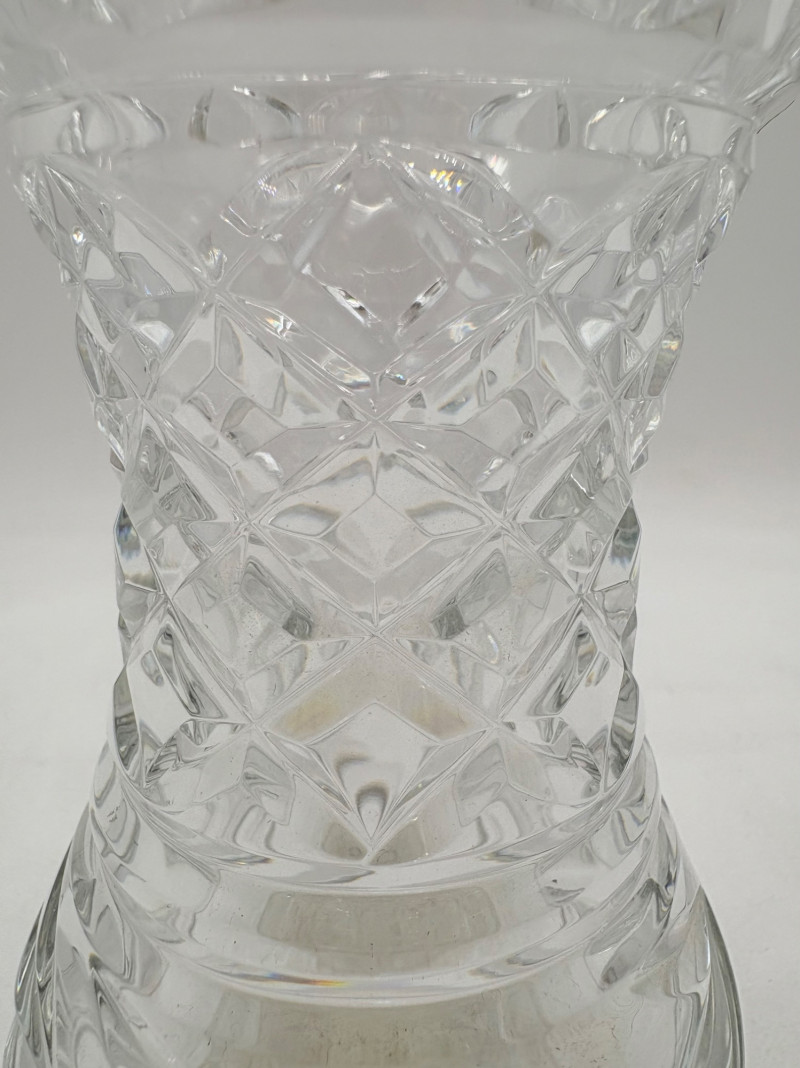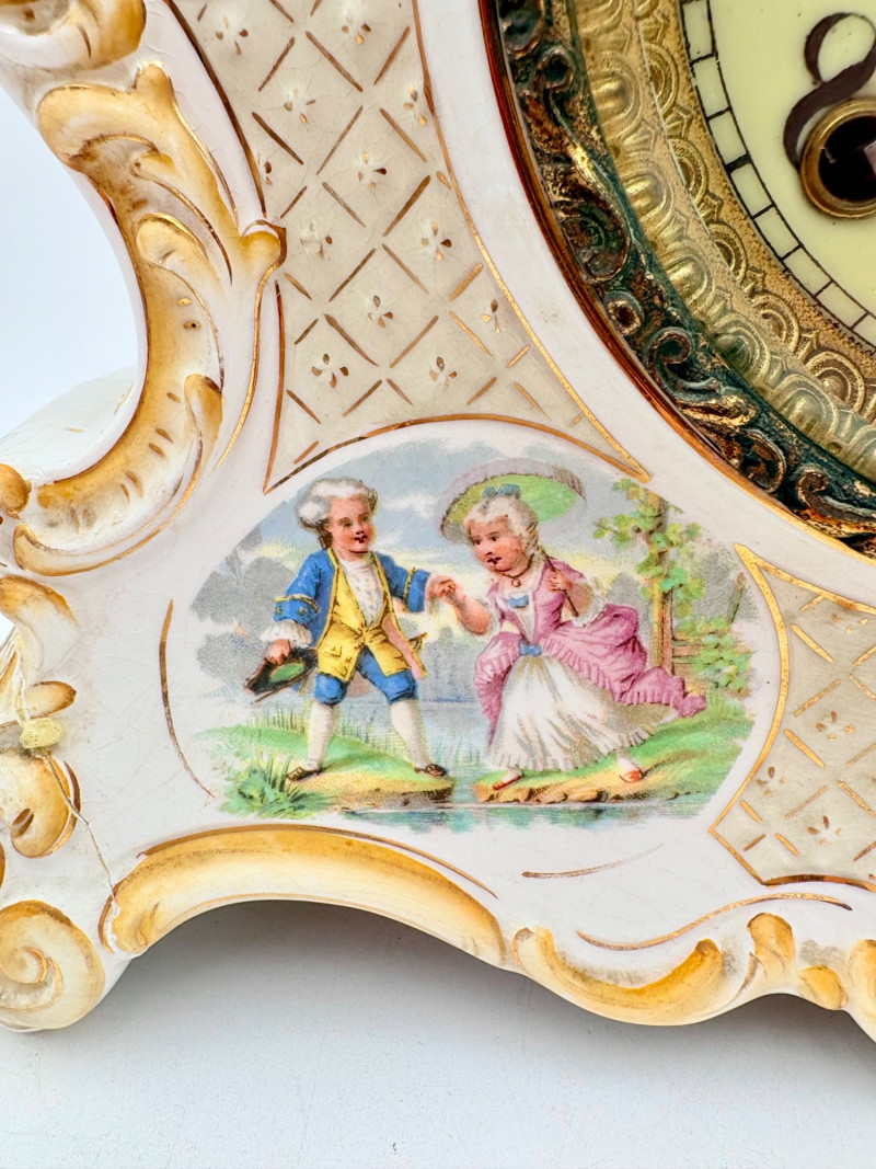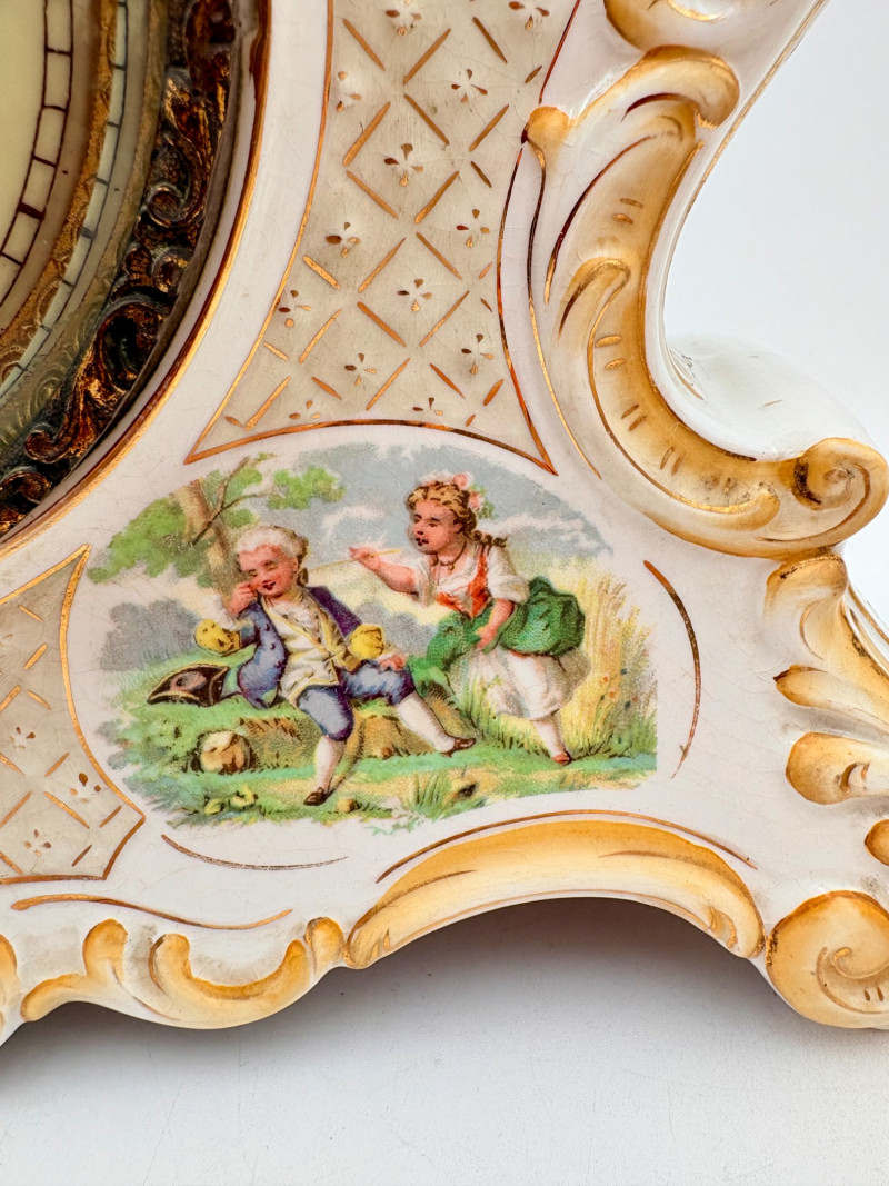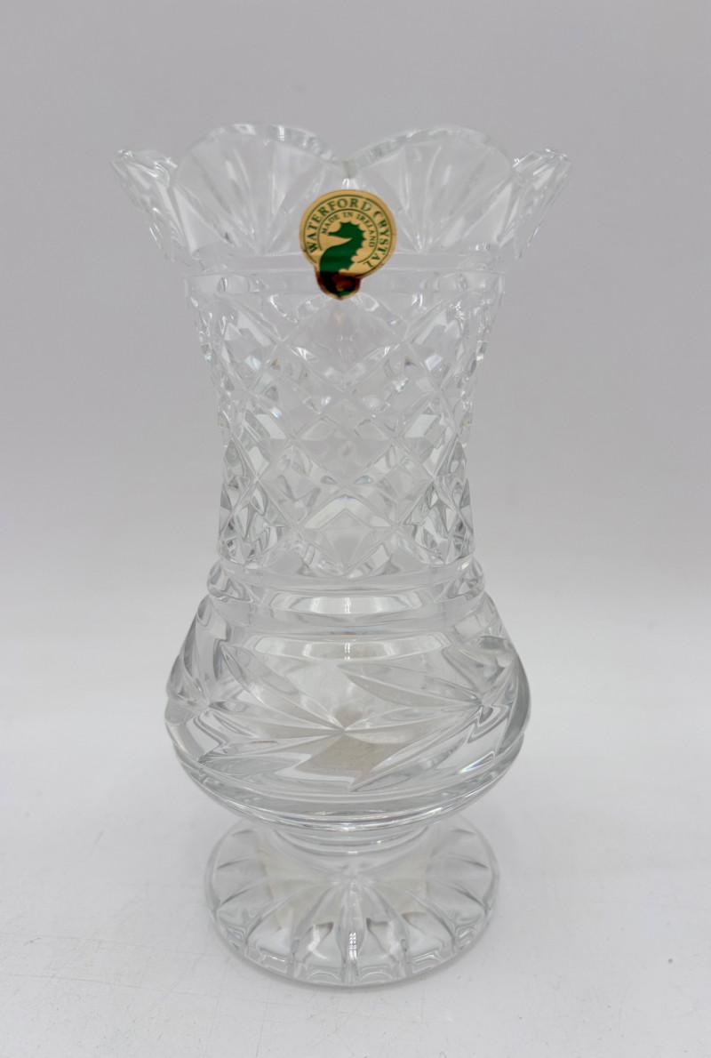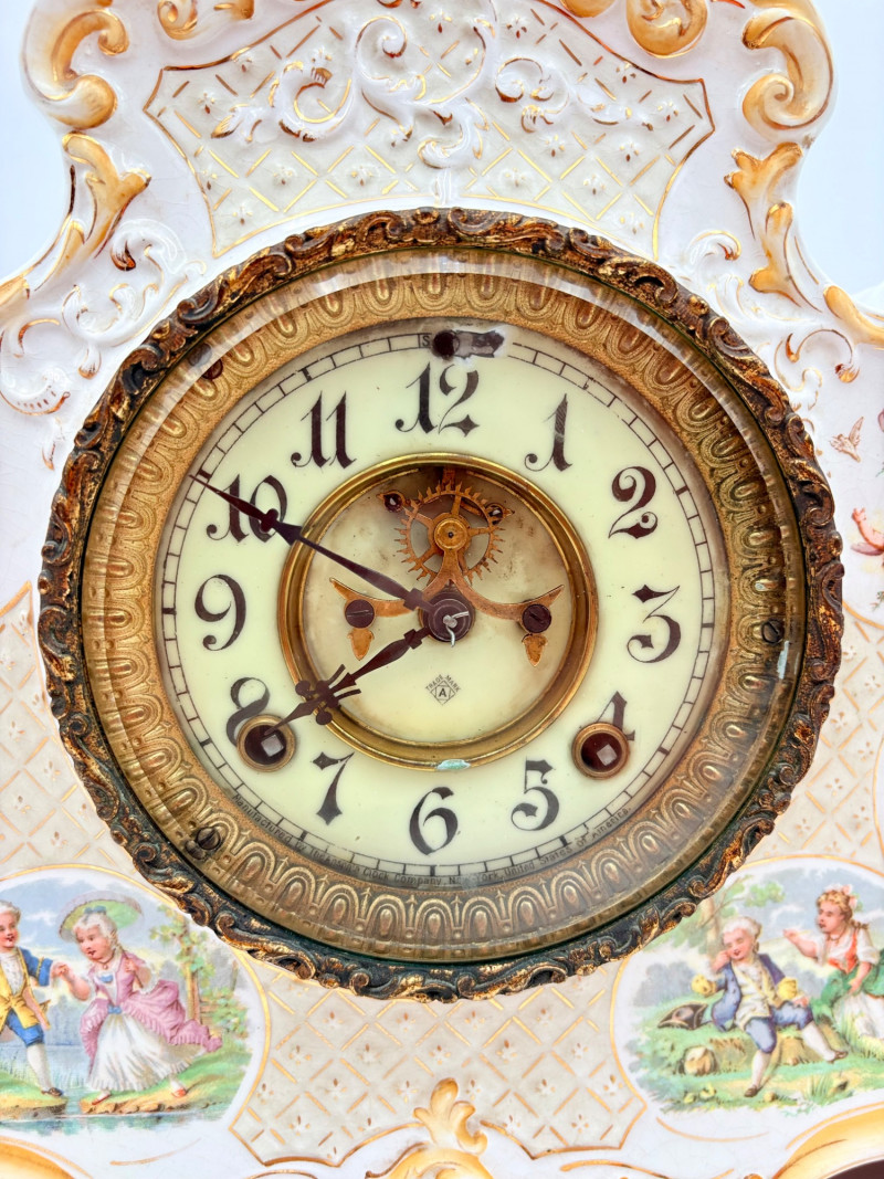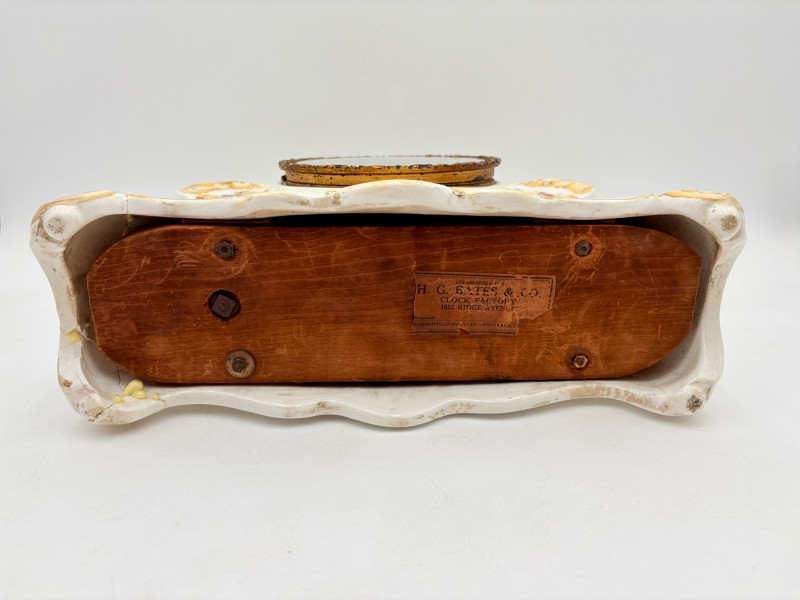 Two vintage glass display vases and an antique clock! - Classic lead crystal vase from Waterford is in the Clara design. We know this is an older piece as it made in Ireland and most of their production moved offshore in the past decades. Measures 7" H. - Striped free-form vase with a swirled base is blown glass, but has no maker mark. However, we think it is an art piece given the depressions where the artist would hold the pieces to stretch the glass points. Measures 9" H. - To be honest, we debated about including this antique clock, but finally couldn't resist. It is a wonderful piece but has a couple of major flaws we want to draw your attention to. We don't think they really interfere with the enjoyment of the design, but you can judge for yourself. The exterior of the clock is porcelain and looks very German/French in origin - extremely close in design to Dresden clocks. It has Ansonia clockworks (see close up of clock face), but the only mark we can find on the exterior of the clock is on the base where is says "HG Bates". The design is lovely with intricate interlocking floral patterns on the sides and great gold highlighting around the cherubs and lovers on the front. The curly edges and delicate butterflies make it a wonderful feast for the eyes and the metal finishing around the face/glass cover are really pretty! Measures 12" H x 14" W x4.5" D. Please be advised that while it will look nice on a shelf, be aware of the following as shown in the last 3 photos: there has been a poorly done repair to a break on the lower left base, the back inner workings door is missing, and the clockface near the numeric 12 has been damaged. The clock has not been tested as we didn't have a key, so you may need to check the inner workings, too.