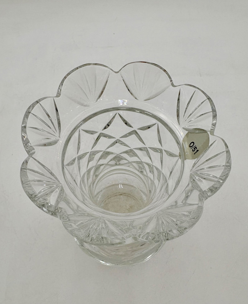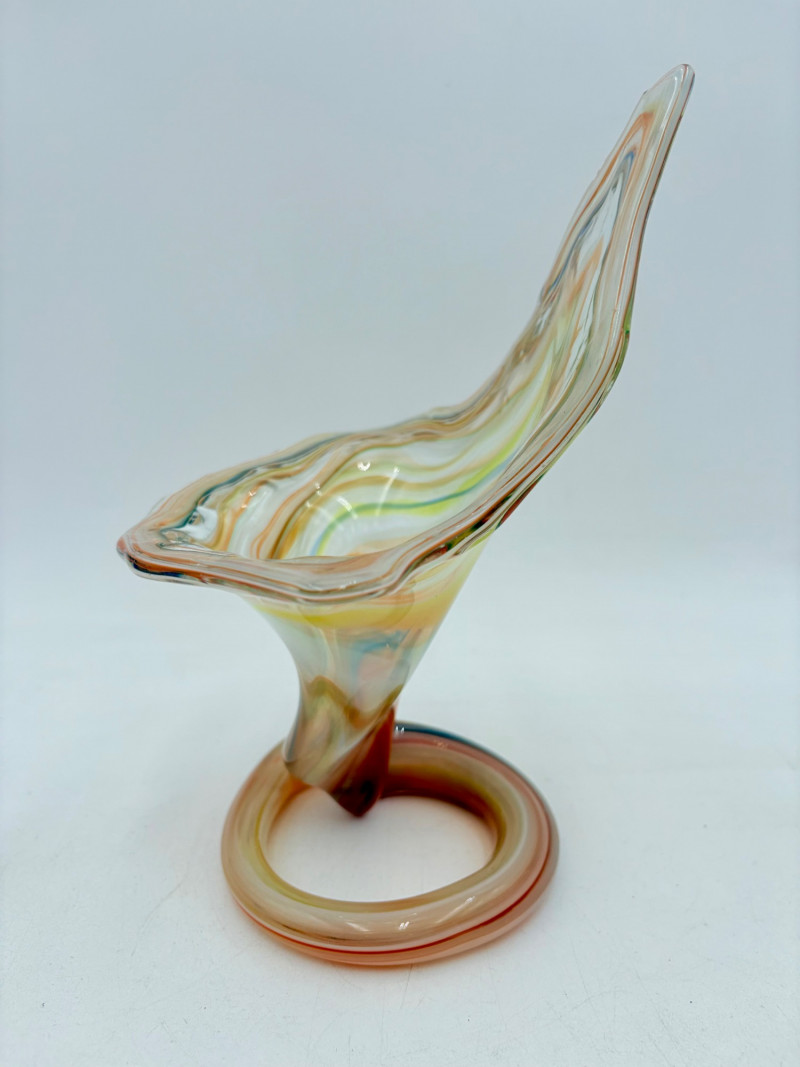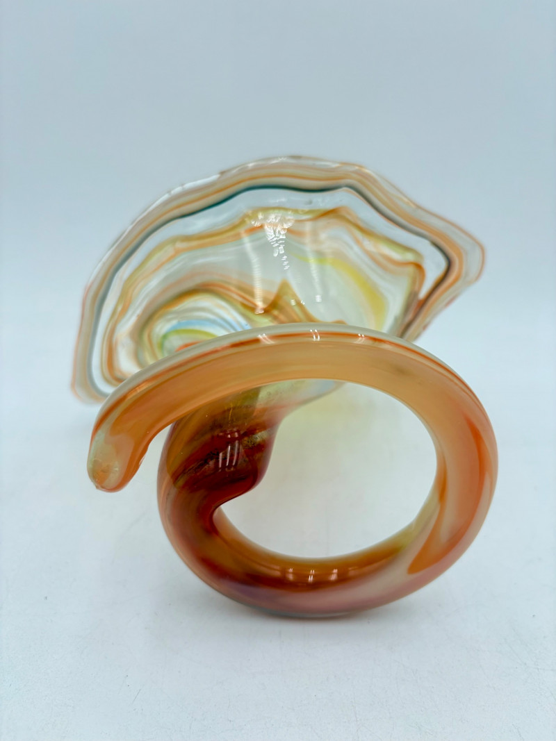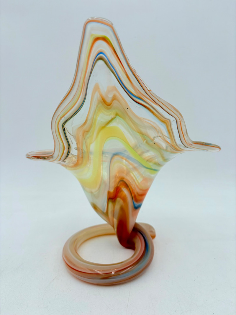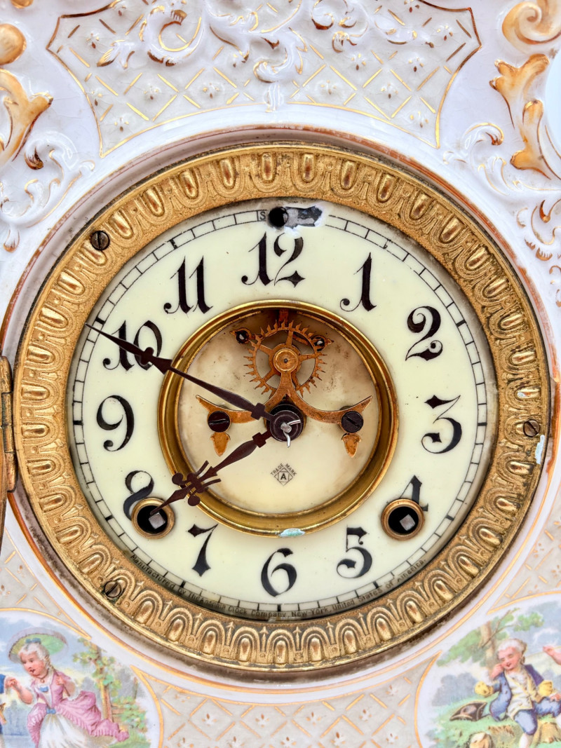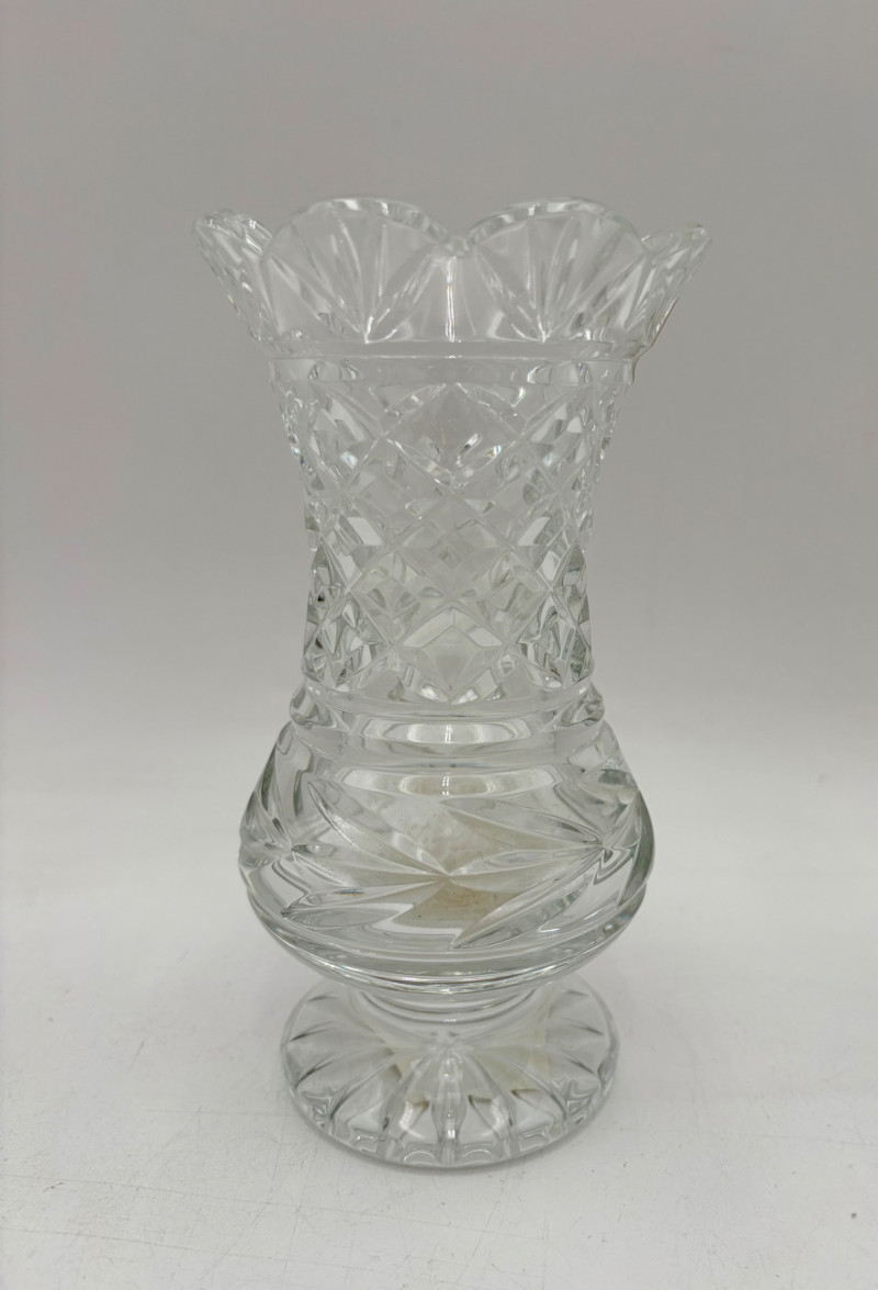 Two vintage glass display vases and an antique clock! - Classic lead crystal vase from Waterford is in the Clara design. We know this is an older piece as it made in Ireland and most of their production moved offshore in the past decades. Measures 7" H. - Striped free-form vase with a swirled base is blown glass, but has no maker mark. However, we think it is an art piece given the depressions where the artist would hold the pieces to stretch the glass points. Measures 9" H. - To be honest, we debated about including this antique clock, but finally couldn't resist. It is a wonderful piece but has a couple of major flaws we want to draw your attention to. We don't think they really interfere with the enjoyment of the design, but you can judge for yourself. The exterior of the clock is porcelain and looks very German/French in origin - extremely close in design to Dresden clocks. It has Ansonia clockworks (see close up of clock face), but the only mark we can find on the exterior of the clock is on the base where is says "HG Bates". The design is lovely with intricate interlocking floral patterns on the sides and great gold highlighting around the cherubs and lovers on the front. The curly edges and delicate butterflies make it a wonderful feast for the eyes and the metal finishing around the face/glass cover are really pretty! Measures 12" H x 14" W x4.5" D. Please be advised that while it will look nice on a shelf, be aware of the following as shown in the last 3 photos: there has been a poorly done repair to a break on the lower left base, the back inner workings door is missing, and the clockface near the numeric 12 has been damaged. The clock has not been tested as we didn't have a key, so you may need to check the inner workings, too.