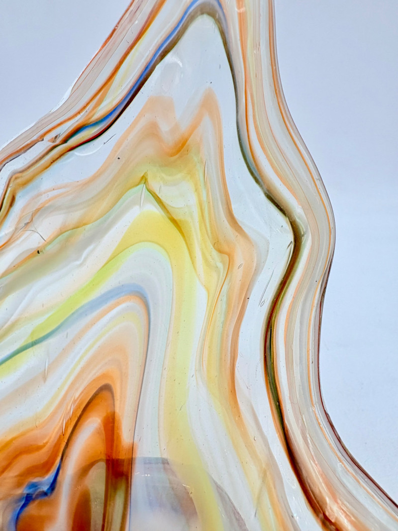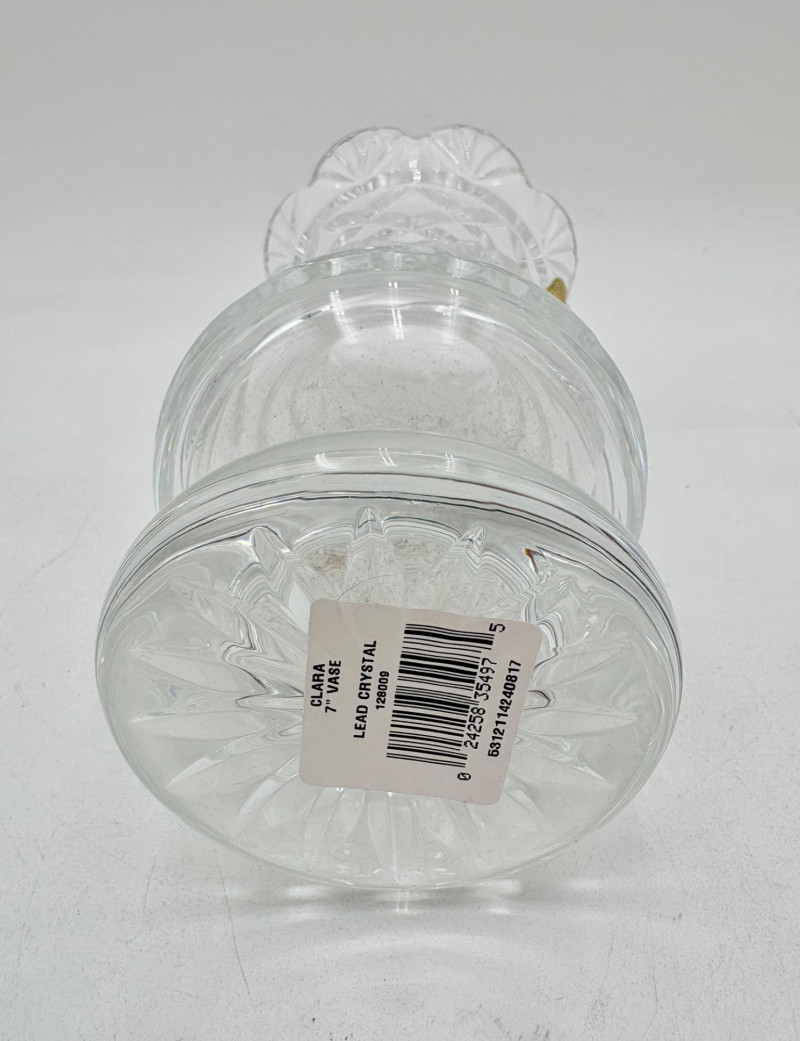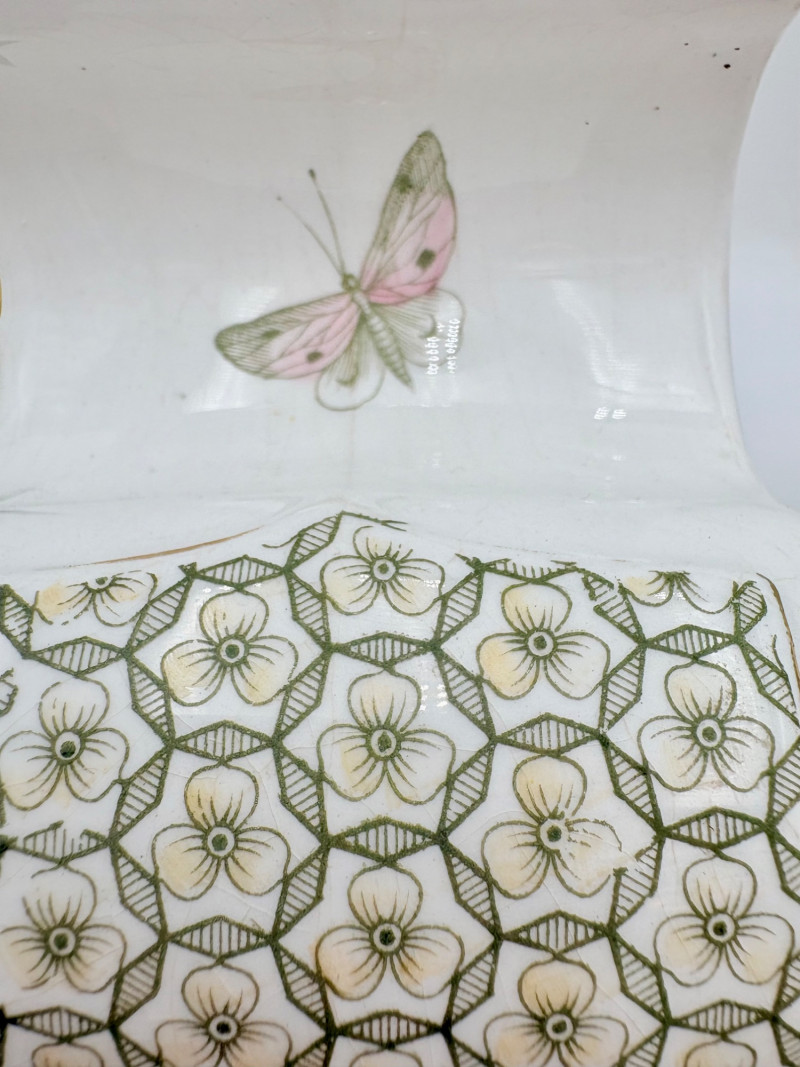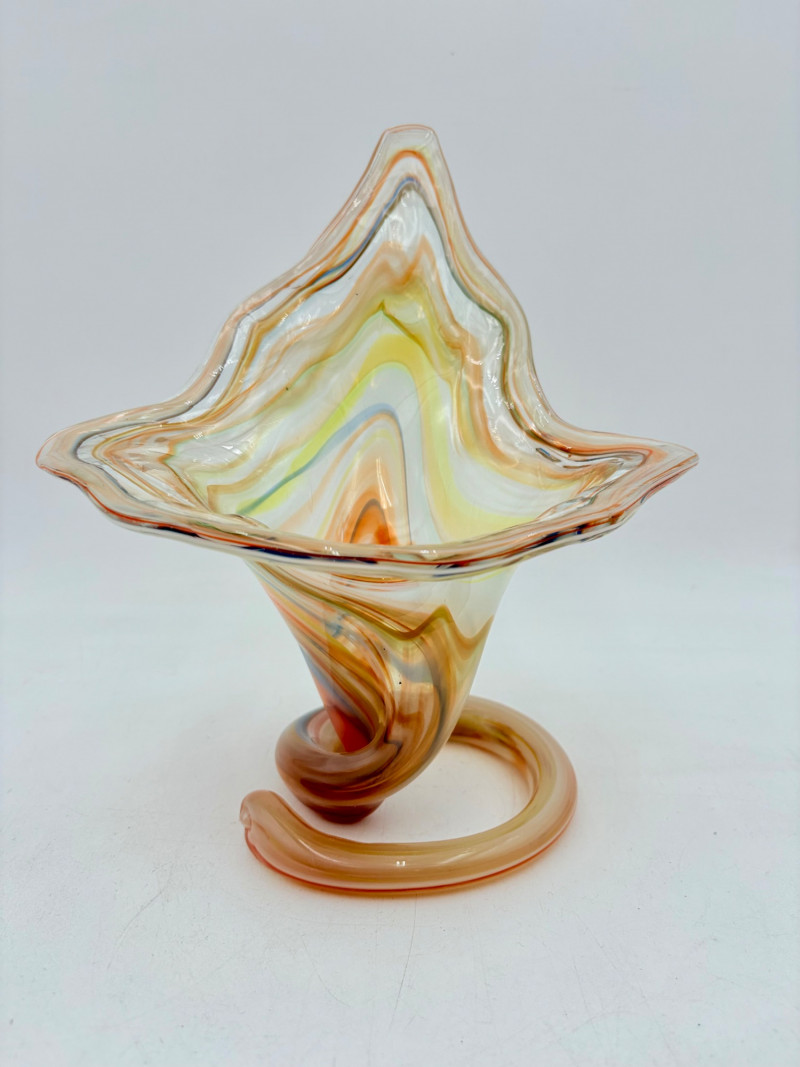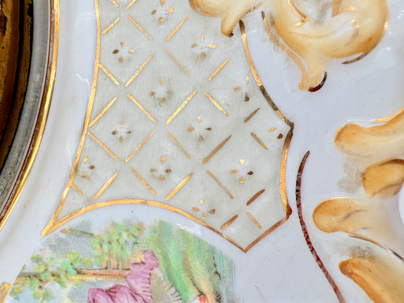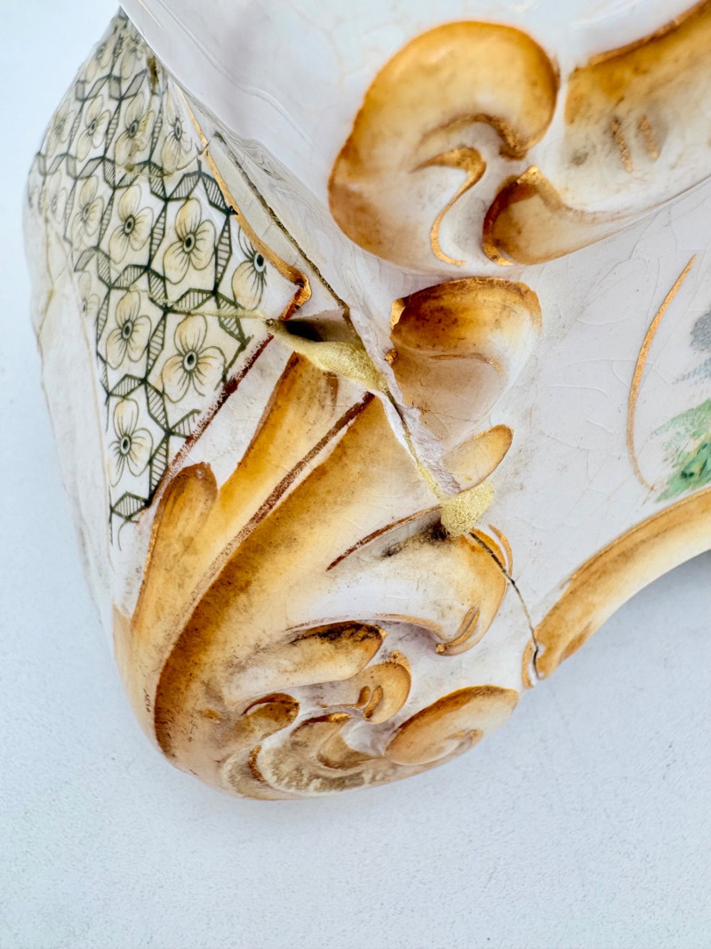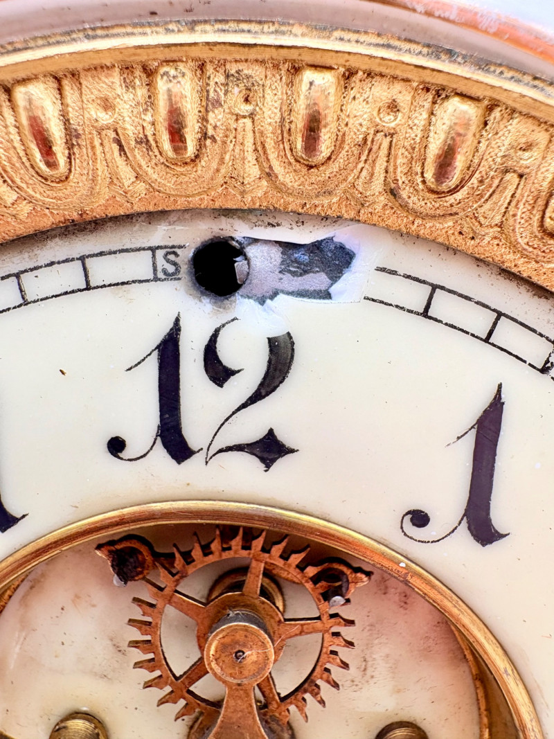 Two vintage glass display vases and an antique clock! - Classic lead crystal vase from Waterford is in the Clara design. We know this is an older piece as it made in Ireland and most of their production moved offshore in the past decades. Measures 7" H. - Striped free-form vase with a swirled base is blown glass, but has no maker mark. However, we think it is an art piece given the depressions where the artist would hold the pieces to stretch the glass points. Measures 9" H. - To be honest, we debated about including this antique clock, but finally couldn't resist. It is a wonderful piece but has a couple of major flaws we want to draw your attention to. We don't think they really interfere with the enjoyment of the design, but you can judge for yourself. The exterior of the clock is porcelain and looks very German/French in origin - extremely close in design to Dresden clocks. It has Ansonia clockworks (see close up of clock face), but the only mark we can find on the exterior of the clock is on the base where is says "HG Bates". The design is lovely with intricate interlocking floral patterns on the sides and great gold highlighting around the cherubs and lovers on the front. The curly edges and delicate butterflies make it a wonderful feast for the eyes and the metal finishing around the face/glass cover are really pretty! Measures 12" H x 14" W x4.5" D. Please be advised that while it will look nice on a shelf, be aware of the following as shown in the last 3 photos: there has been a poorly done repair to a break on the lower left base, the back inner workings door is missing, and the clockface near the numeric 12 has been damaged. The clock has not been tested as we didn't have a key, so you may need to check the inner workings, too.