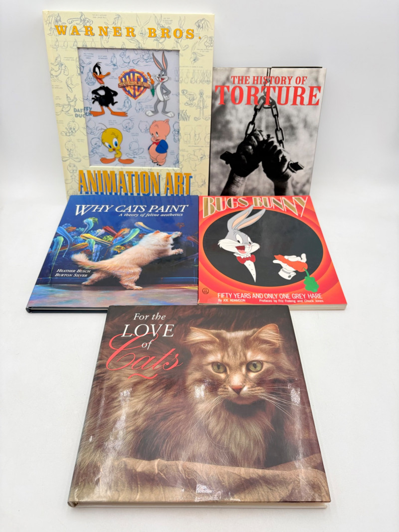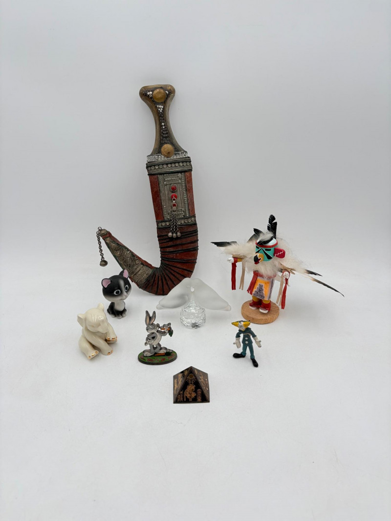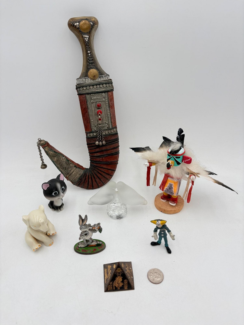 OK, these things don't really go together, but we've made it our goal to have at least one oddball lot in all of our auctions, so here goes: ITEMS: - Strange little Egyptian pyramid - Little Bugs Bunny figure in metal - Cat with a giant head in hard plastic - Pliable rubber creepy clown figurei - Small creamy porcelain elephant with gold highlights - Glass lovebirds - Antique kukui knife and sheath - Kachina doll RANDOM BOOKS: - Warner Bros. Animation Art (Jerry Beck & Will Friedwald) Hardback - Why Cats Paint (Heather Busch & Bruton Silver) Hardback - The History of Torture (Brian Innes) Hardback - Bugs Bunny (Joe Adamson) Hardback - For the Love of Cats (Amy Shojai & Irene Gizzi) Hardback