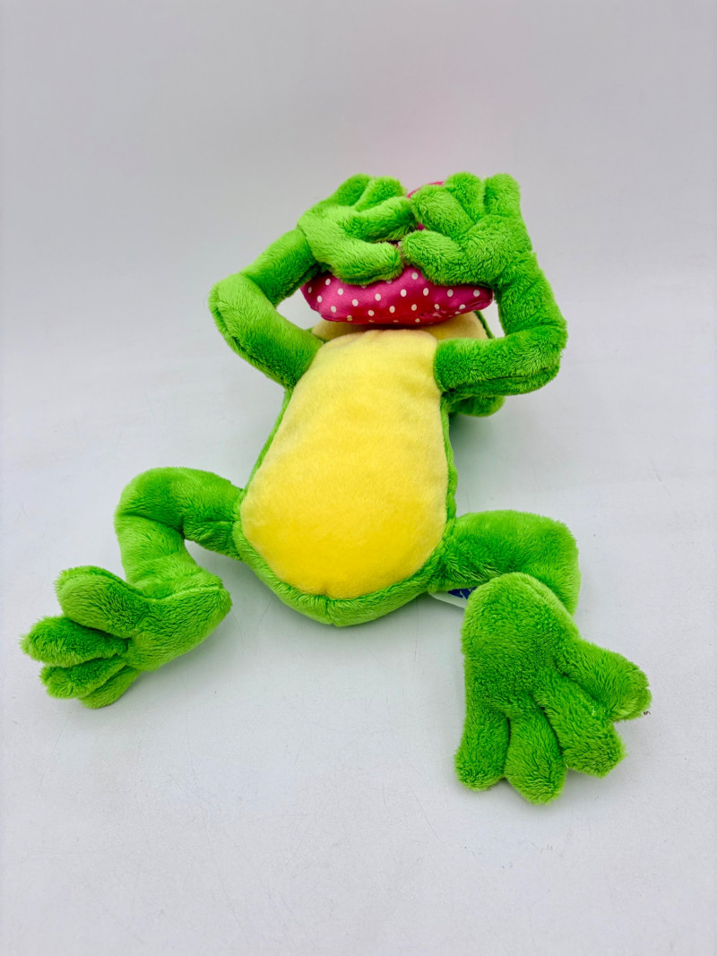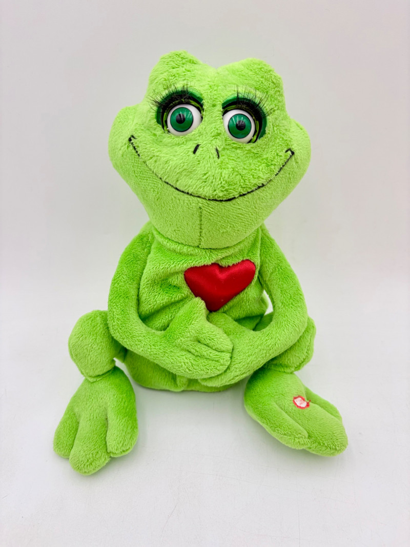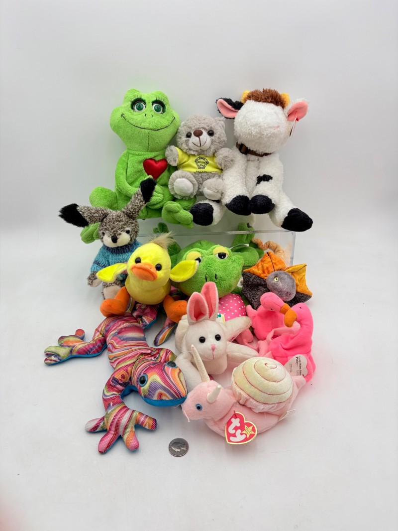 12 plushies from various manufacturers, but mostly Ty - what you see is what you get. Note that one of the frogs is soft, but has a battery box (we didn't test him so you can discover what he does on your own). Please see photos for details.