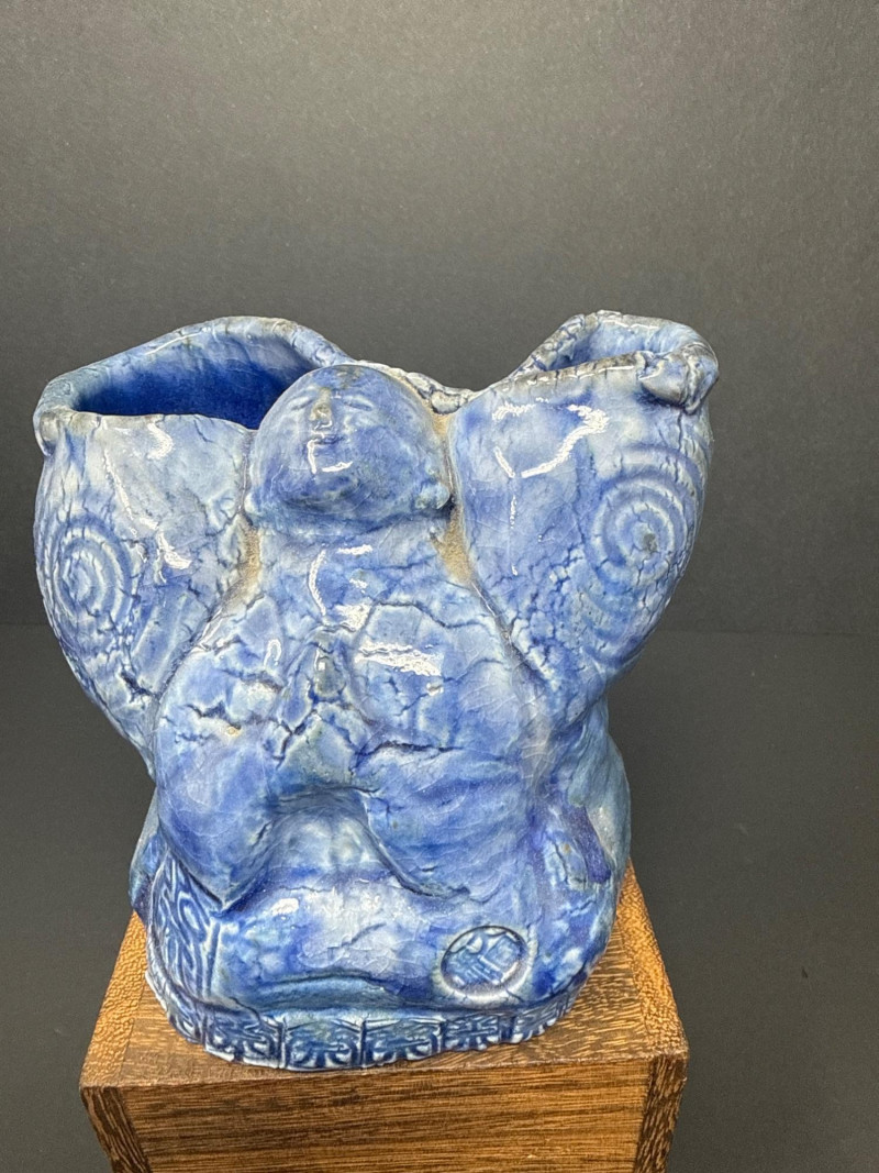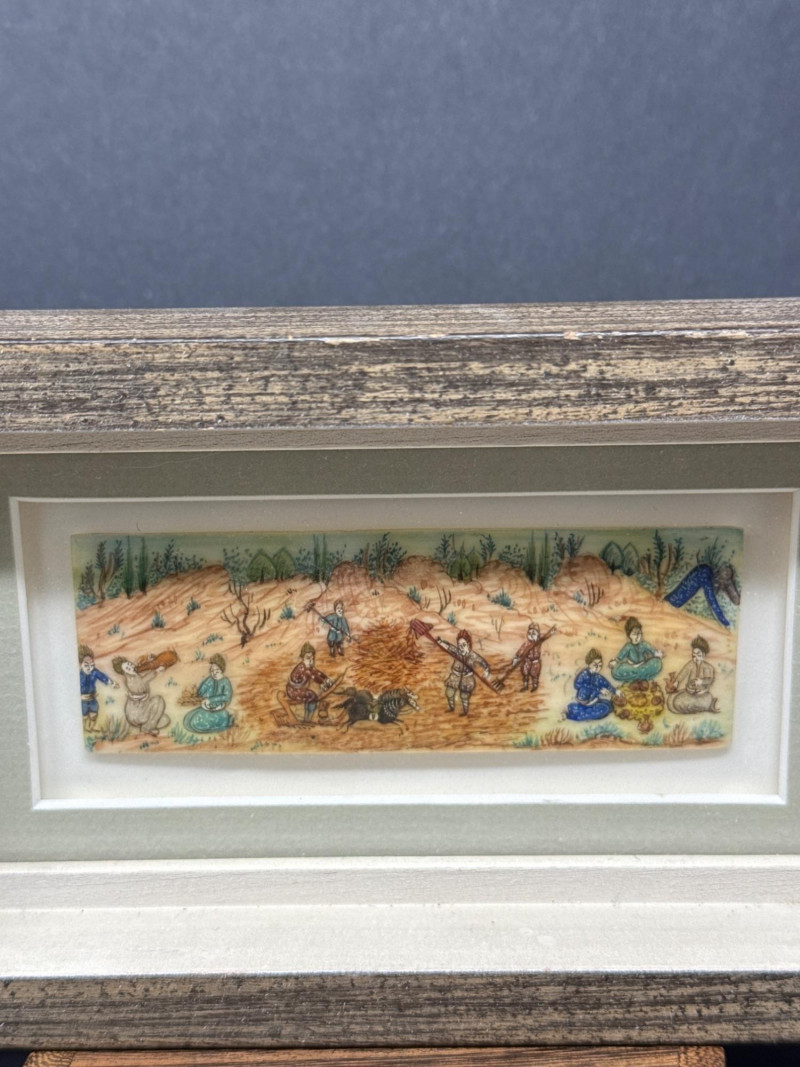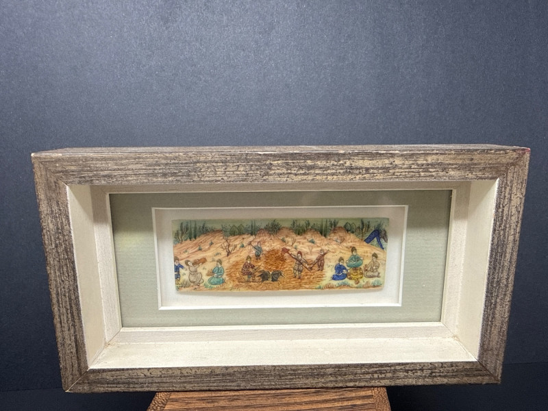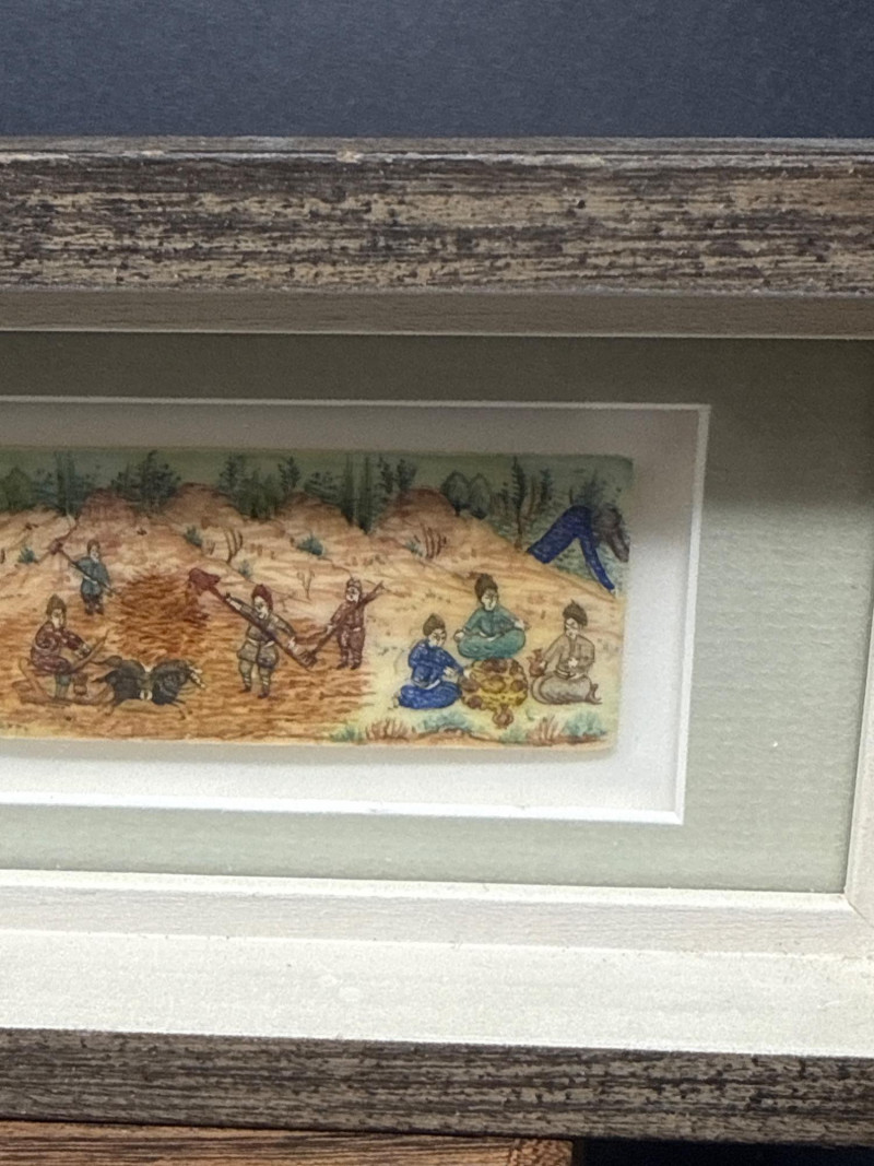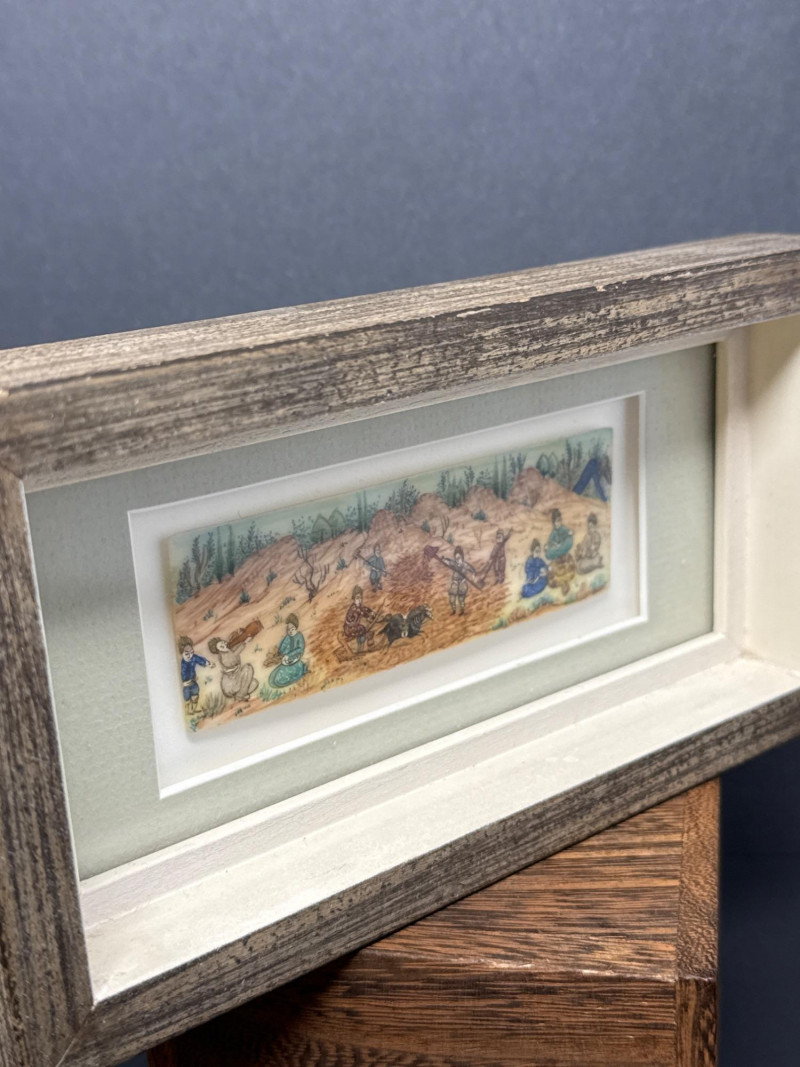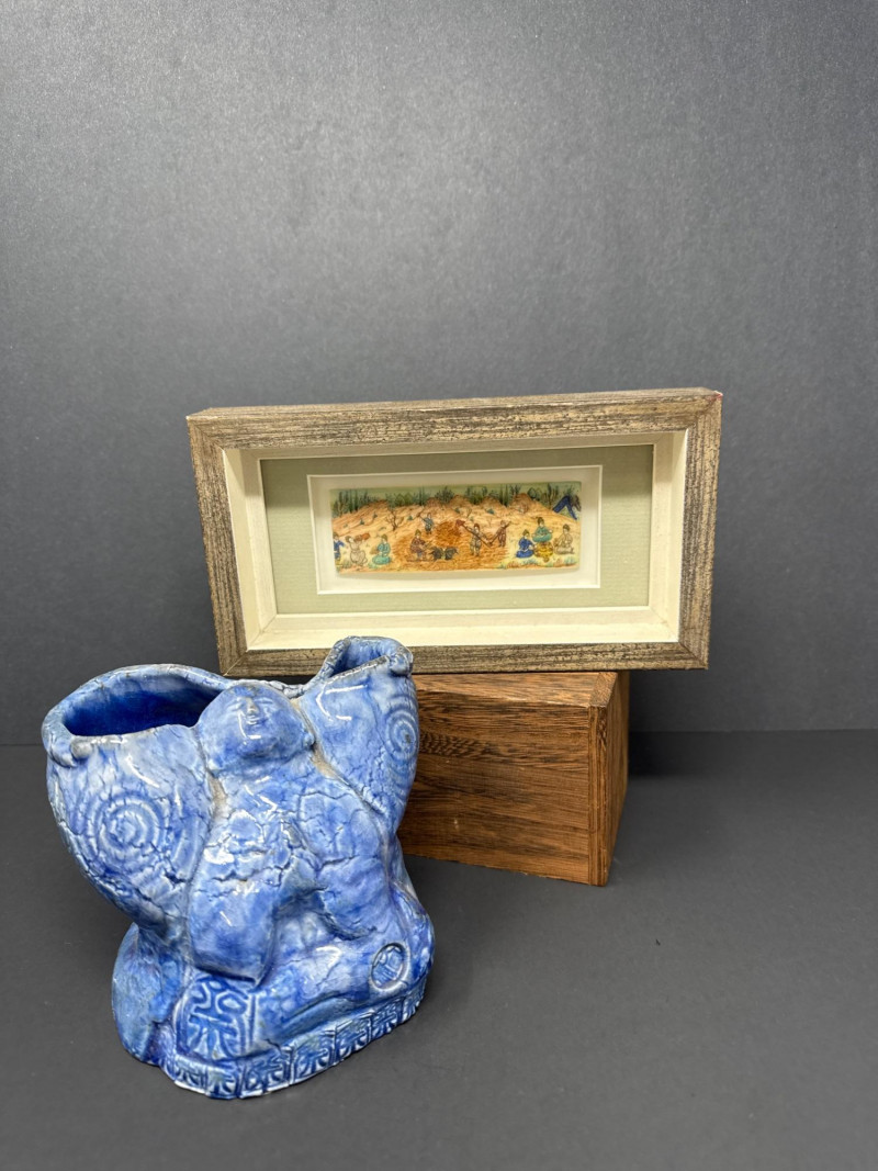Richard Kirsten‑Daiensai Ceramic Sculpture A hand‑formed ceramic figure by Seattle artist Richard Kirsten‑Daiensai (1920–2013), featuring his signature blend of spiritual symbolism and stylized form. The figure is rendered in deep blue glaze with incised geometric and spiral motifs, echoing the artist’s lifelong engagement with East‑Asian devotional imagery. Compact and contemplative, the piece carries the quiet, meditative presence characteristic of Kirsten’s small sculptural works. A finely detailed miniature painting executed on a natural bone fragment, depicting a lively hillside scene with multiple figures engaged in daily activity. The artist uses vivid color and tight brushwork to create a narrative tableau typical of traditional Asian folk‑art storytelling. The piece is mounted in a rustic wood frame and elevated on a small block stand for display. Art- 8 x 4 x 1.5 Thick sculpture- 4.5 T x 5” fired image, ceramics Hand‑Painted Asian Scene on Bone