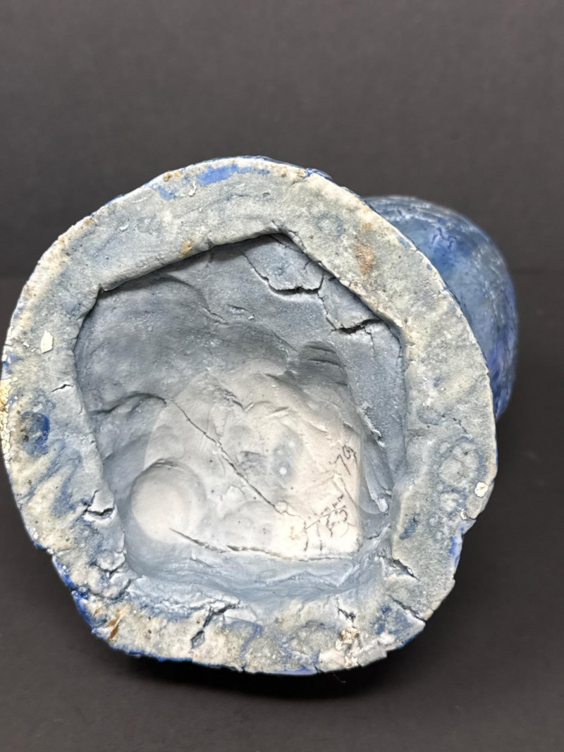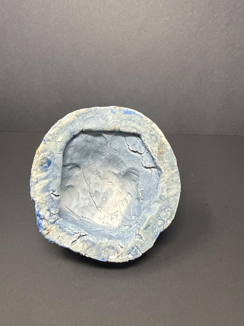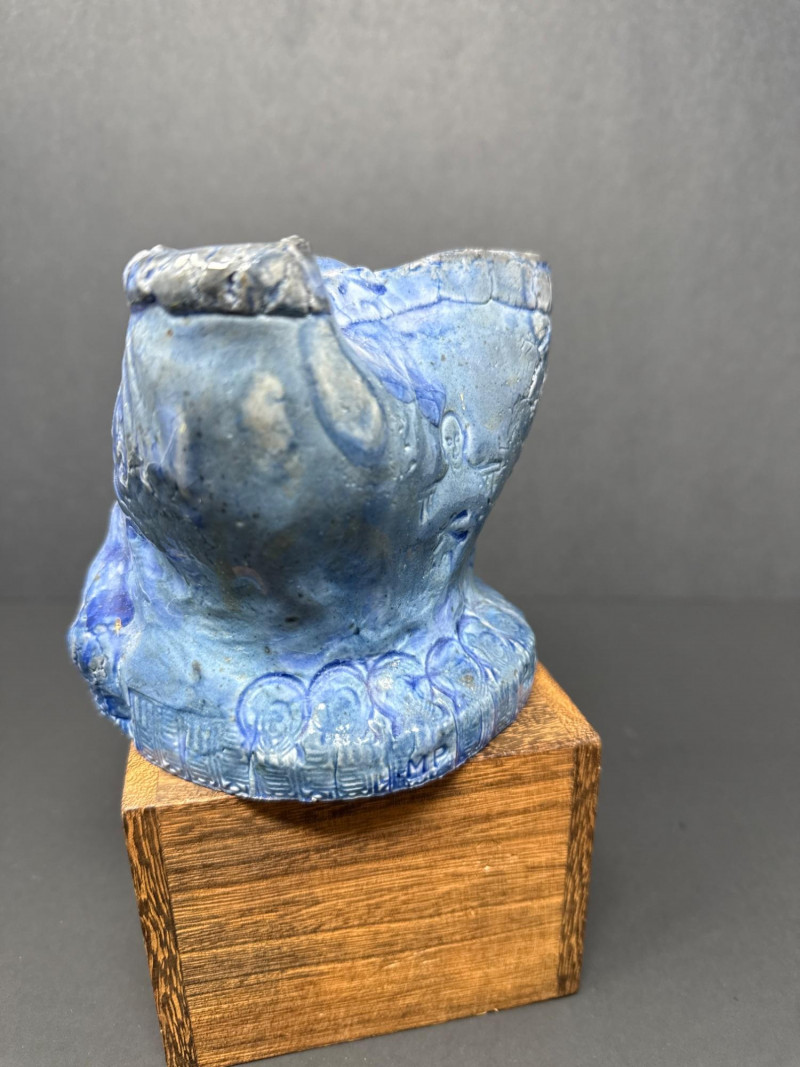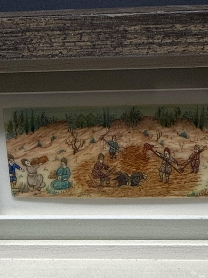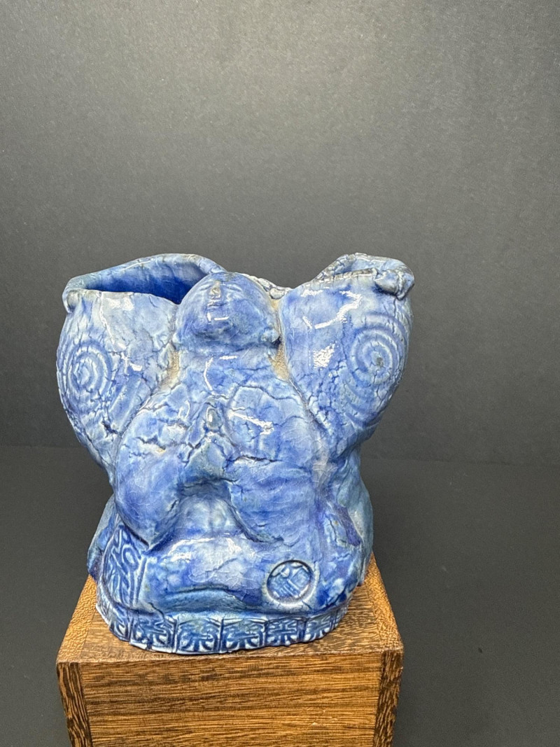 Richard Kirsten‑Daiensai Ceramic Sculpture A hand‑formed ceramic figure by Seattle artist Richard Kirsten‑Daiensai (1920–2013), featuring his signature blend of spiritual symbolism and stylized form. The figure is rendered in deep blue glaze with incised geometric and spiral motifs, echoing the artist’s lifelong engagement with East‑Asian devotional imagery. Compact and contemplative, the piece carries the quiet, meditative presence characteristic of Kirsten’s small sculptural works. A finely detailed miniature painting executed on a natural bone fragment, depicting a lively hillside scene with multiple figures engaged in daily activity. The artist uses vivid color and tight brushwork to create a narrative tableau typical of traditional Asian folk‑art storytelling. The piece is mounted in a rustic wood frame and elevated on a small block stand for display. Art- 8 x 4 x 1.5 Thick sculpture- 4.5 T x 5” fired image, ceramics Hand‑Painted Asian Scene on Bone