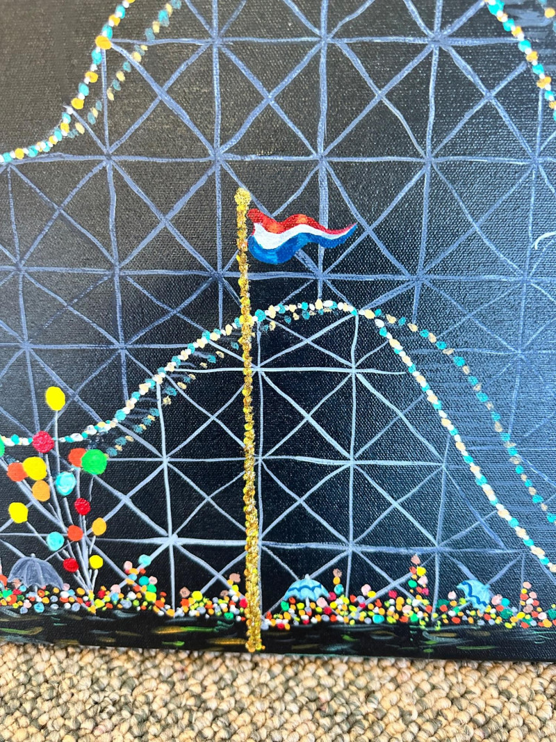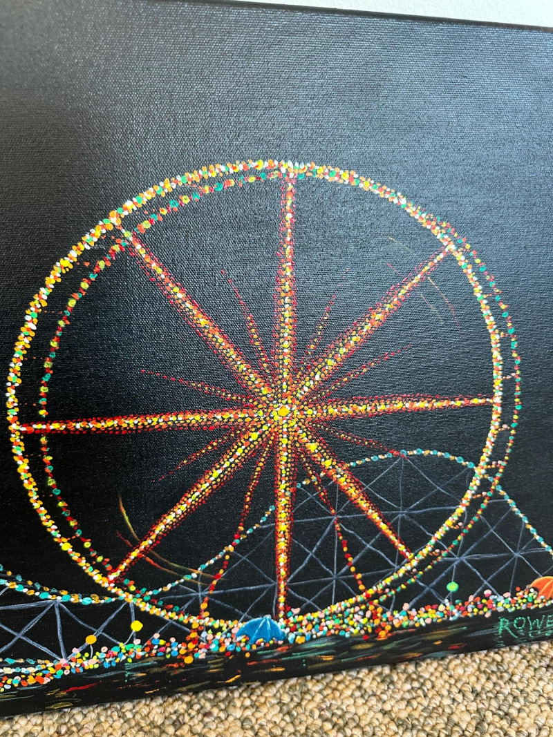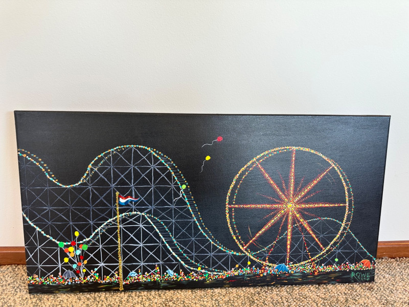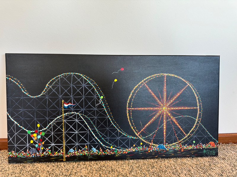 Original acrylic painting by Peggi Rowe capturing a vibrant nighttime carnival scene. The composition features a brightly lit Ferris wheel, sweeping roller‑coaster tracks, floating balloons, and a lively crowd rendered in energetic, multicolored strokes. Rowe’s signature use of bold color and dynamic movement creates a festive, atmospheric depiction of a fairground in motion.