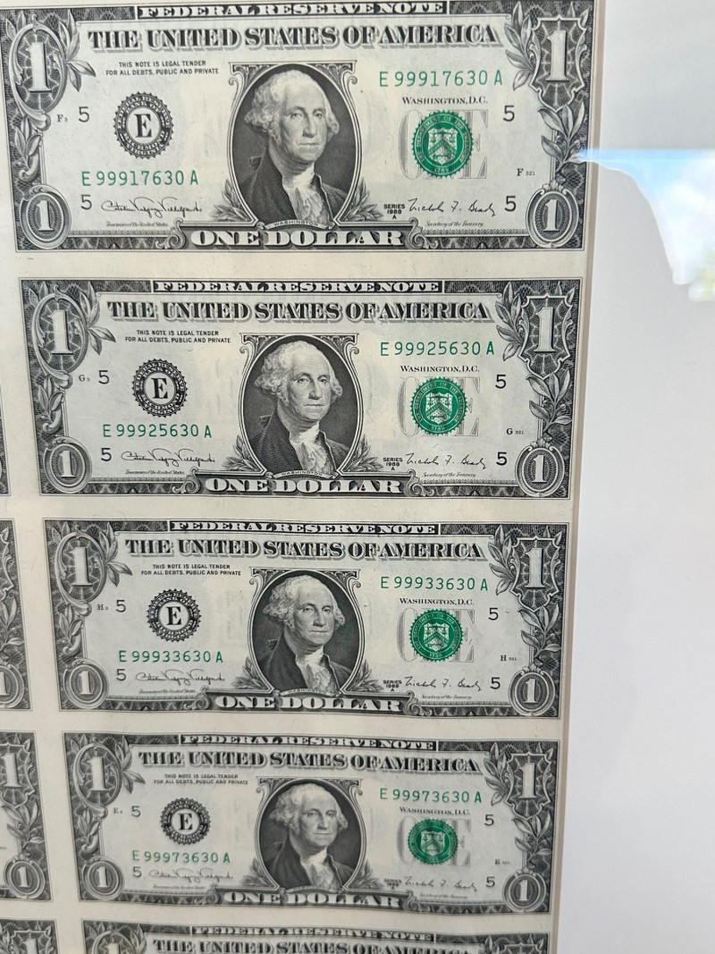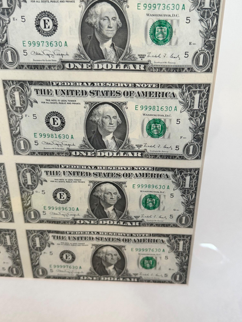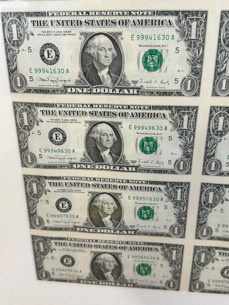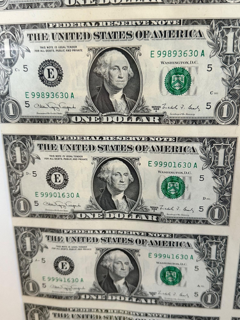 Uncut vertical sheet of four Series 1988A one‑dollar notes from the Richmond (E‑5) Federal Reserve District, featuring sequential high‑range serial numbers. Crisp presentation and ideal for collectors of U.S. currency or BEP‑issued sheets.