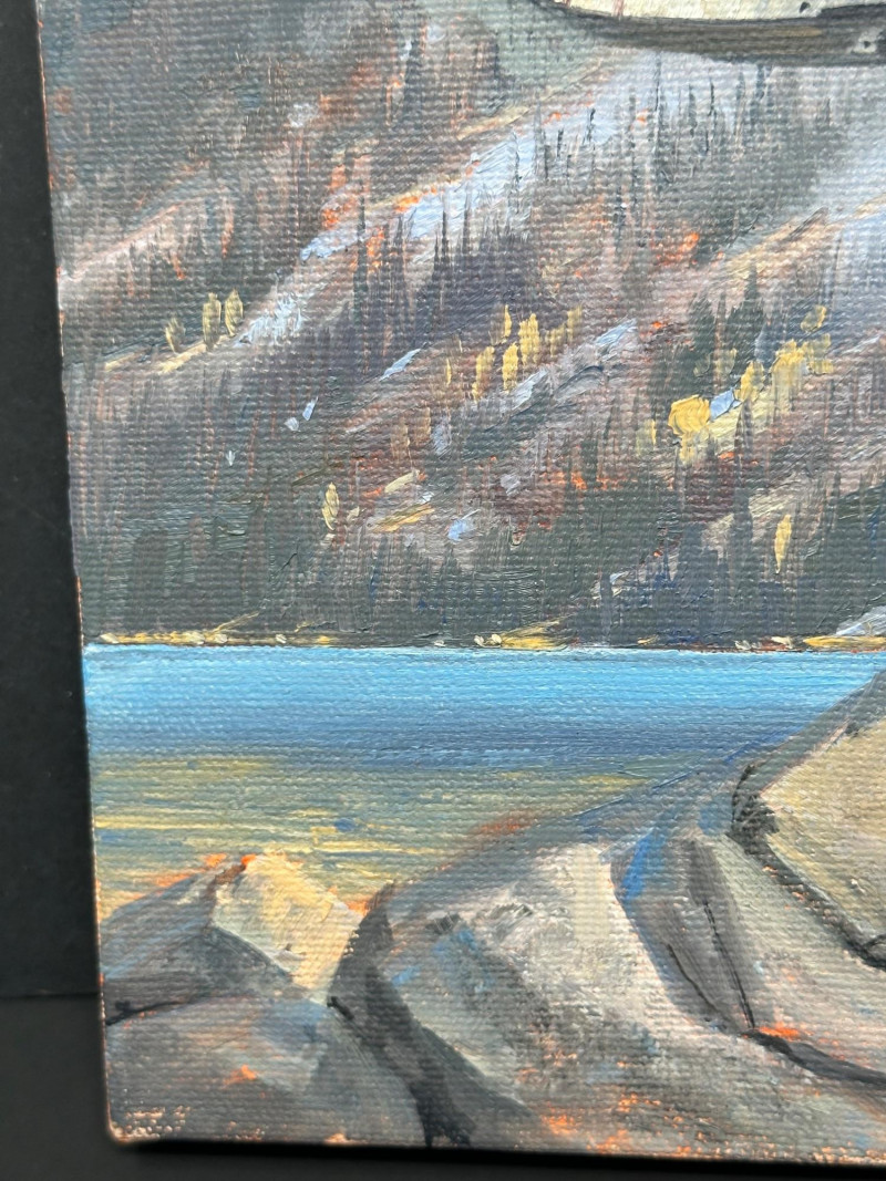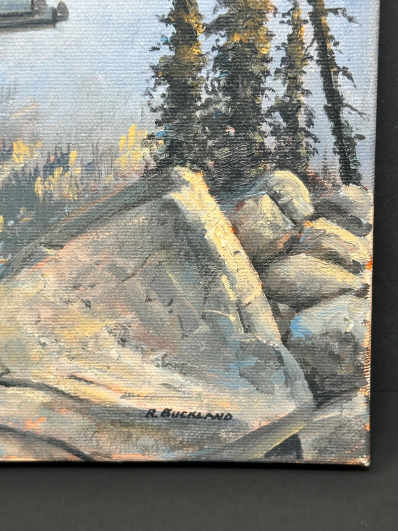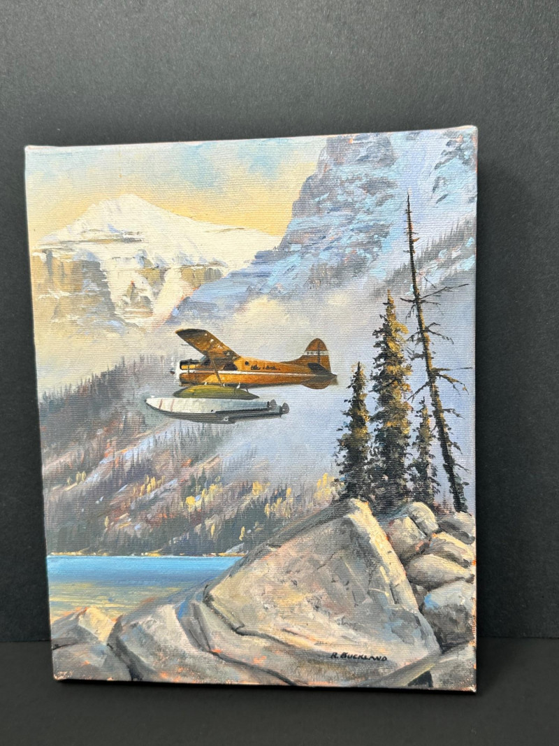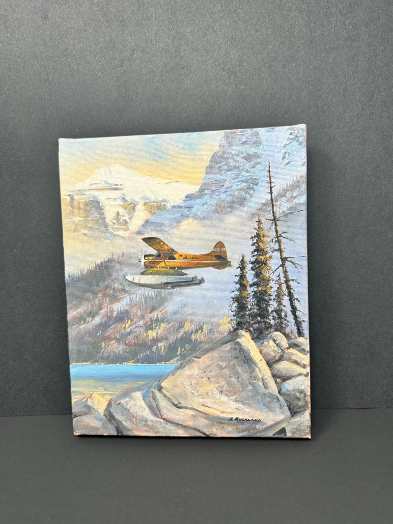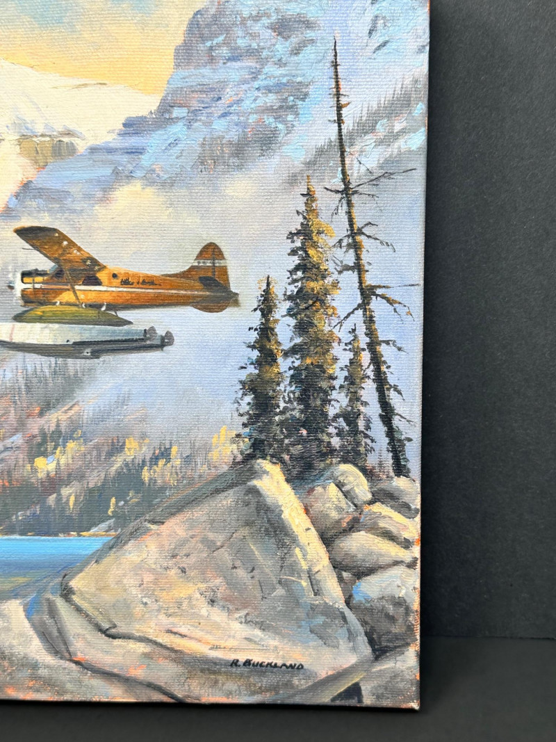 Signed R. Buckland at lower right. Ross Buckland is a Canadian artist known for aviation, wildlife, and wilderness landscape paintings, often featuring floatplanes, rugged terrain, and dramatic skies. His work is widely collected and appears in galleries specializing in Western and aviation art.