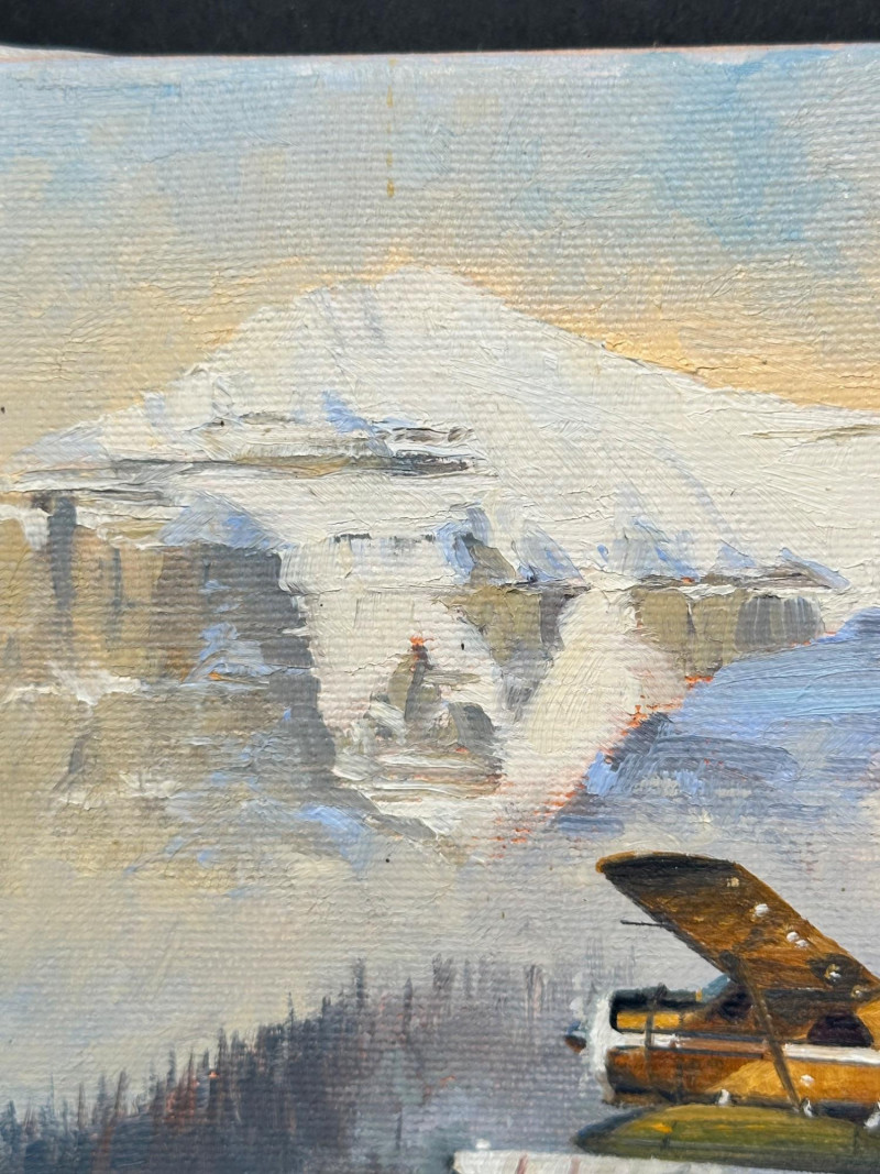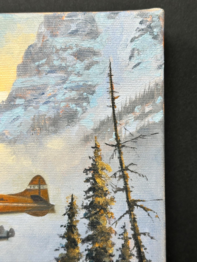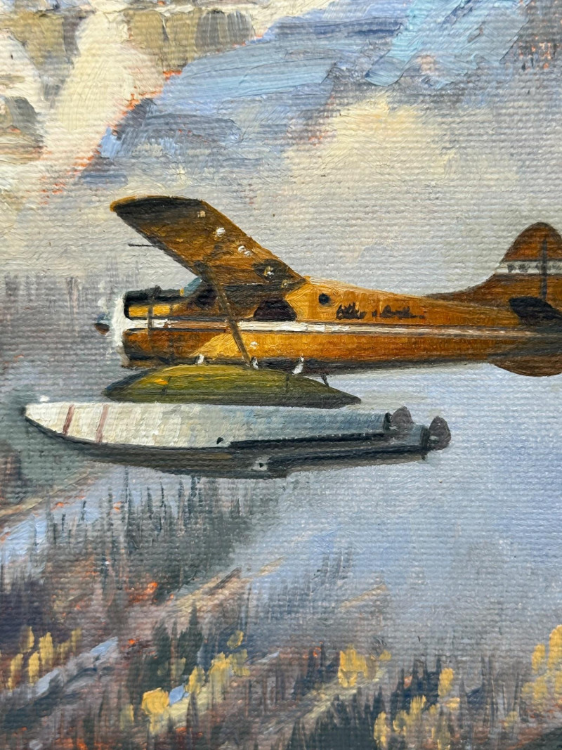 Original acrylic painting by Ross Buckland depicting a floatplane flying over a forested mountain landscape. Snow‑capped peaks rise in the distance, with evergreens and rocky terrain in the foreground. The aircraft is shown in mid‑flight above a lake, capturing a classic Pacific Northwest wilderness scene.
