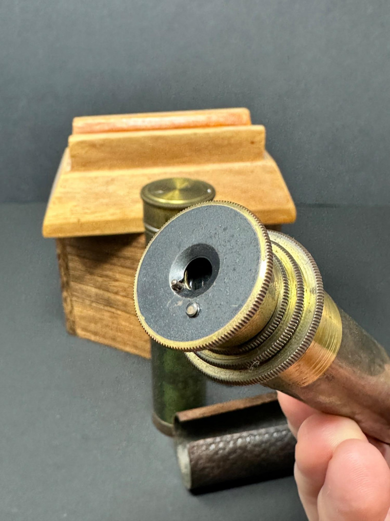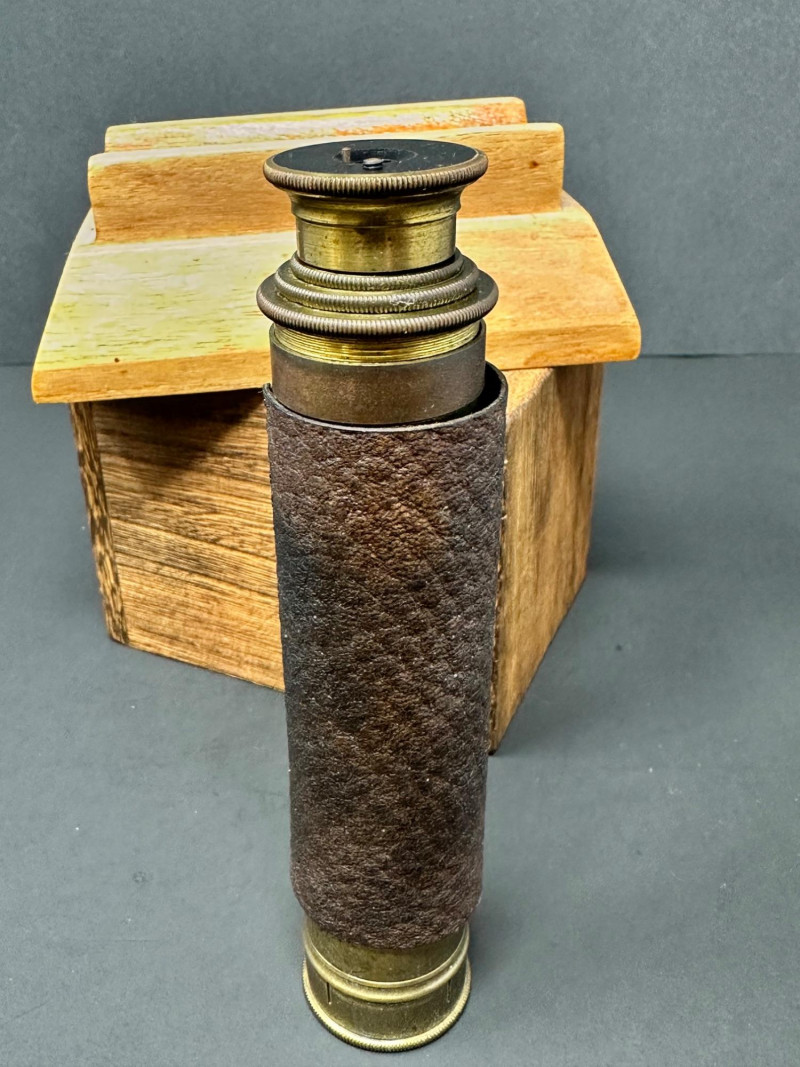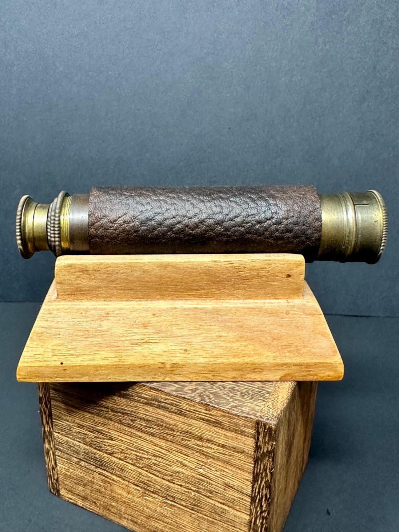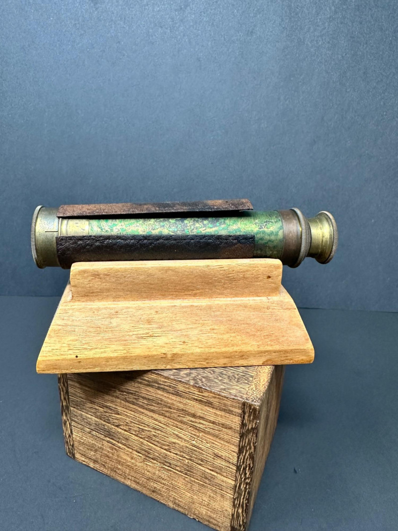 A classic vintage brass barometer with a circular dial displaying atmospheric pressure in millibars, inches of mercury, and centimeters. The face includes traditional weather indicators — Rain, Change, Fair — with a central pointer and clear numeric scales ranging from approximately 950–1050 mb and 28–31 inHg. Housed in a polished brass case with a glass cover, the piece has a warm patina consistent with age. 5 x 3 A compact vintage brass monocular featuring a leather‑wrapped barrel and brass eyepiece and objective ends with knurled detailing. The piece comes with its original wooden stand. 5.5 T Please note-leather wrapping needs to be re-affixed.