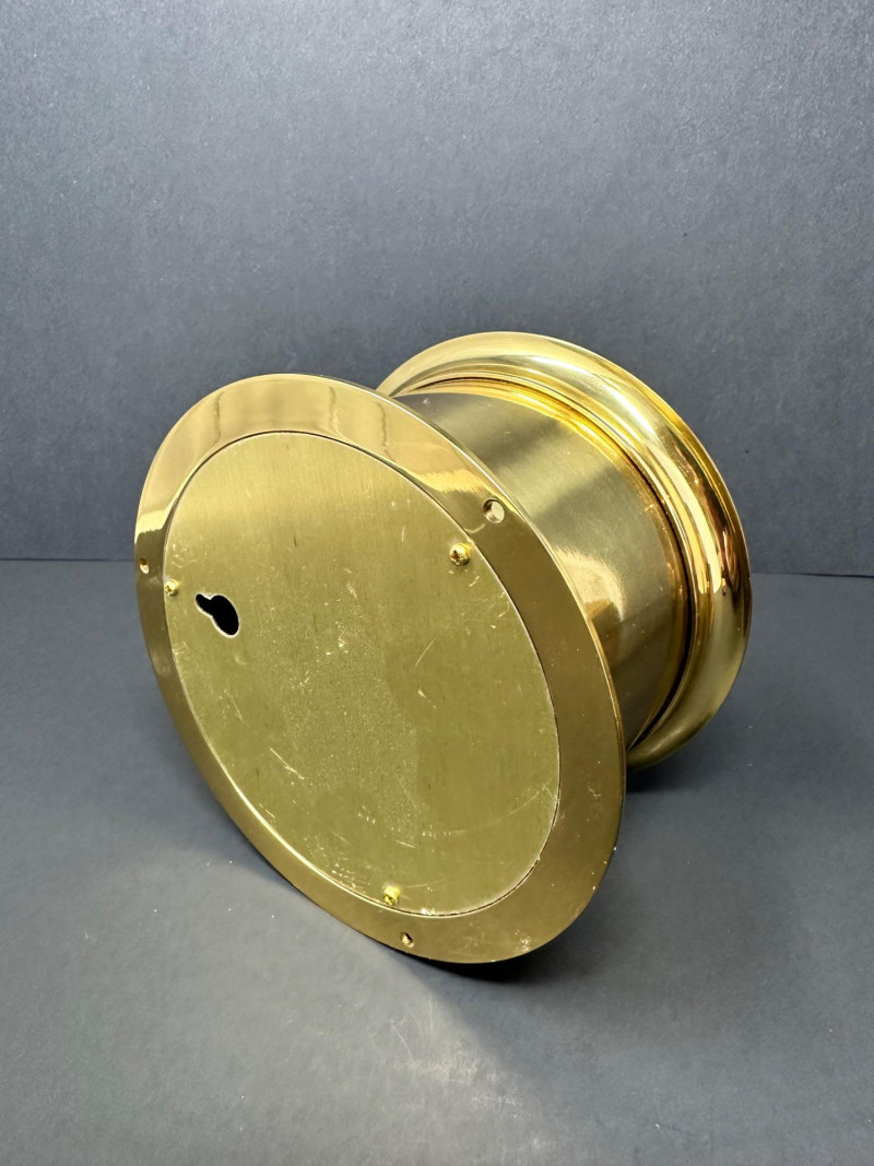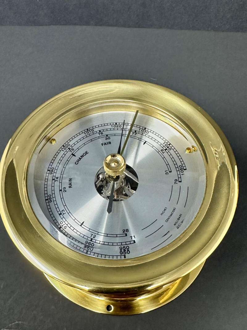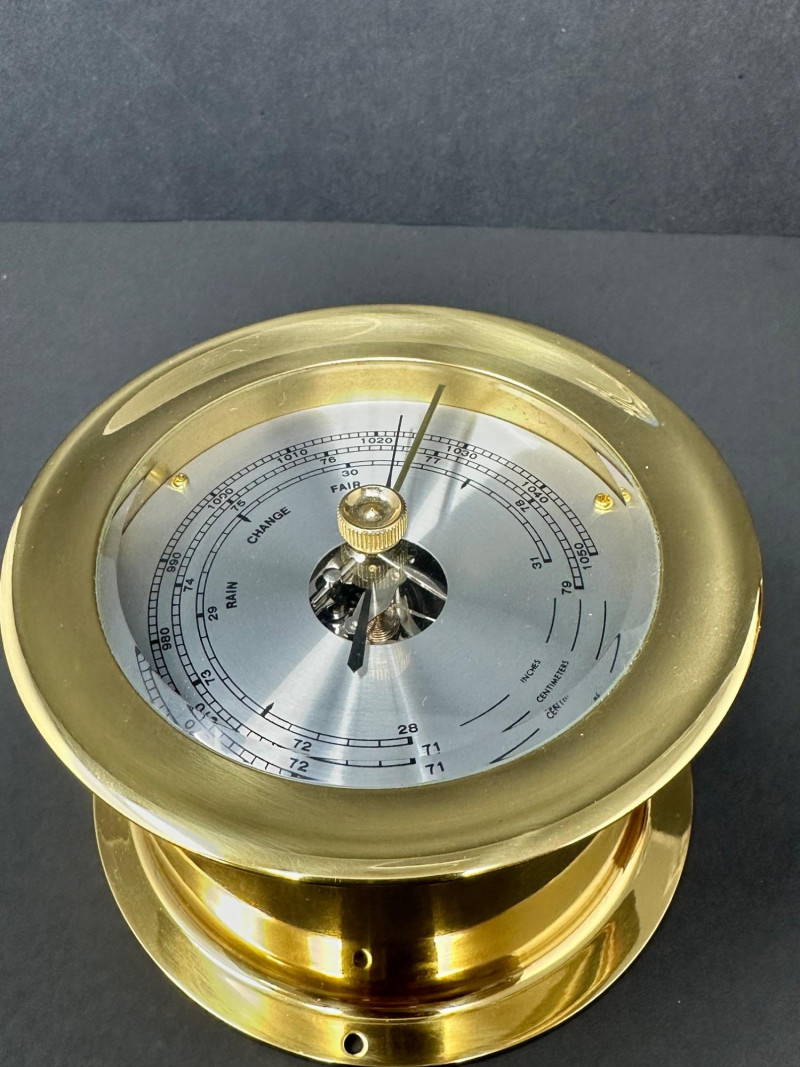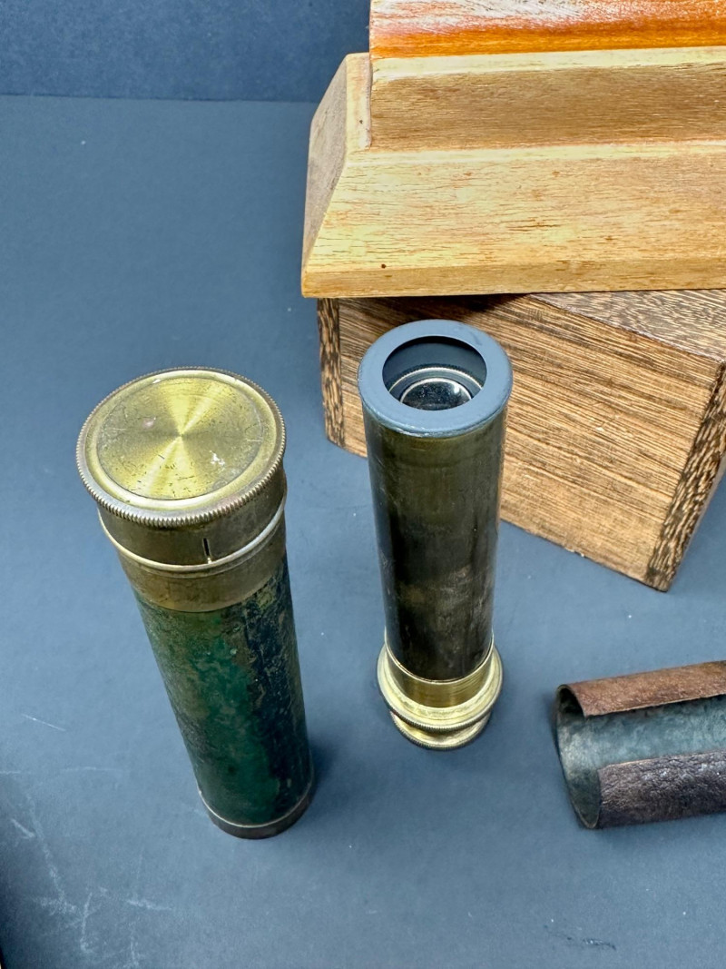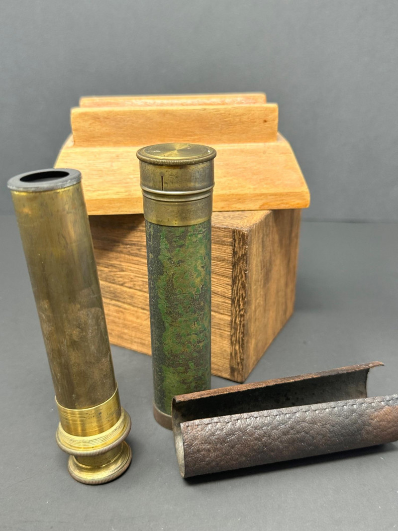 A classic vintage brass barometer with a circular dial displaying atmospheric pressure in millibars, inches of mercury, and centimeters. The face includes traditional weather indicators — Rain, Change, Fair — with a central pointer and clear numeric scales ranging from approximately 950–1050 mb and 28–31 inHg. Housed in a polished brass case with a glass cover, the piece has a warm patina consistent with age. 5 x 3 A compact vintage brass monocular featuring a leather‑wrapped barrel and brass eyepiece and objective ends with knurled detailing. The piece comes with its original wooden stand. 5.5 T Please note-leather wrapping needs to be re-affixed.