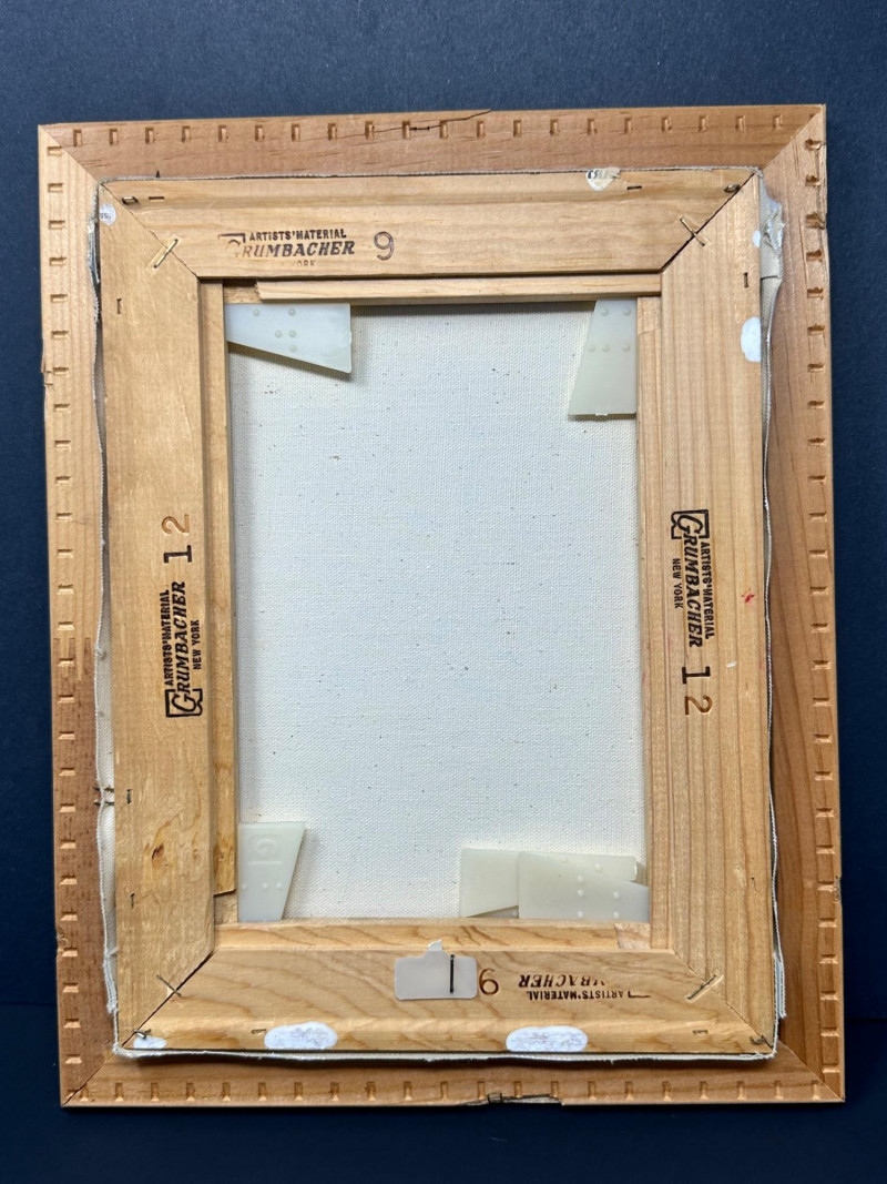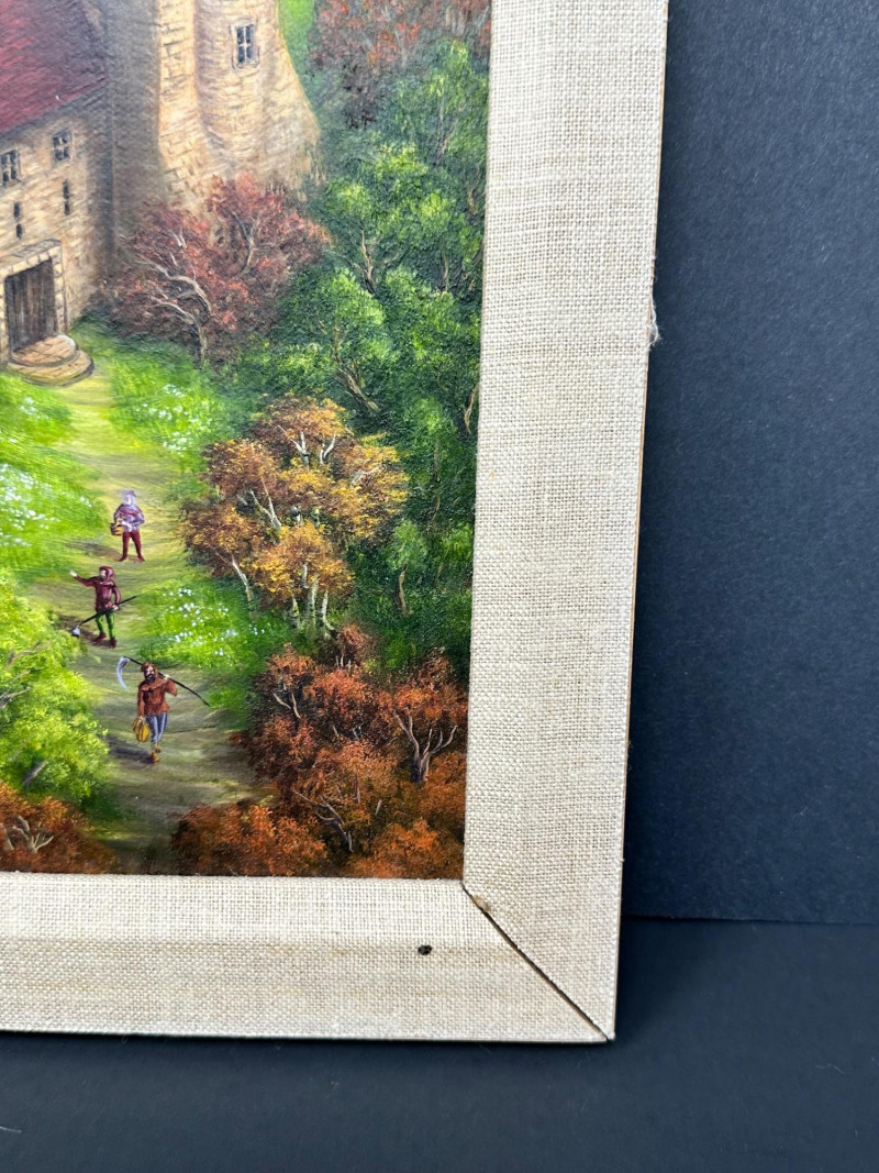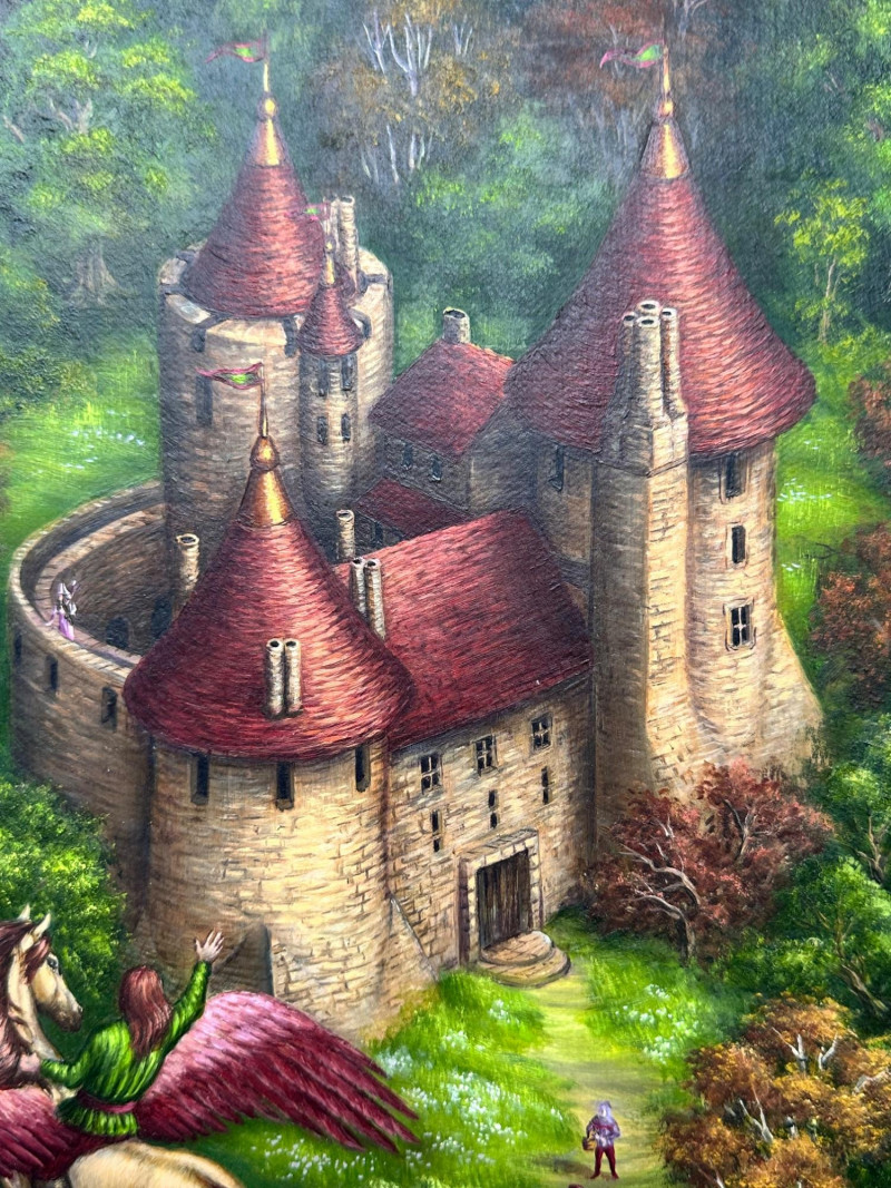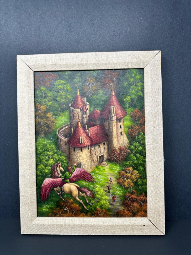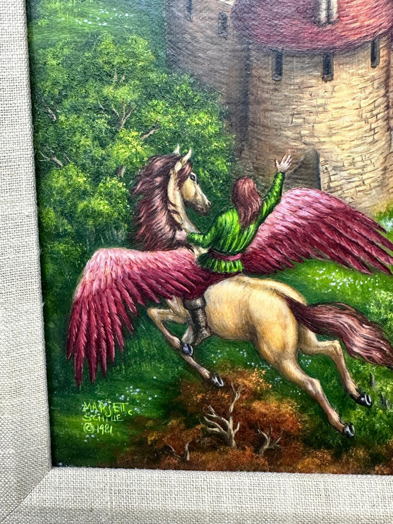 An imaginative 1981 original painting by Marjett Schille, depicting a whimsical fantasy landscape anchored by a stone castle with red turreted roofs rising above a lush forest. In the foreground, a winged horse in flight carries a green‑clad rider, adding movement and mythic energy to the composition. Below, small figures travel along a winding path toward the castle gate, giving the scene narrative depth and a sense of scale. Marjett Schille is a mixed‑media artist known for her vibrant, imaginative works that explore the relationship between humans, animals, and the natural world. Her practice spans acrylic paint pouring, watercolor, ink, and collage, often infused with themes of harmony, mythology, and environmental reverence. She describes her art as a meditation on nature and the creatures we share it with. Schille studied art at Boise State University and earned her MFA from the University of Idaho. Over her career she has exhibited nationally, with her work included in corporate collections in Seattle and shown at institutions such as the Grants Pass Museum of Art’s Gallery One, Woman Made Gallery in Chicago, and Artists for Conservation. She has long been based in the Pacific Northwest, where the region’s landscapes and wildlife continue to influence her visual language.Artist Bio — Marjett Schille (American, b. 20th c.)
