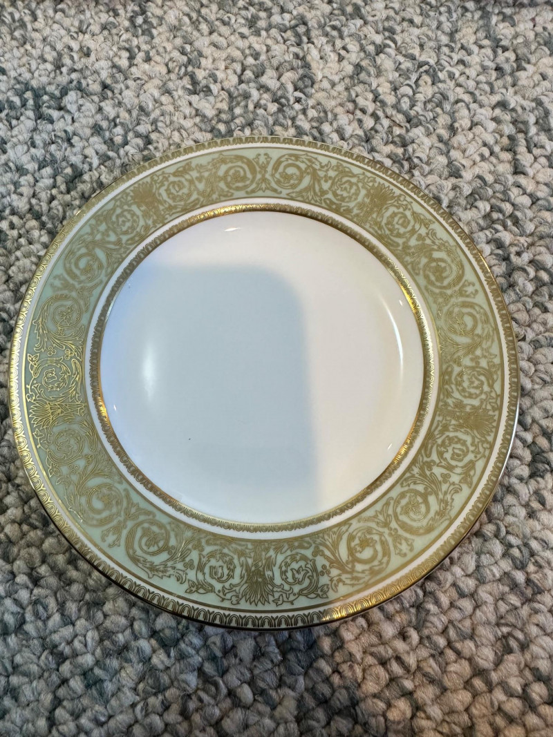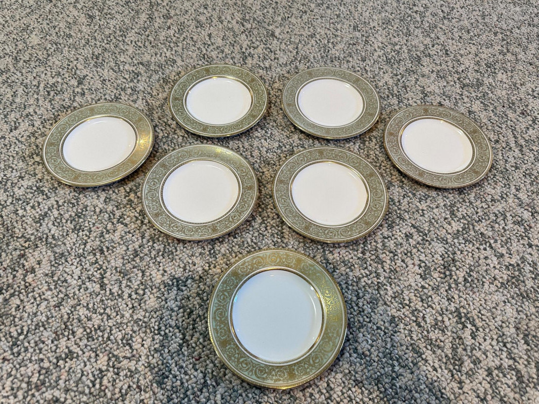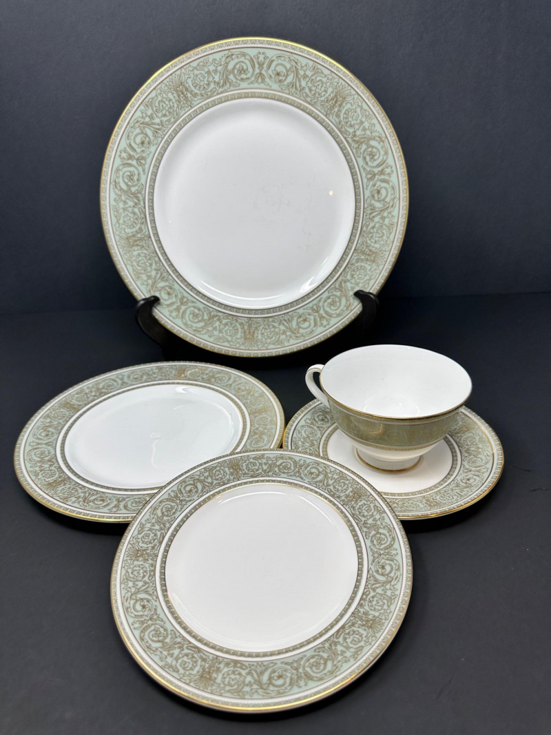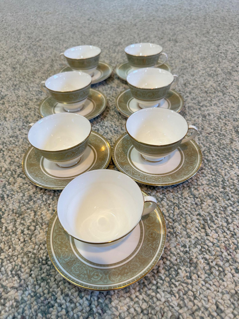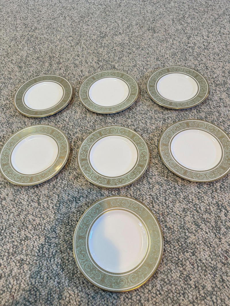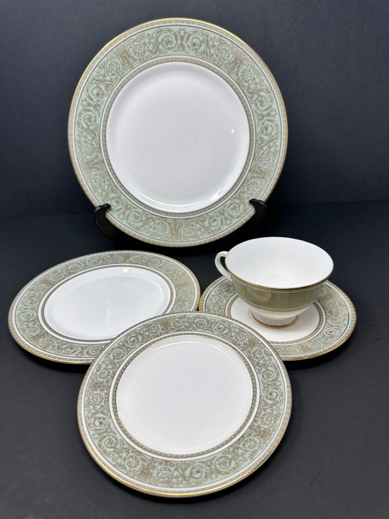 A beautifully coordinated grouping of Royal Doulton “English Renaissance” fine china, featuring the pattern’s signature white centers framed by ornate light‑green borders with intricate gold scrollwork and gilt trim. Classic, formal, and richly detailed, this set presents exceptionally well for display or table use. Includes: Eight (8) dinner plates – 10.5" Seven (7) salad/luncheon plates – 8" Seven (7) bread & butter plates – 6.5" Seven (7) teacups with matching saucers