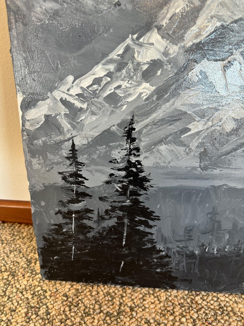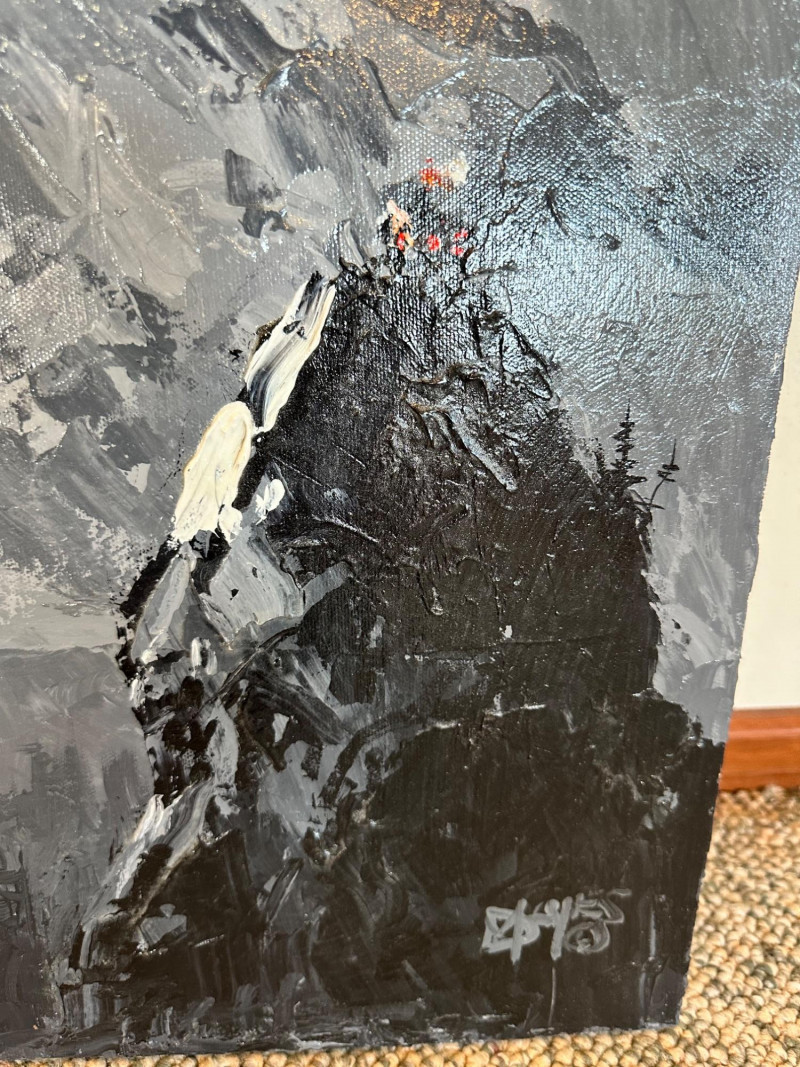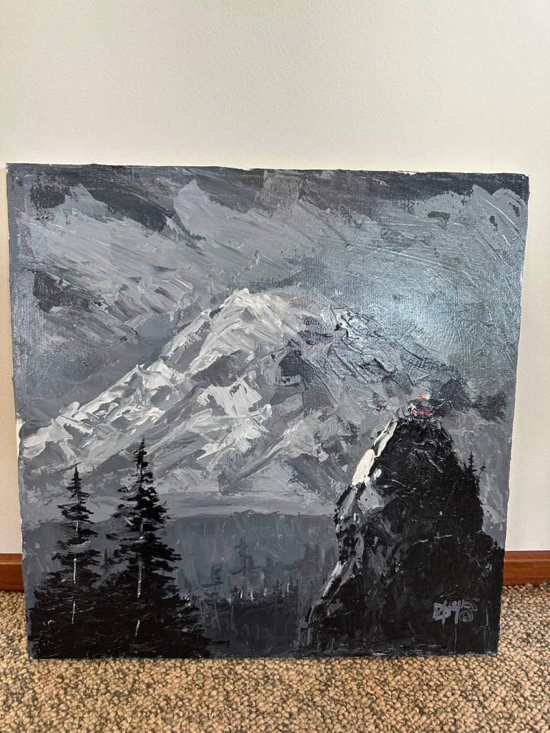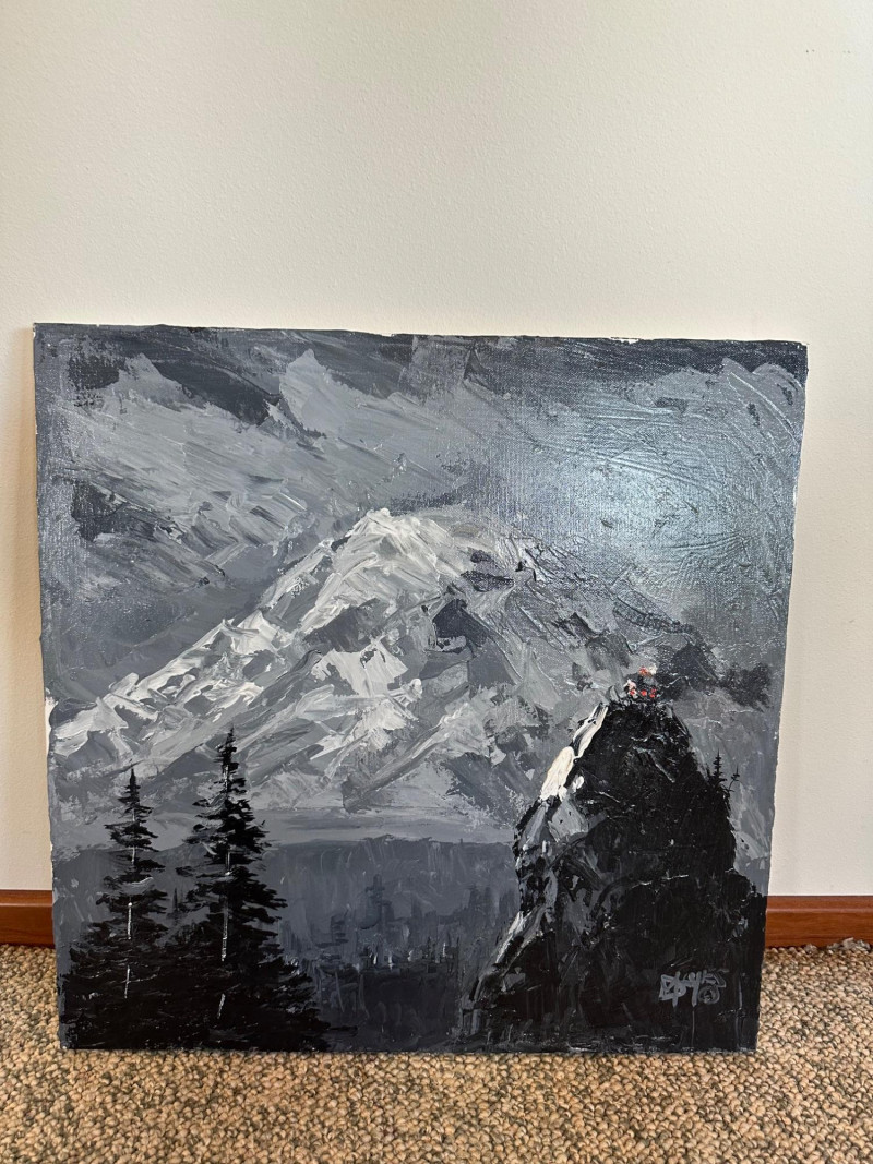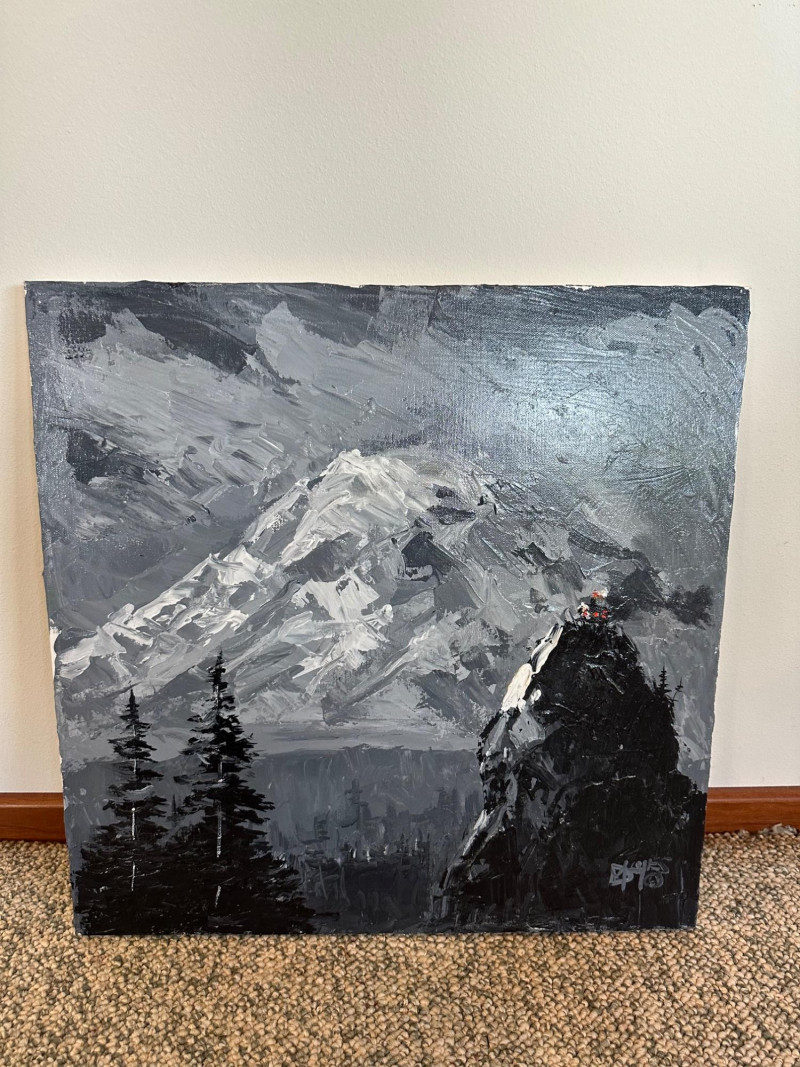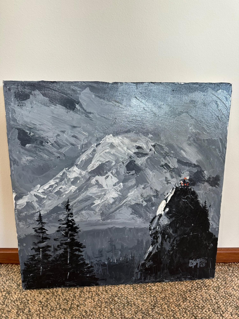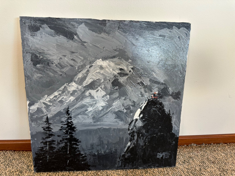 This original Alaska mountain landscape by Danny Mayes pays deliberate tribute to the iconic works of Sidney Laurence, one of Alaska’s most celebrated painters. The composition features a towering, snow‑covered peak rendered with Mayes’ bold, expressive brushwork—crisp whites, deep grays, and dramatic contrasts that echo the grandeur of the far north. In the foreground, dark evergreens rise along the left edge, while two small figures in bright red and orange stand on a rocky outcrop to the right, emphasizing the scale and ruggedness of the terrain. At the very summit of the mountain sits a tiny, imagined cabin—a symbolic detail Mayes uses to suggest a place where Sidney Laurence himself might retreat or “stay from time to time.” This subtle narrative element transforms the painting from a simple landscape into a quiet conversation between two artists across generations. Danny Mayes is a longtime Pacific Northwest painter known for his bold, intuitive brushwork and expressive depictions of regional life. Born in Tacoma, Washington, Mayes originally trained as a boxer before earning a scholarship to the Burnley School of Commercial Art (later the Art Institute of Seattle). There he studied under celebrated Northwest painter William Cumming, whose influence can be seen in Mayes’ energetic linework and confident, gestural style. Working primarily in acrylic and watercolor, Mayes has spent decades painting the people, landscapes, and working vessels of the Northwest and Alaska. His subjects range from street scenes and maritime life to mountain landscapes and portraits of civil rights leaders and Seattle sports figures. His work is known for its immediacy, emotional warmth, and the sense of movement he brings to even the quietest scenes. Mayes exhibited widely from the 1990s through the 2010s, including shows at Kirsten Gallery in Seattle’s University District. His paintings have been collected by the Seattle Seahawks, Seattle Mariners, and numerous corporate and private collectors throughout the region. Today, he remains admired for his ability to capture the spirit of the Northwest — its weather, its working culture, and its dramatic natural beauty — with a style that is unmistakably his own.Artist Bio — Danny Mayes (American, b. 1950s)