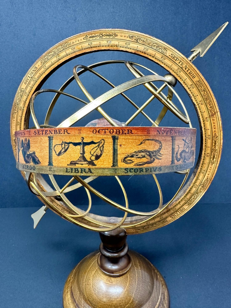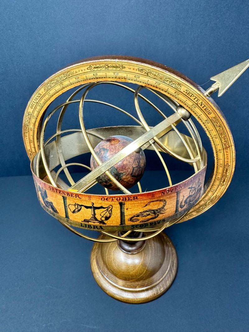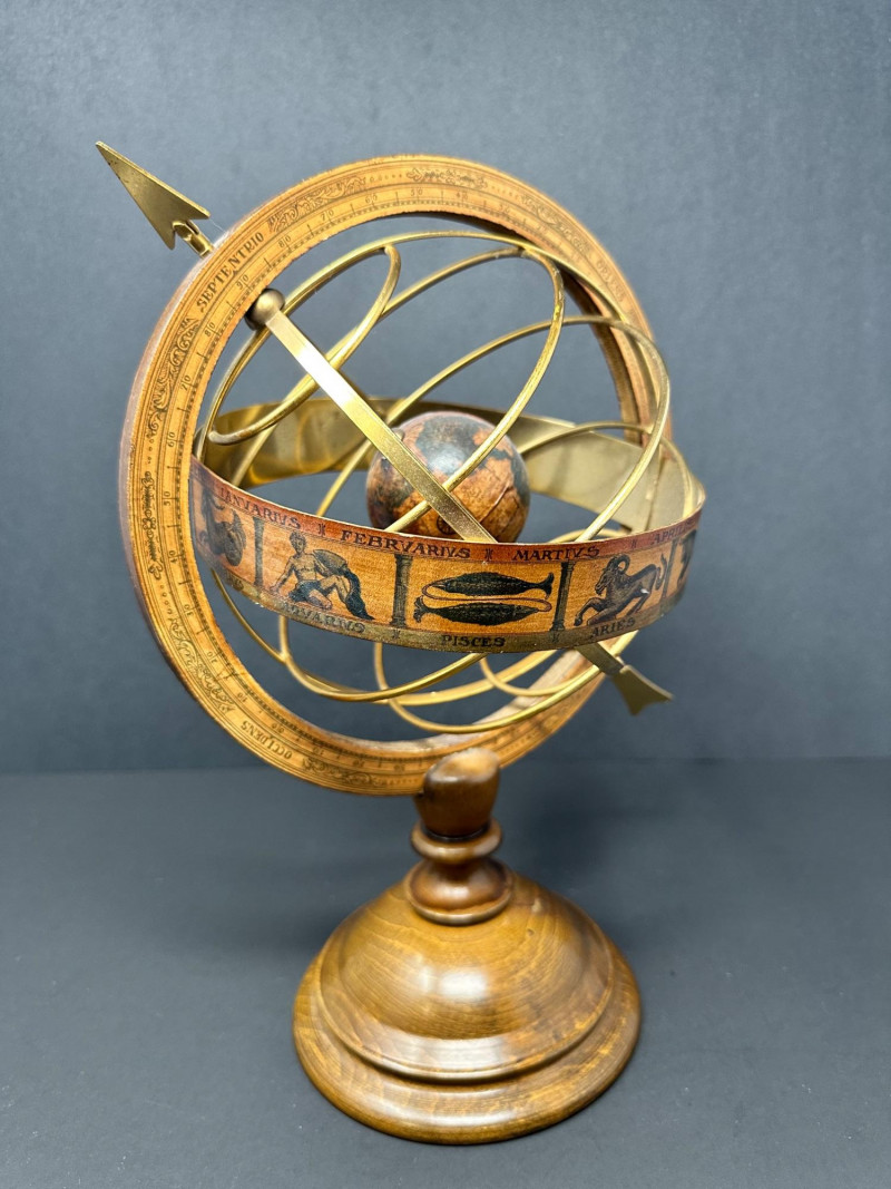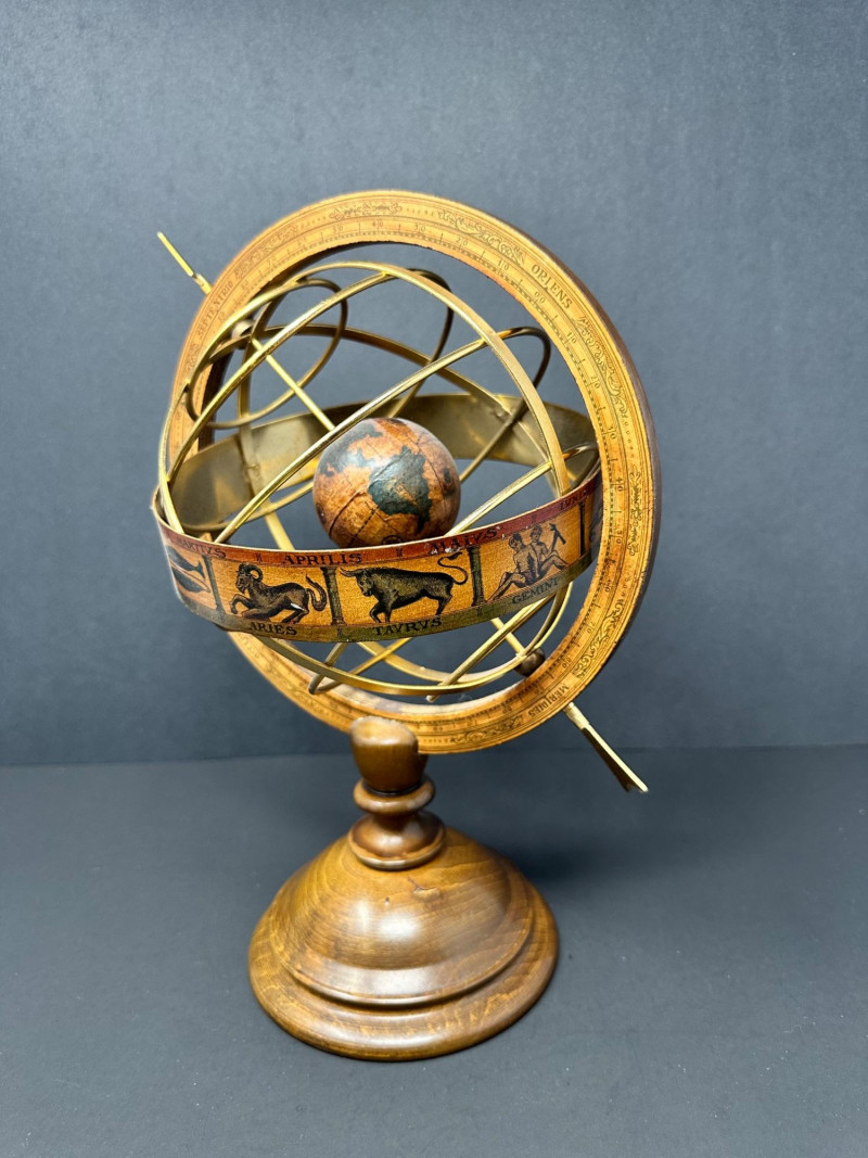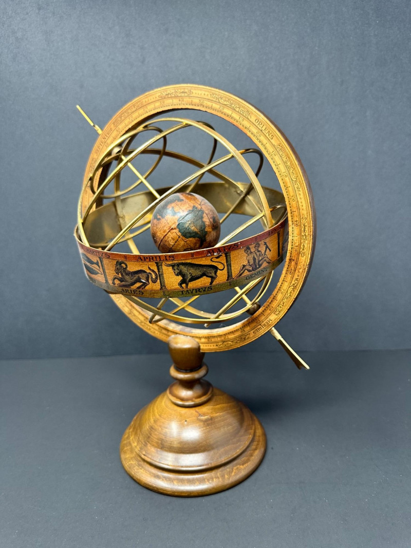 A decorative vintage Olde World–style armillary sphere, made in Italy, featuring a central terrestrial globe surrounded by brass‑tone rings representing celestial circles. One ring is decorated with zodiac signs and month markings (Aries, Taurus, Gemini, Aprilis, etc.), adding classic Renaissance‑inspired detail. Mounted on a wood base. 13 x 9