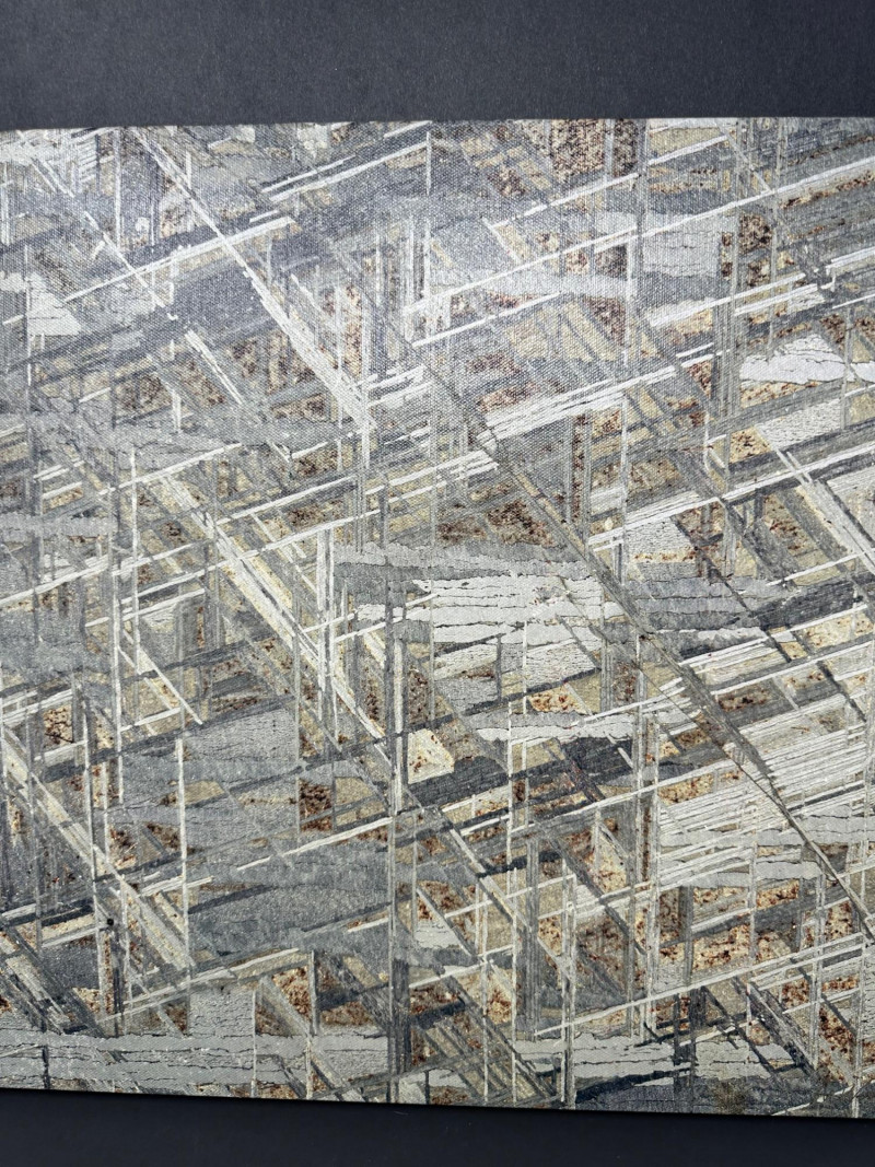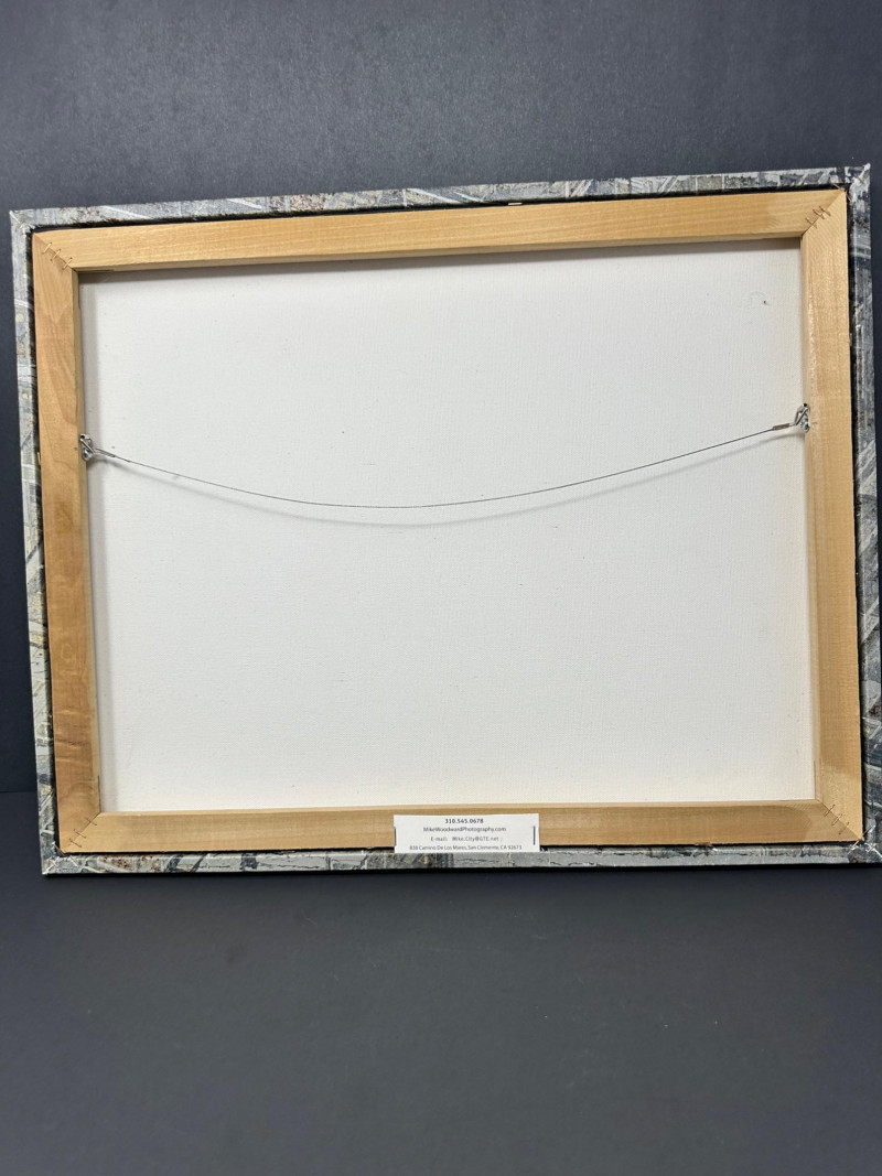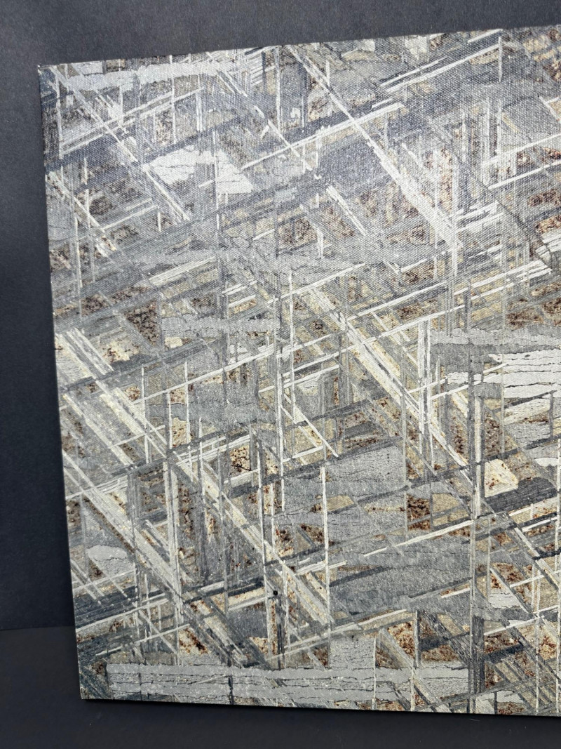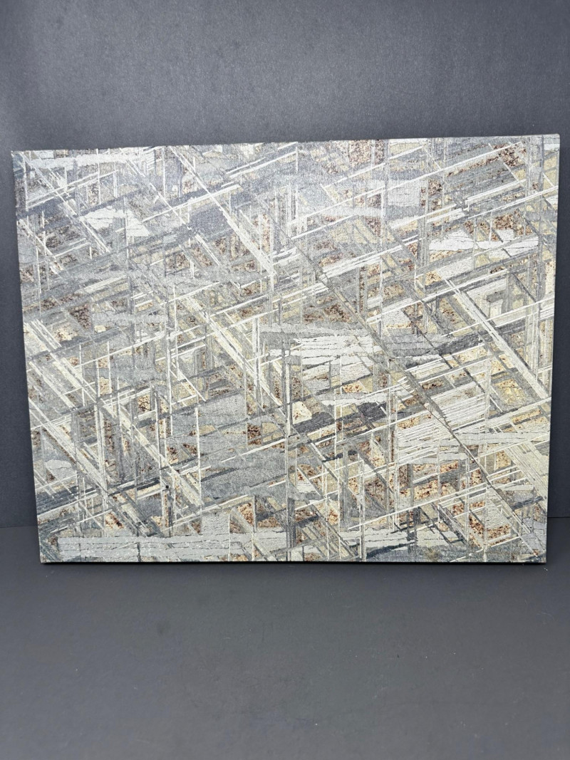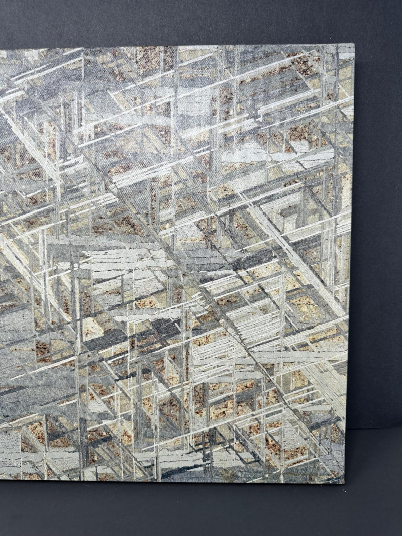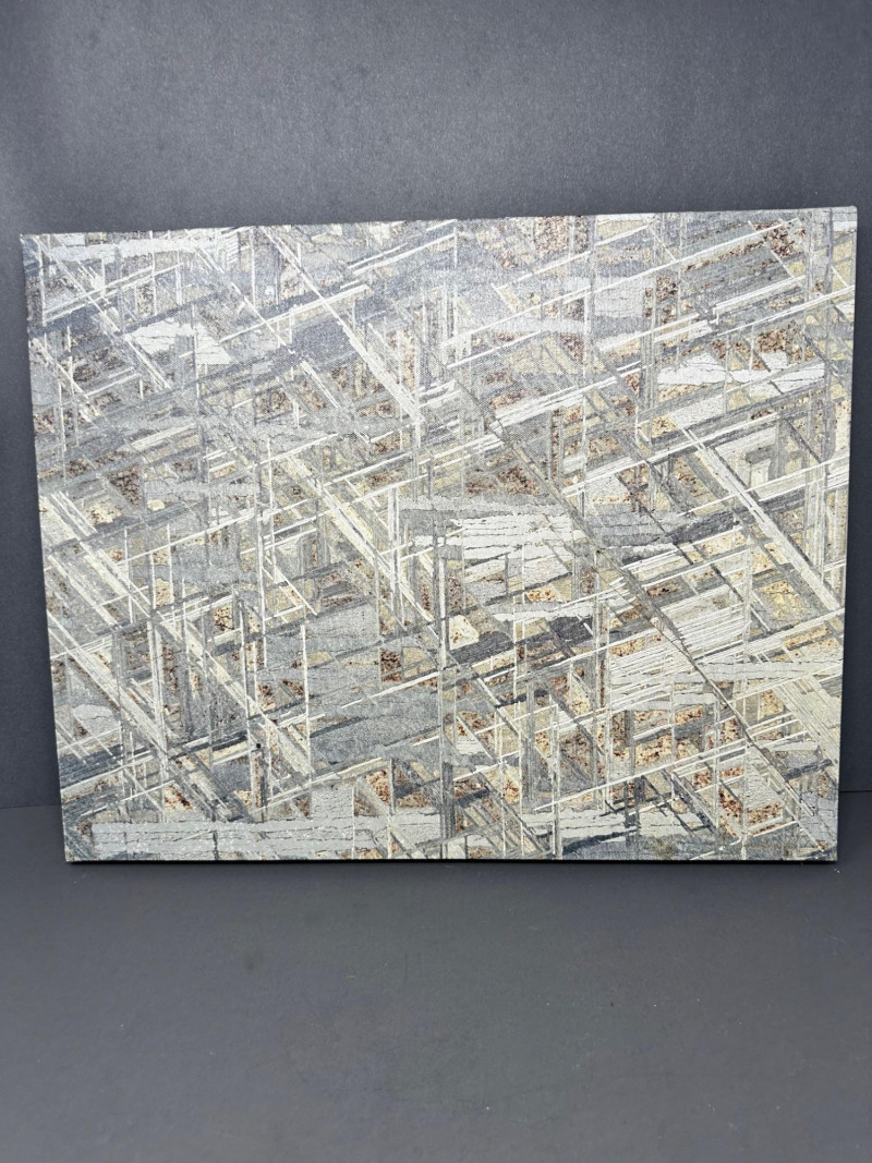 A striking original photographic work by Mike Woodward, capturing the intricate structural pattern of a meteorite in dramatic detail. The composition is dense with intersecting lines, angular forms, and metallic textures—an abstract, almost architectural view created by the natural crystalline structure within the meteorite itself. Woodward’s close‑focus approach transforms the specimen into a visually complex landscape of geometry and shadow. Subtle tones of gray, white, and muted earth colors create depth and dimension, giving the image a sculptural presence. The result is a compelling fusion of science and fine art, highlighting the extraterrestrial origins of the material while presenting it through a contemporary, design‑forward lens. Mike Woodard is a contemporary photographer known for his striking macro and structural studies of meteorites, minerals, and natural formations. His work sits at the intersection of science and fine art, transforming extraterrestrial and geological specimens into visually compelling abstract compositions. Through extreme close‑focus photography, Woodard reveals the hidden architecture within meteorites—crystalline lattices, etched metallic patterns, and geometric structures that are normally invisible to the naked eye.Artist Bio — Mike Woodard (American, Contemporary)
