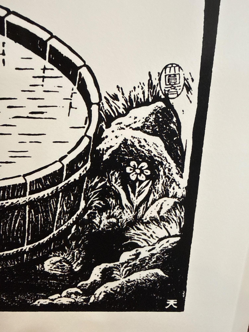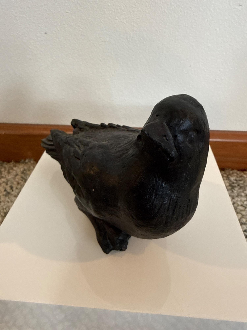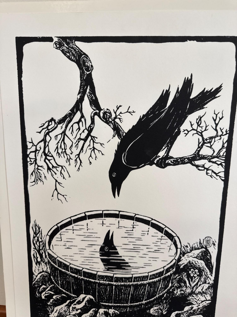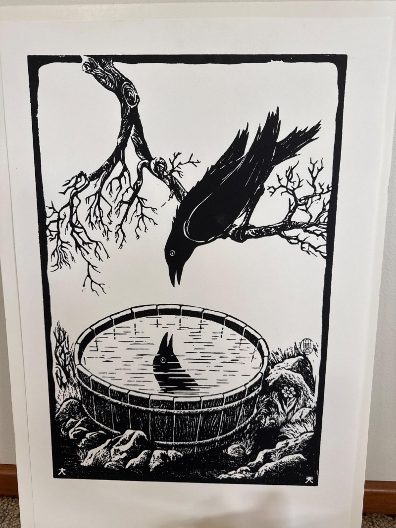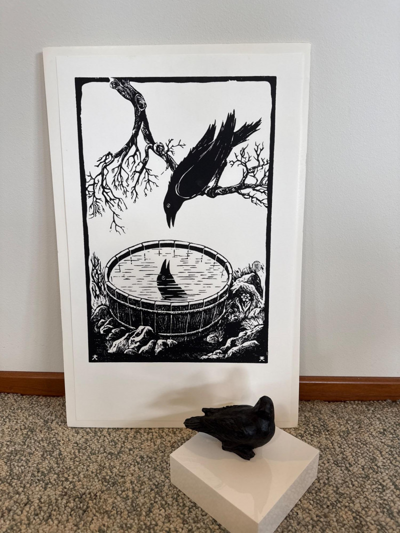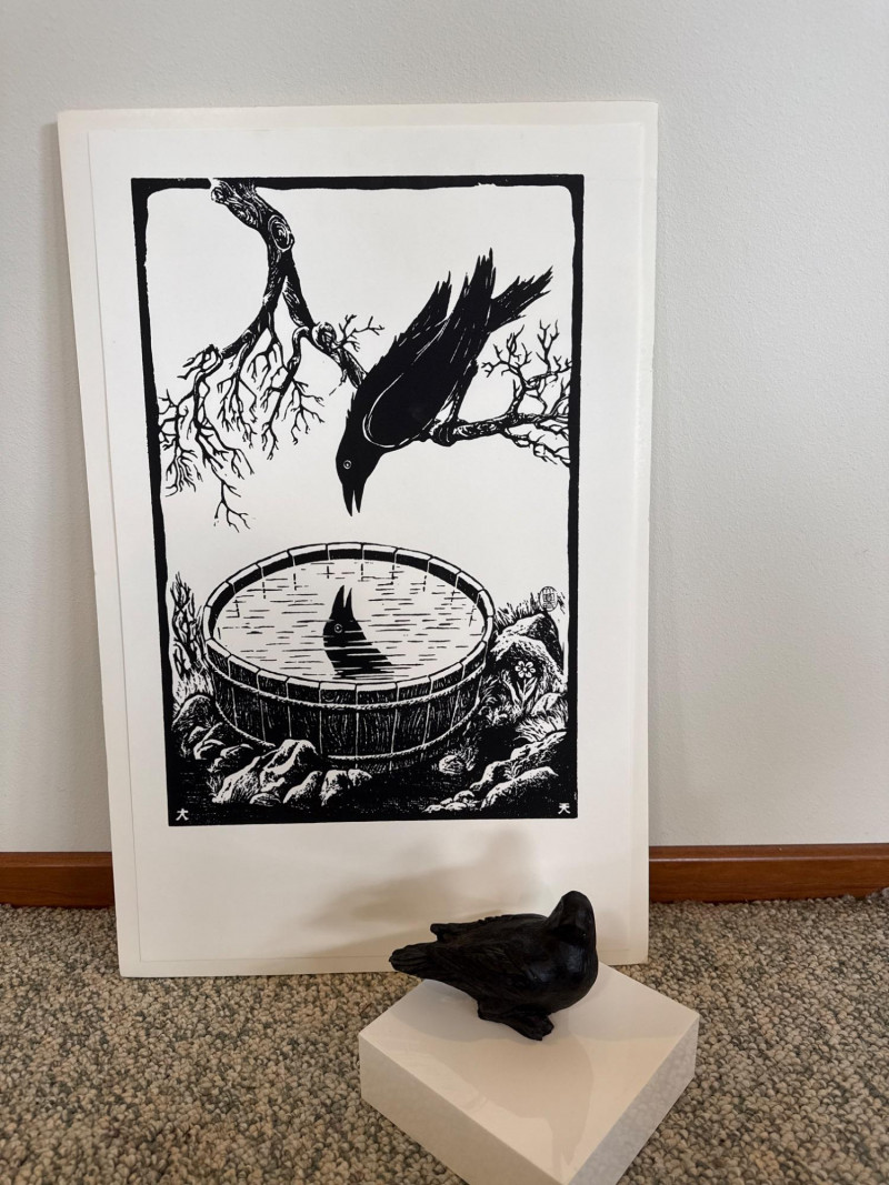 This lot features a black‑and‑white crow print attributed to Richard Kirsten‑Daiensai, presented in a bold graphic style typical of his mid‑century work. The composition shows a solitary crow perched on a branch, gazing into a water‑filled barrel where its reflection appears—an image that echoes Kirsten’s recurring themes of contemplation, nature, and quiet symbolism. The print is not signed. Accompanying the print is a small hand‑formed clay crow sculpture, unsigned and by an unknown artist. The piece has a rustic, folk‑art presence and pairs naturally with the print, creating a cohesive crow‑themed display.