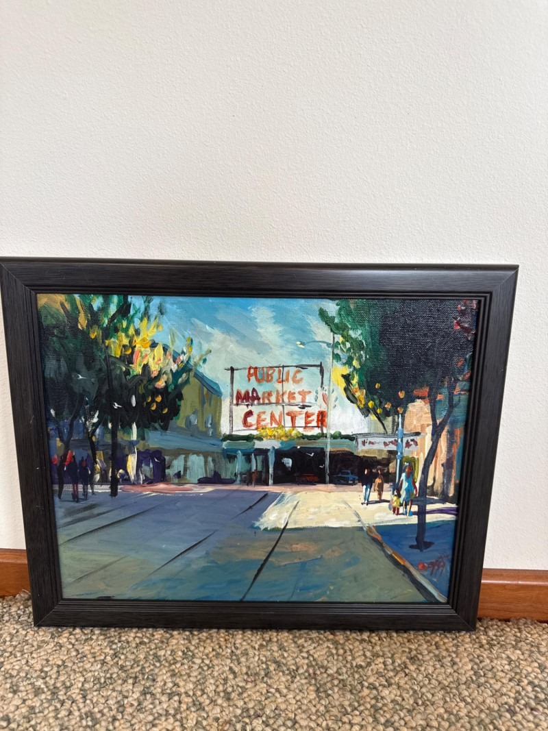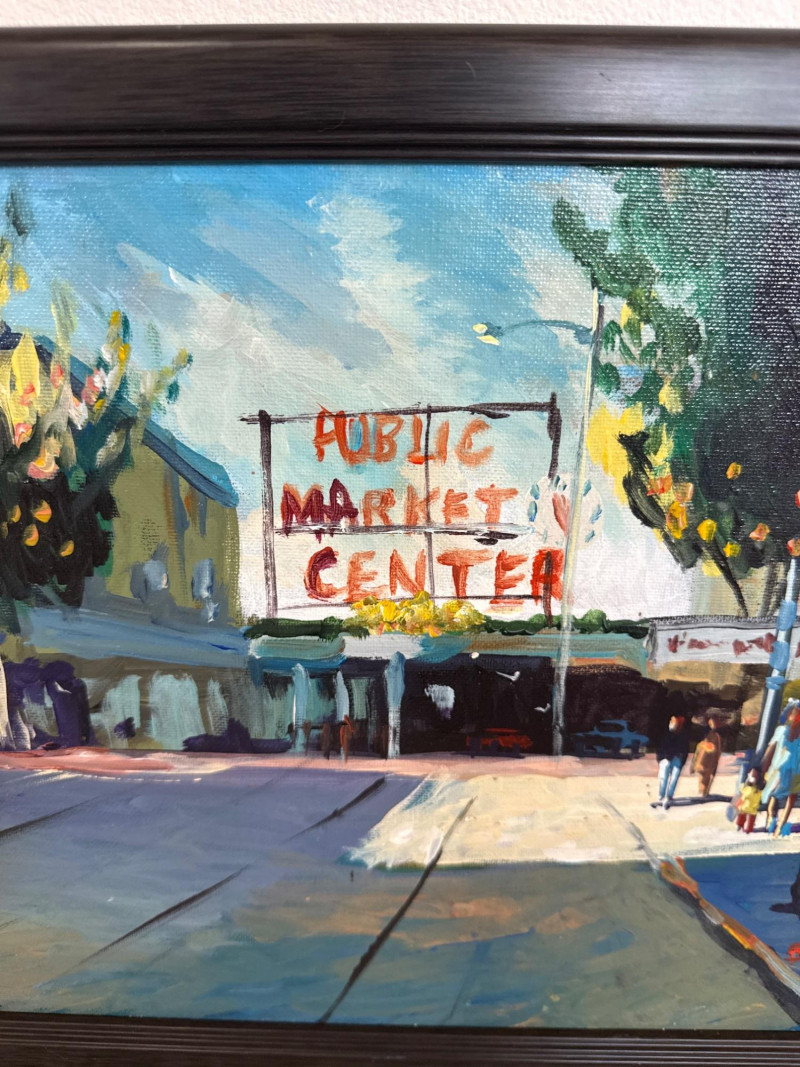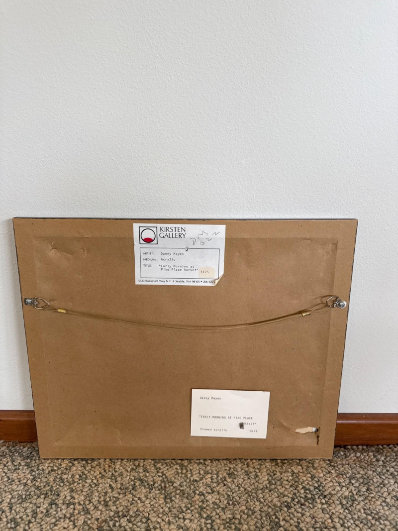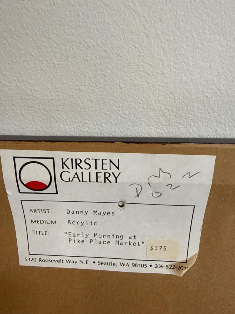 This vibrant acrylic painting captures the quiet, glowing stillness of Pike Place Market at daybreak, long before the crowds arrive. Mayes paints the iconic Public Market Center sign in warm red tones that cut through the cool morning shadows, anchoring the composition with a sense of place instantly recognizable to Seattle collectors. The street is rendered with Mayes’ signature gestural brushwork—loose, confident strokes that suggest movement even in a moment of calm. Figures drift through the scene in soft silhouette, and the trees lining the street cast long, early‑morning shadows that stretch across the pavement. The palette is classic Mayes: rich color, lively contrasts, and a sense of Northwest atmosphere that feels both familiar and nostalgic. Danny Mayes is a Pacific Northwest painter known for his bold, intuitive brushwork and expressive depictions of regional life. Born in Tacoma, Washington, he originally trained as a boxer before earning a scholarship to the Burnley School of Commercial Art (later the Art Institute of Seattle). There he studied under Northwest master William Cumming, whose influence can be seen in Mayes’ gestural linework and dynamic compositions. Working primarily in acrylic and watercolor, Mayes paints street scenes, maritime subjects, Alaska and Northwest landscapes, and character‑driven portraits. His work has been collected by the Seattle Seahawks, Seattle Mariners, and numerous corporate and private collectors. He exhibited widely from the 1990s through the 2010s, including shows at Kirsten Gallery in Seattle’s University District.Artist Bio — Danny Mayes (American, b. 1950s)