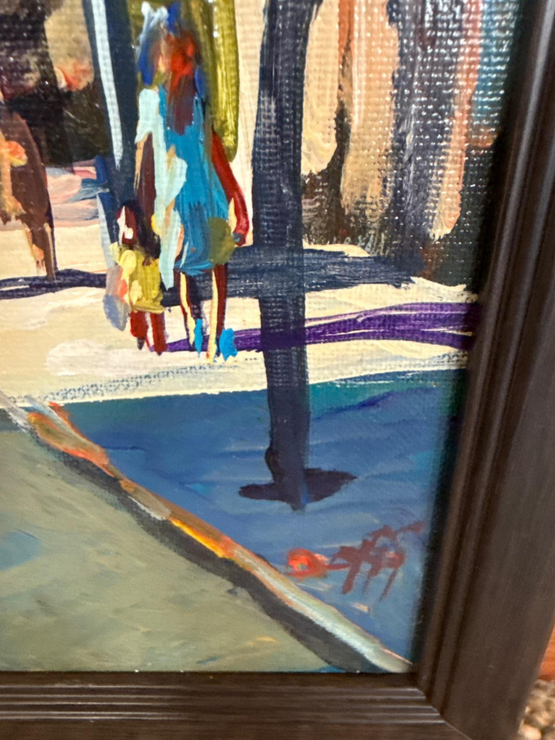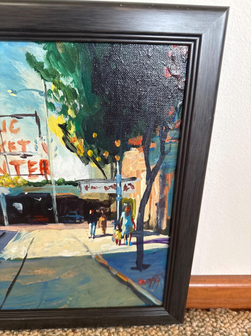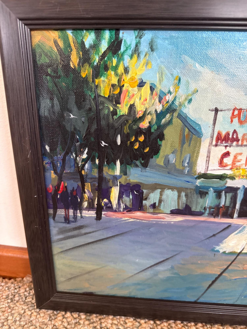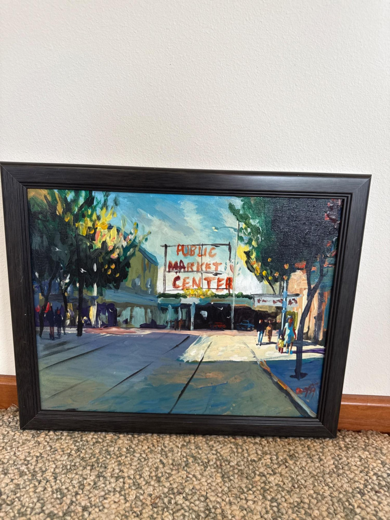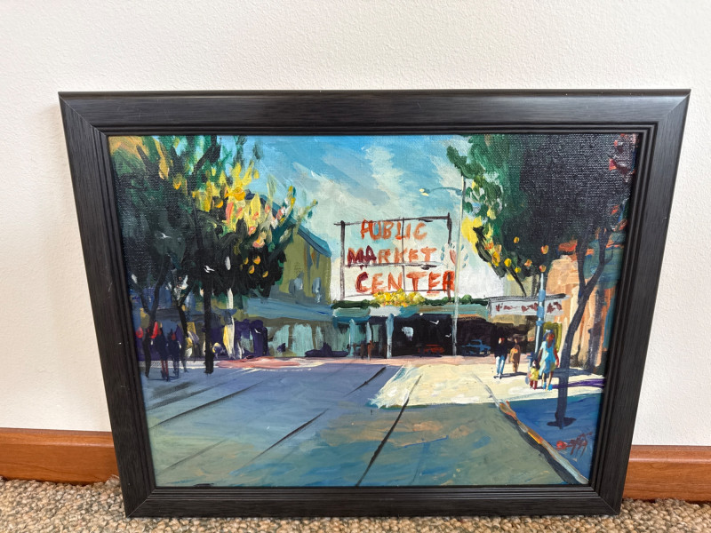 This vibrant acrylic painting captures the quiet, glowing stillness of Pike Place Market at daybreak, long before the crowds arrive. Mayes paints the iconic Public Market Center sign in warm red tones that cut through the cool morning shadows, anchoring the composition with a sense of place instantly recognizable to Seattle collectors. The street is rendered with Mayes’ signature gestural brushwork—loose, confident strokes that suggest movement even in a moment of calm. Figures drift through the scene in soft silhouette, and the trees lining the street cast long, early‑morning shadows that stretch across the pavement. The palette is classic Mayes: rich color, lively contrasts, and a sense of Northwest atmosphere that feels both familiar and nostalgic. Danny Mayes is a Pacific Northwest painter known for his bold, intuitive brushwork and expressive depictions of regional life. Born in Tacoma, Washington, he originally trained as a boxer before earning a scholarship to the Burnley School of Commercial Art (later the Art Institute of Seattle). There he studied under Northwest master William Cumming, whose influence can be seen in Mayes’ gestural linework and dynamic compositions. Working primarily in acrylic and watercolor, Mayes paints street scenes, maritime subjects, Alaska and Northwest landscapes, and character‑driven portraits. His work has been collected by the Seattle Seahawks, Seattle Mariners, and numerous corporate and private collectors. He exhibited widely from the 1990s through the 2010s, including shows at Kirsten Gallery in Seattle’s University District.Artist Bio — Danny Mayes (American, b. 1950s)