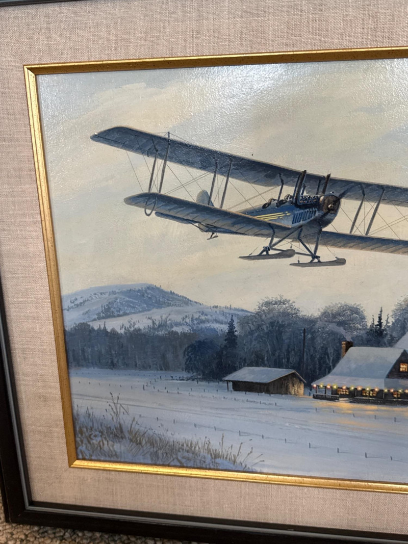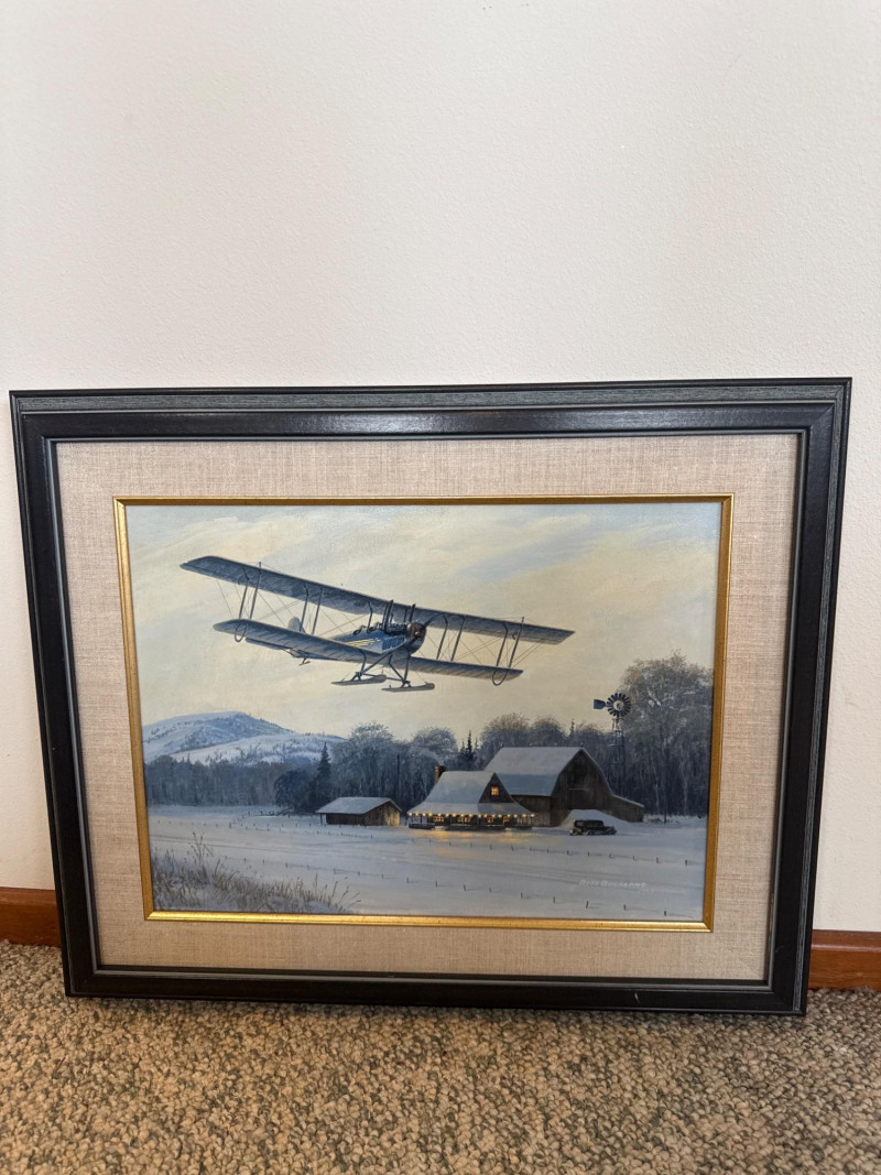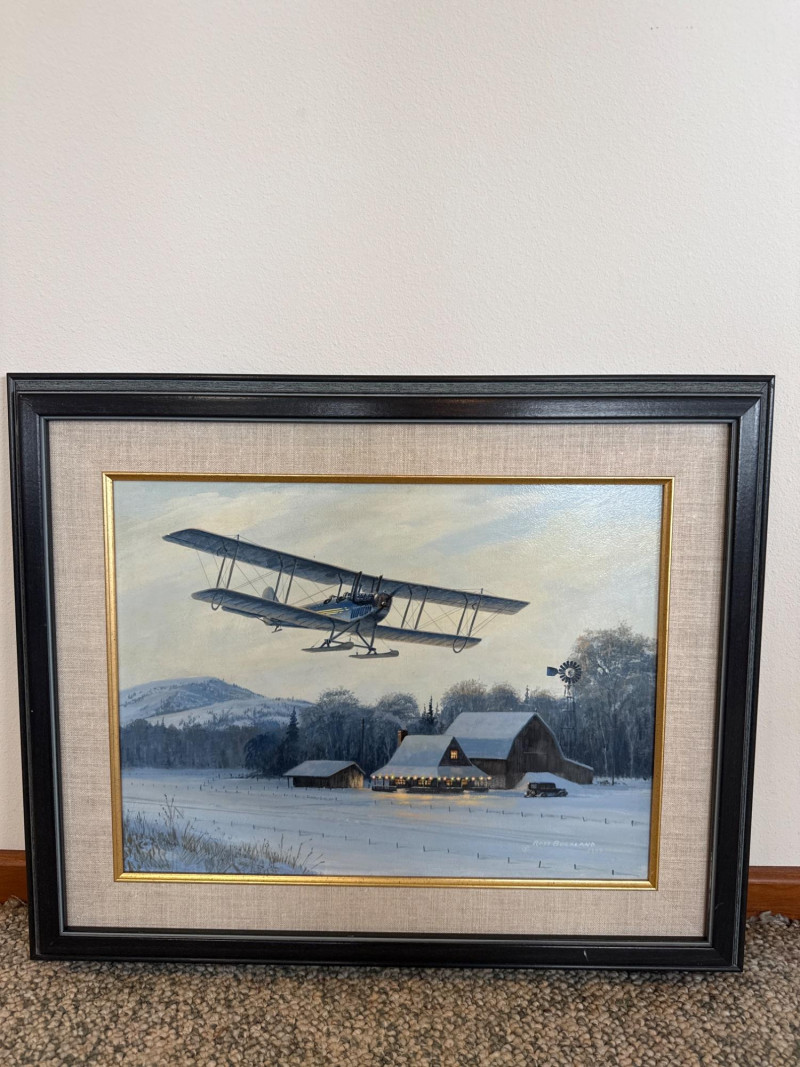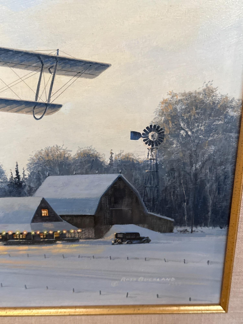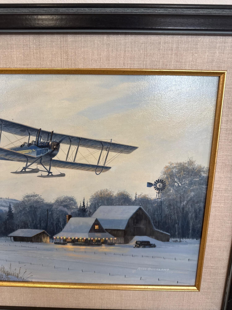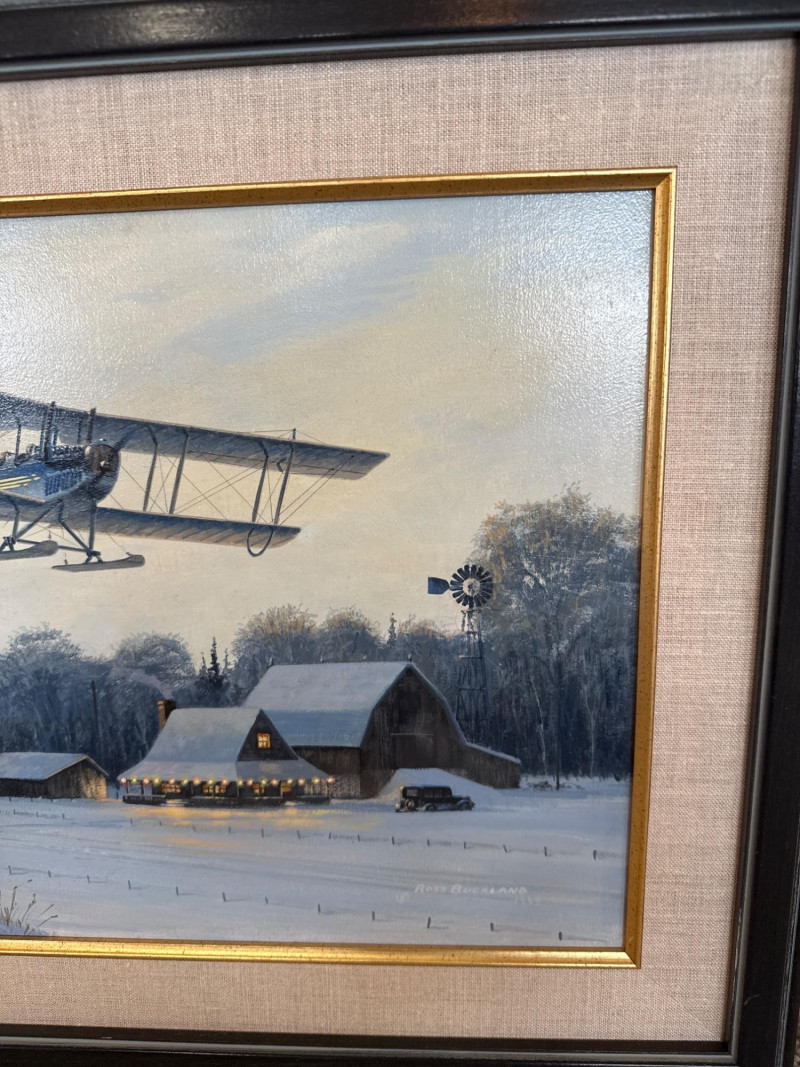 This original acrylic painting by Ross Buckland captures a nostalgic winter moment as a vintage biplane glides low over a quiet, snow‑covered farmstead. The warm glow spilling from the farmhouse and barn windows contrasts beautifully with the cool blues and whites of the surrounding landscape. A windmill, outbuildings, and a parked vehicle complete the rural setting, while rolling hills fade softly into the distance. Buckland’s handling of light is especially striking here—the warm interior illumination, the crisp winter shadows, and the subtle atmospheric depth all contribute to a peaceful, story‑driven scene. The passing aircraft adds a sense of movement and history, suggesting the era of early mail flights and remote winter deliveries. The composition blends technical accuracy with a gentle, narrative charm that is characteristic of Buckland’s work. Ross Buckland is a Canadian painter known for his detailed, atmospheric depictions of aviation, wilderness, and northern landscapes. Born in Calgary in 1958, Buckland is largely self‑taught, developing his skill through close study of master aviation artists such as Frank Wootton, Keith Ferris, and R.G. Smith. His preferred mediums—oil and acrylic on board—allow him to achieve the crisp detail, luminous skies, and narrative clarity that define his style. Buckland’s work often explores themes of solitude, adventure, and the quiet drama of remote environments. He is especially admired for his historically grounded aviation scenes, which combine technical precision with emotional resonance. His paintings have appeared in galleries including Trailside Galleries and Tabora Gallery, and he has been recognized by the American Society of Aviation Artists, earning the Founders’ Gold Award for his RCAF CF‑101 painting. 22 x 18 Artist Bio — Ross Buckland (Canadian, b. 1958)