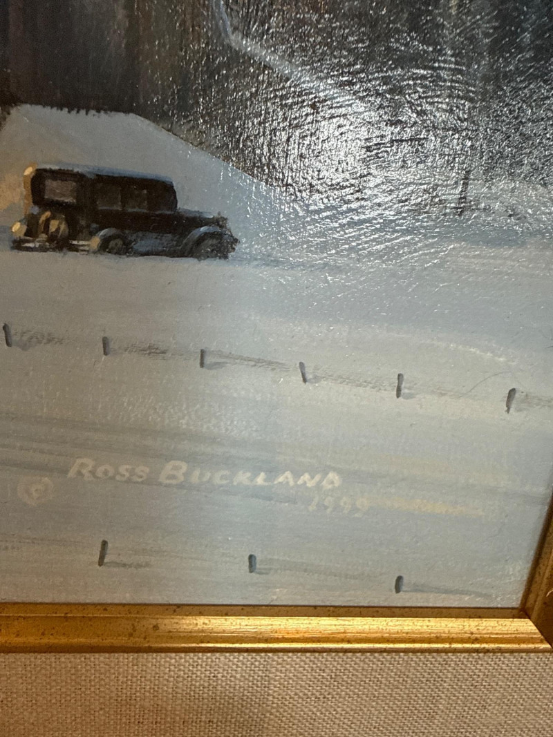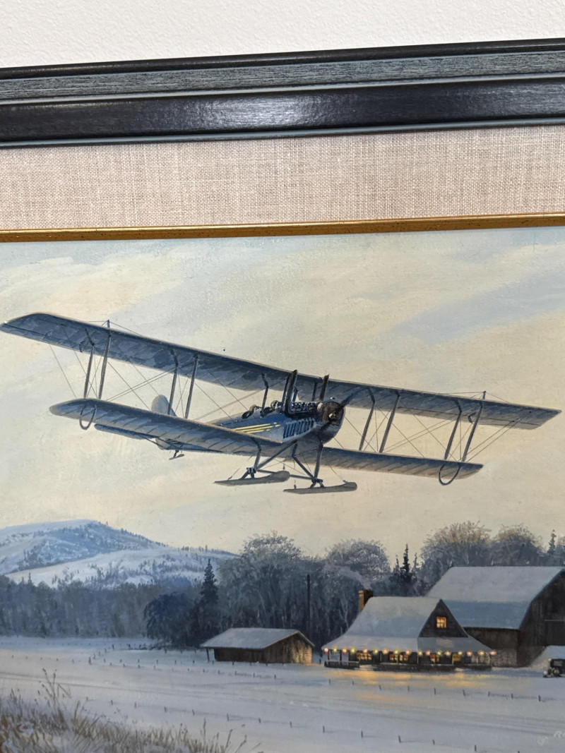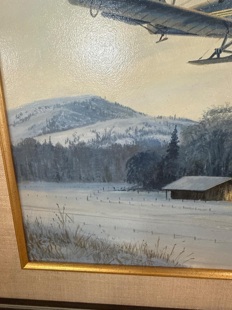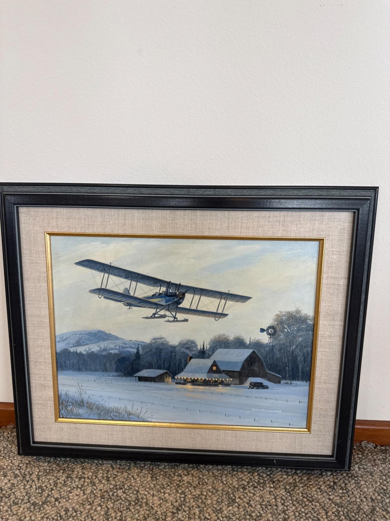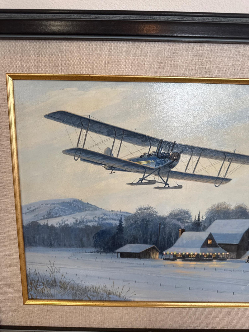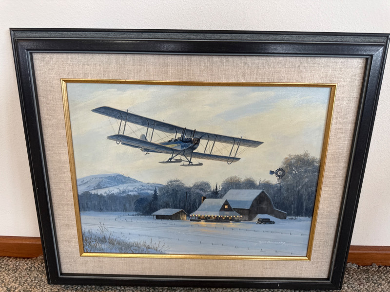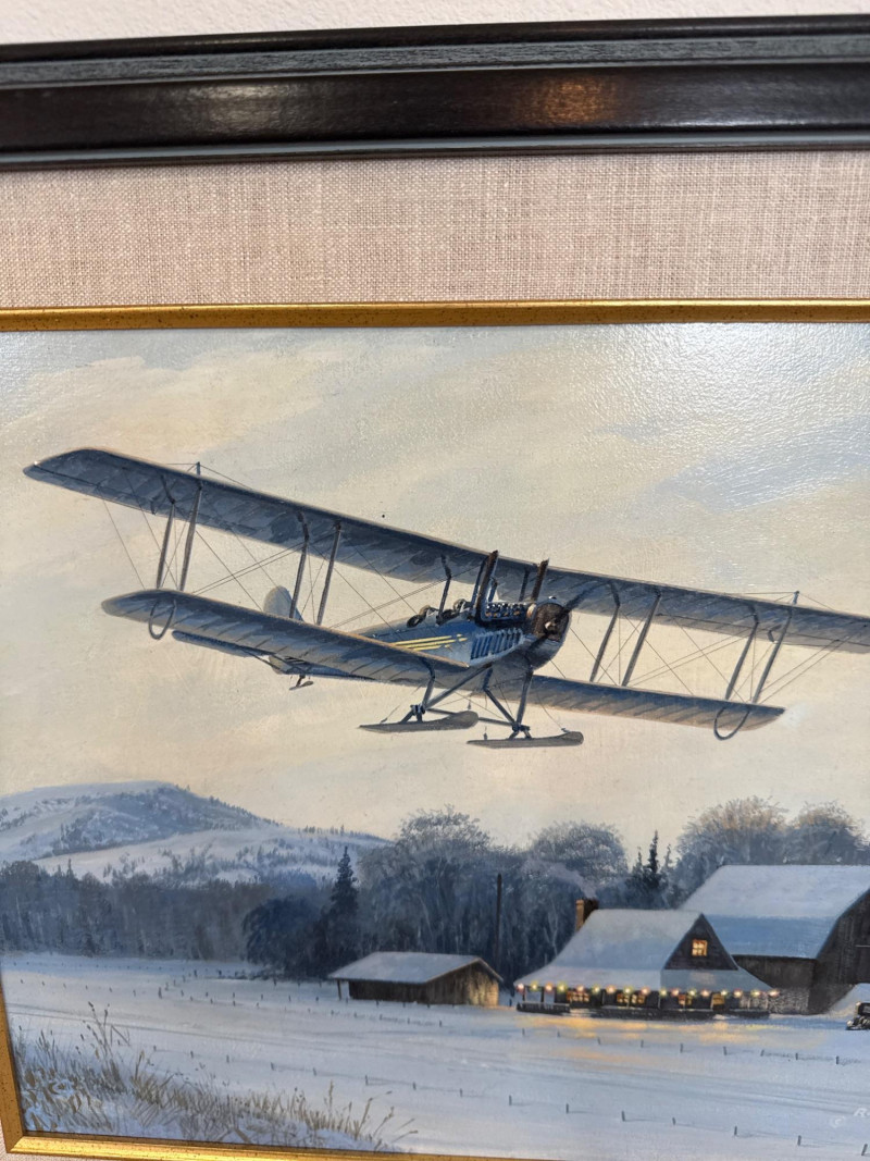 This original acrylic painting by Ross Buckland captures a nostalgic winter moment as a vintage biplane glides low over a quiet, snow‑covered farmstead. The warm glow spilling from the farmhouse and barn windows contrasts beautifully with the cool blues and whites of the surrounding landscape. A windmill, outbuildings, and a parked vehicle complete the rural setting, while rolling hills fade softly into the distance. Buckland’s handling of light is especially striking here—the warm interior illumination, the crisp winter shadows, and the subtle atmospheric depth all contribute to a peaceful, story‑driven scene. The passing aircraft adds a sense of movement and history, suggesting the era of early mail flights and remote winter deliveries. The composition blends technical accuracy with a gentle, narrative charm that is characteristic of Buckland’s work. Ross Buckland is a Canadian painter known for his detailed, atmospheric depictions of aviation, wilderness, and northern landscapes. Born in Calgary in 1958, Buckland is largely self‑taught, developing his skill through close study of master aviation artists such as Frank Wootton, Keith Ferris, and R.G. Smith. His preferred mediums—oil and acrylic on board—allow him to achieve the crisp detail, luminous skies, and narrative clarity that define his style. Buckland’s work often explores themes of solitude, adventure, and the quiet drama of remote environments. He is especially admired for his historically grounded aviation scenes, which combine technical precision with emotional resonance. His paintings have appeared in galleries including Trailside Galleries and Tabora Gallery, and he has been recognized by the American Society of Aviation Artists, earning the Founders’ Gold Award for his RCAF CF‑101 painting. 22 x 18 Artist Bio — Ross Buckland (Canadian, b. 1958)