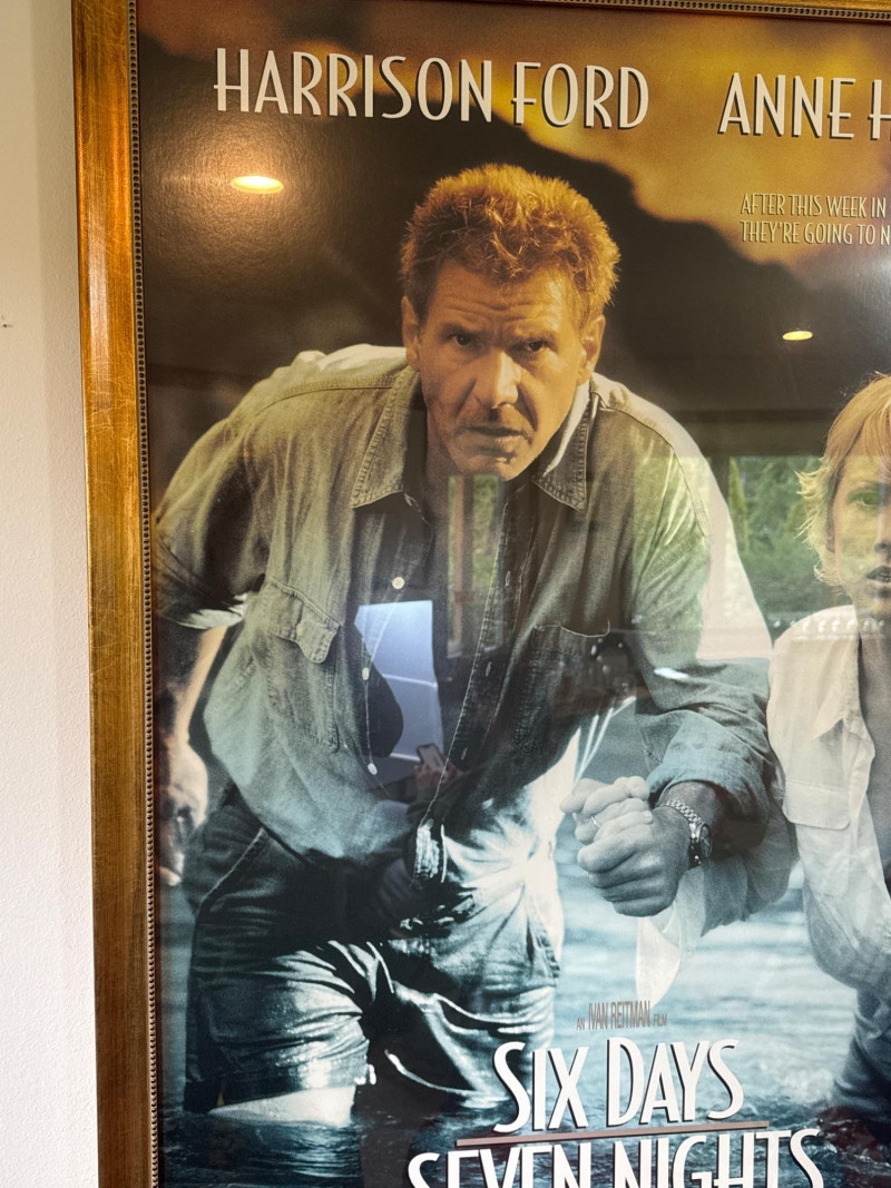 An original theatrical release poster for the 1998 adventure‑romantic comedy Six Days, Seven Nights, starring Harrison Ford and Anne Heche. The artwork features the film’s iconic imagery: Ford and Heche emerging from tropical waters, set against a backdrop of lush island terrain and stormy skies—capturing the film’s blend of action, survival, and humor. The poster includes the original studio credits, tagline, and production details, all printed in the classic Touchstone Pictures layout. It is professionally framed behind tempered glass, 43 x 30
