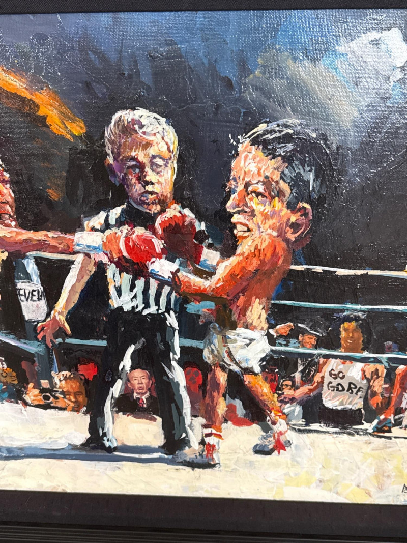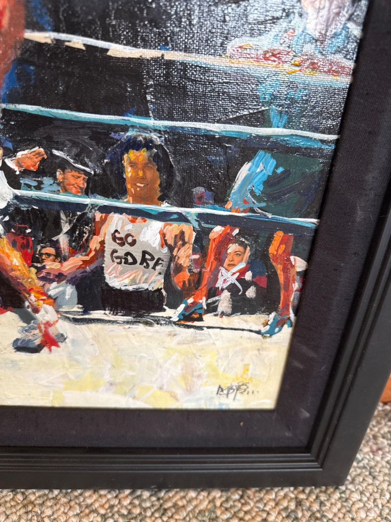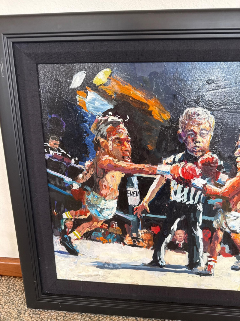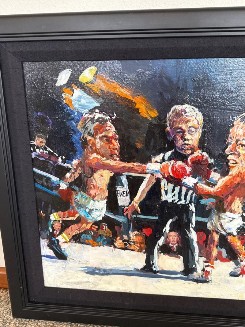 Measures 24" W × 20.5" T This energetic original acrylic painting by Danny Mayes captures a satirical, larger‑than‑life political boxing match featuring Al Gore and George W. Bush squaring off in the ring. Painted in Mayes’ signature caricature‑infused style, both fighters are rendered with exaggerated expressions and oversized heads, emphasizing the theatrical nature of political rivalry. Behind the ropes stands Hillary Clinton, dressed in a blue dress, observing the match with a composed, knowing presence. The crowd is packed with recognizable faces, including Ross Perot and Sylvester Stallone, the latter sporting a “Go Gore” T‑shirt that adds a humorous pop‑culture twist. A referee stands between the fighters, heightening the sense of action and anticipation. Mayes’ bold brushwork, vibrant palette, and expressive characterizations give the scene a lively, almost cartoon‑like energy. The painting blends political commentary, humor, and personality—an unmistakable example of Mayes’ ability to turn contemporary figures into vivid narrative art. Danny Mayes is a Pacific Northwest painter known for his bold, intuitive brushwork and expressive depictions of regional life. Born in Tacoma, Washington, Mayes originally trained as a boxer before earning a scholarship to the Burnley School of Commercial Art (later the Art Institute of Seattle). There he studied under celebrated Northwest painter William Cumming, whose influence can be seen in Mayes’ gestural linework and dynamic compositions. Working primarily in acrylic and watercolor, Mayes paints street scenes, maritime subjects, Alaska and Northwest landscapes, and character‑driven portraits—including humorous or satirical works like this political boxing scene. His paintings have been collected by the Seattle Seahawks, Seattle Mariners, and numerous corporate and private collectors. Mayes’ work is admired for its immediacy, warmth, and the sense of movement he brings to every subject.Artist Bio — Danny Mayes (American, b. 1950s)