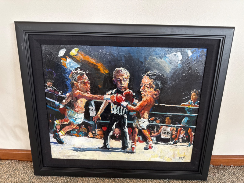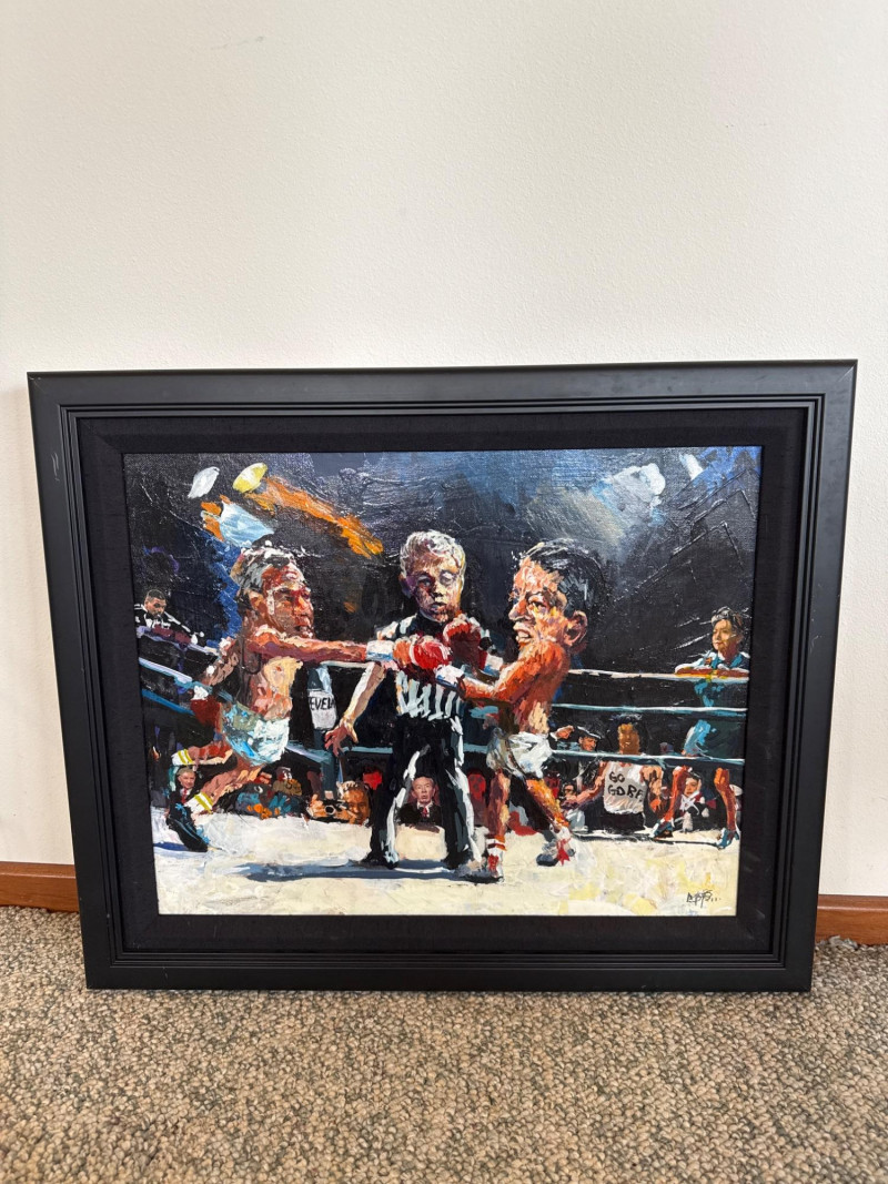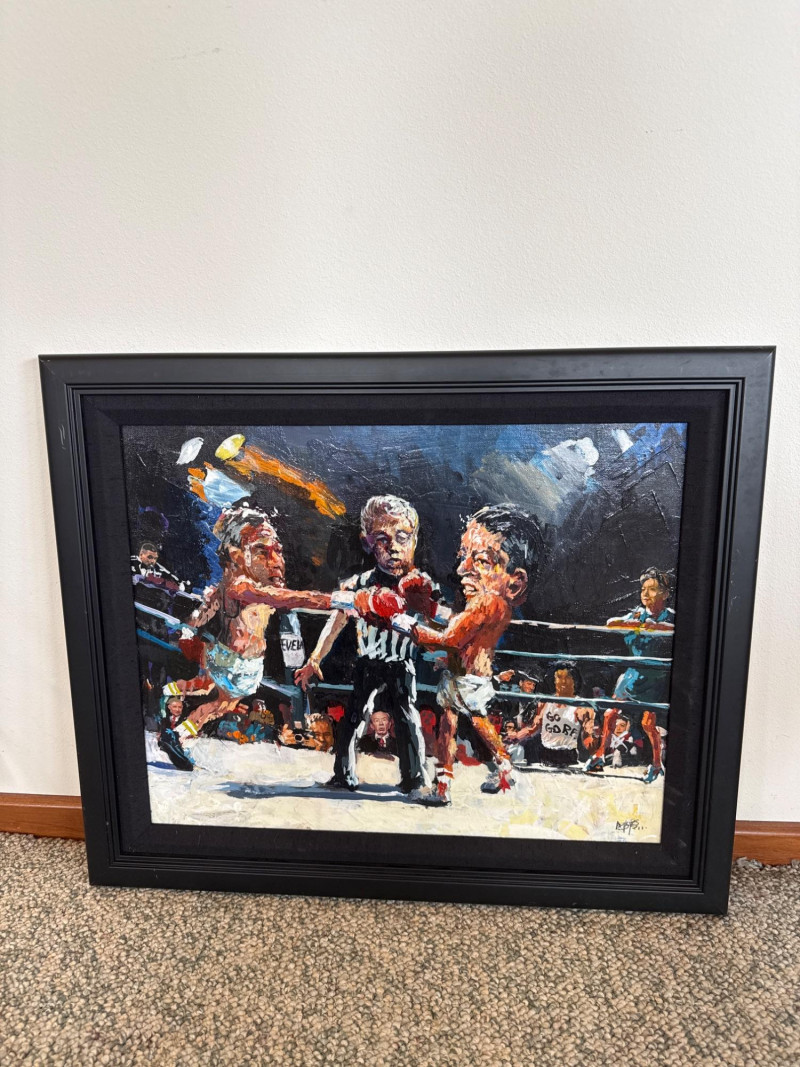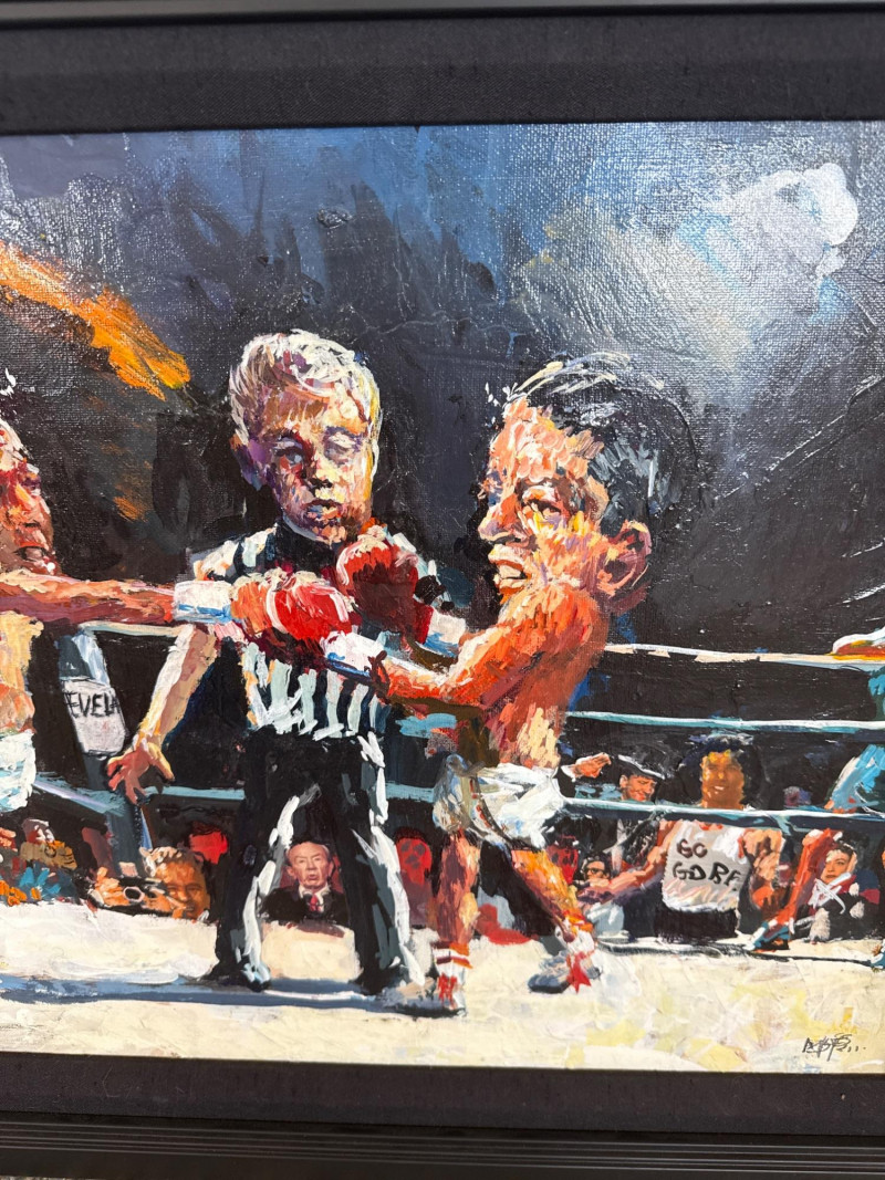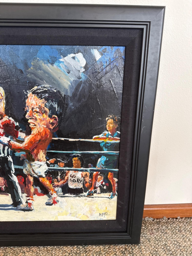 Measures 24" W × 20.5" T This energetic original acrylic painting by Danny Mayes captures a satirical, larger‑than‑life political boxing match featuring Al Gore and George W. Bush squaring off in the ring. Painted in Mayes’ signature caricature‑infused style, both fighters are rendered with exaggerated expressions and oversized heads, emphasizing the theatrical nature of political rivalry. Behind the ropes stands Hillary Clinton, dressed in a blue dress, observing the match with a composed, knowing presence. The crowd is packed with recognizable faces, including Ross Perot and Sylvester Stallone, the latter sporting a “Go Gore” T‑shirt that adds a humorous pop‑culture twist. A referee stands between the fighters, heightening the sense of action and anticipation. Mayes’ bold brushwork, vibrant palette, and expressive characterizations give the scene a lively, almost cartoon‑like energy. The painting blends political commentary, humor, and personality—an unmistakable example of Mayes’ ability to turn contemporary figures into vivid narrative art. Danny Mayes is a Pacific Northwest painter known for his bold, intuitive brushwork and expressive depictions of regional life. Born in Tacoma, Washington, Mayes originally trained as a boxer before earning a scholarship to the Burnley School of Commercial Art (later the Art Institute of Seattle). There he studied under celebrated Northwest painter William Cumming, whose influence can be seen in Mayes’ gestural linework and dynamic compositions. Working primarily in acrylic and watercolor, Mayes paints street scenes, maritime subjects, Alaska and Northwest landscapes, and character‑driven portraits—including humorous or satirical works like this political boxing scene. His paintings have been collected by the Seattle Seahawks, Seattle Mariners, and numerous corporate and private collectors. Mayes’ work is admired for its immediacy, warmth, and the sense of movement he brings to every subject.Artist Bio — Danny Mayes (American, b. 1950s)