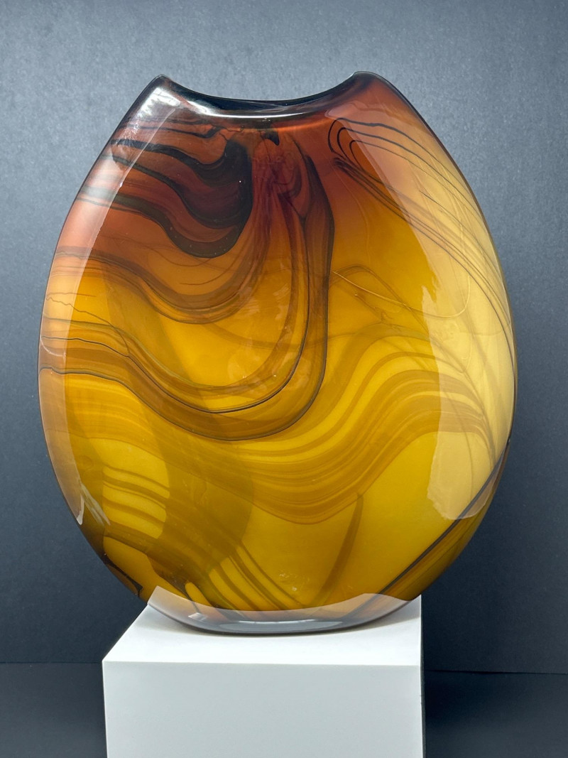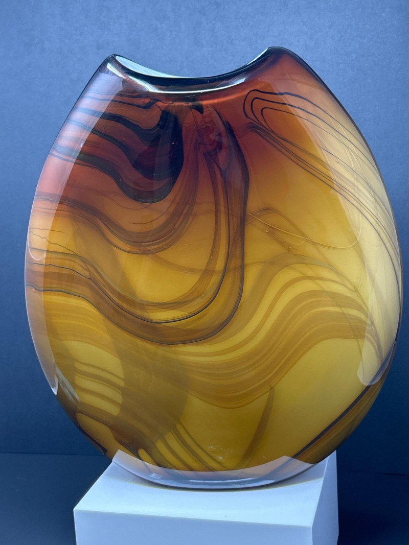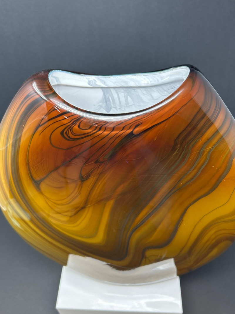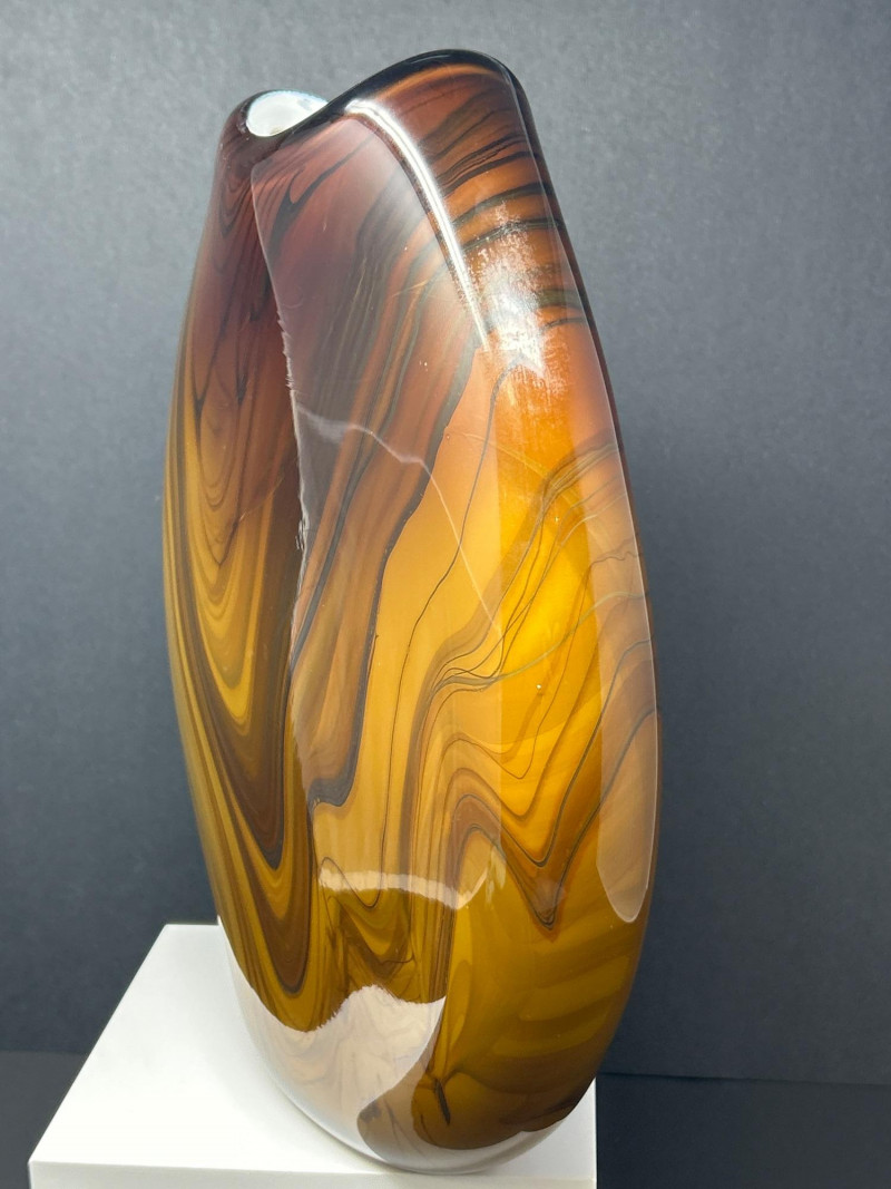 A striking hand‑blown art glass vase by Pacific Northwest glass artist Dan Bergsma, showcasing his signature mastery of color layering and organic movement. The piece features a warm amber body animated by swirling black and deep brown veining that creates a marbled, flame‑like effect throughout the form. The oval silhouette with its softly indented rim enhances the internal patterning, giving the vase strong sculptural presence from every angle. A bold, contemporary studio‑glass work with exceptional depth, craftsmanship, and display impact. 13" tall 11" wide