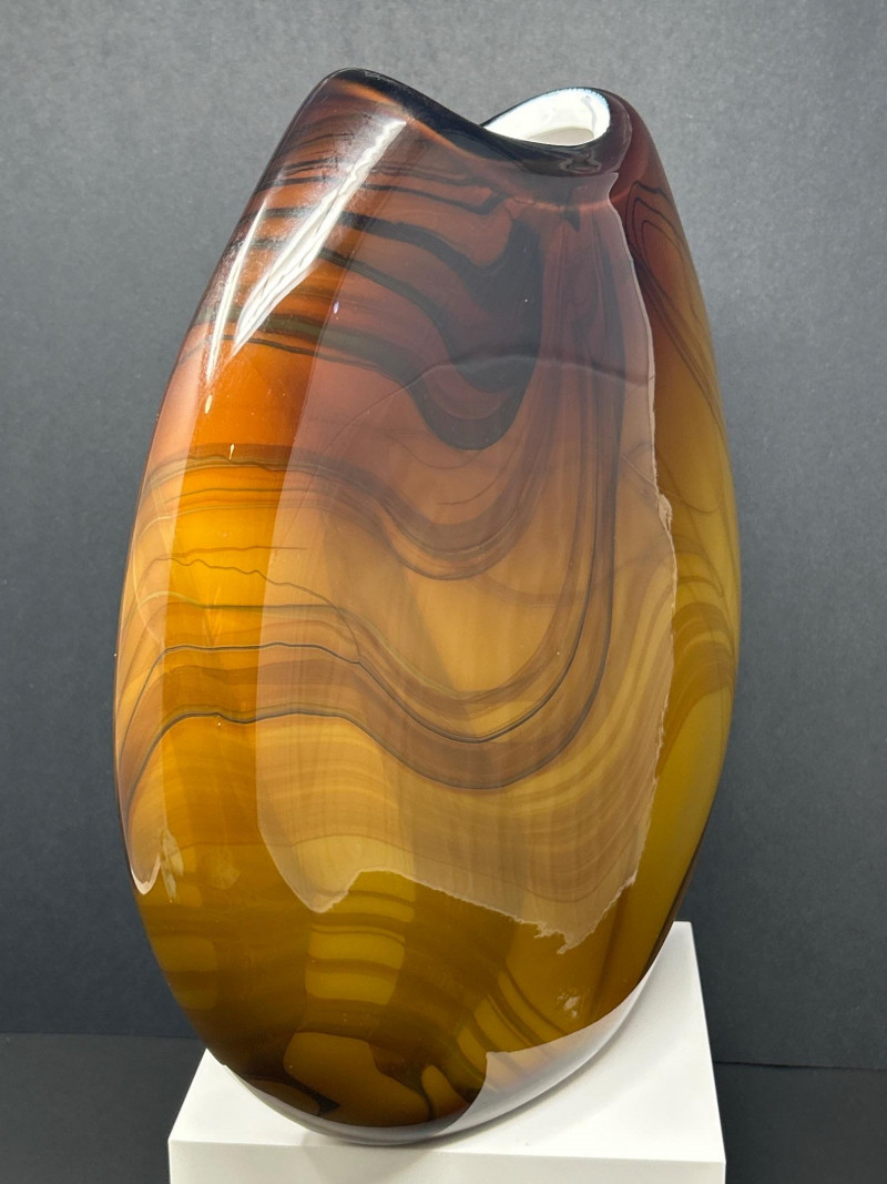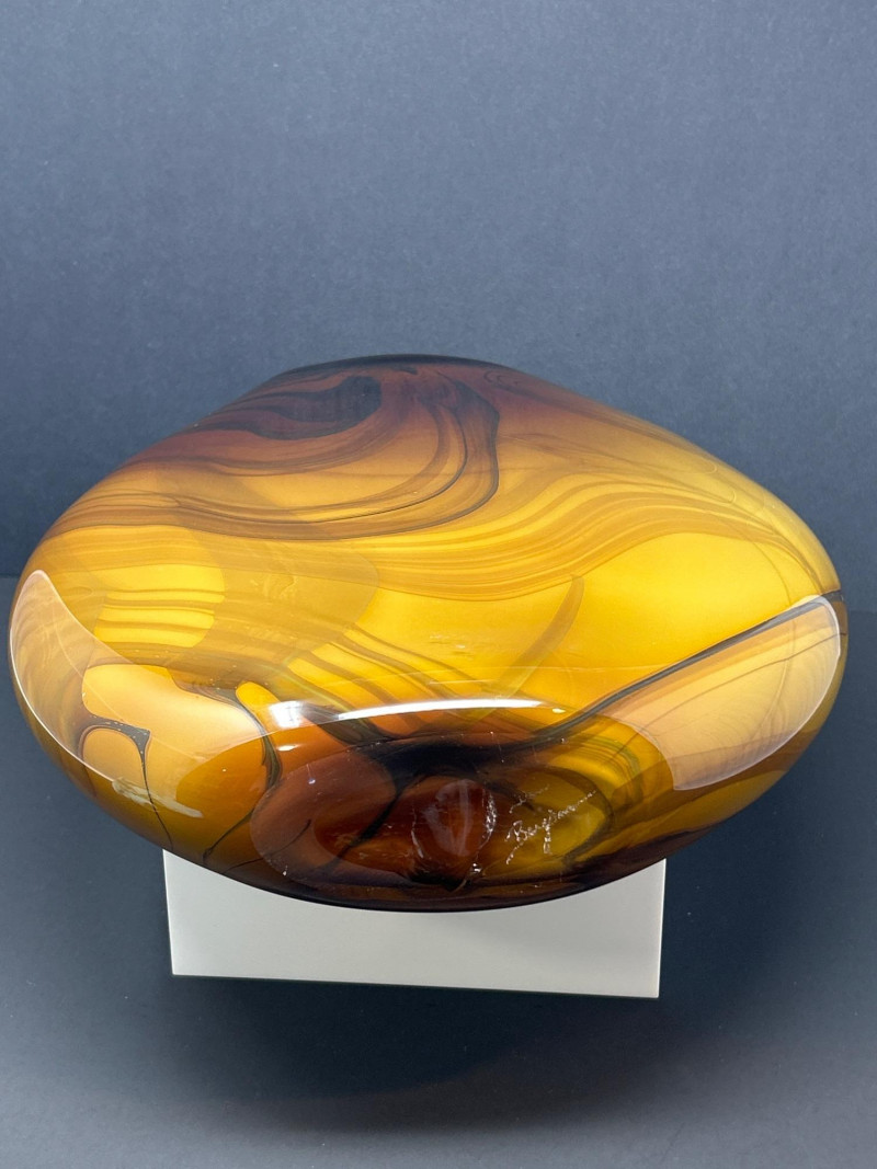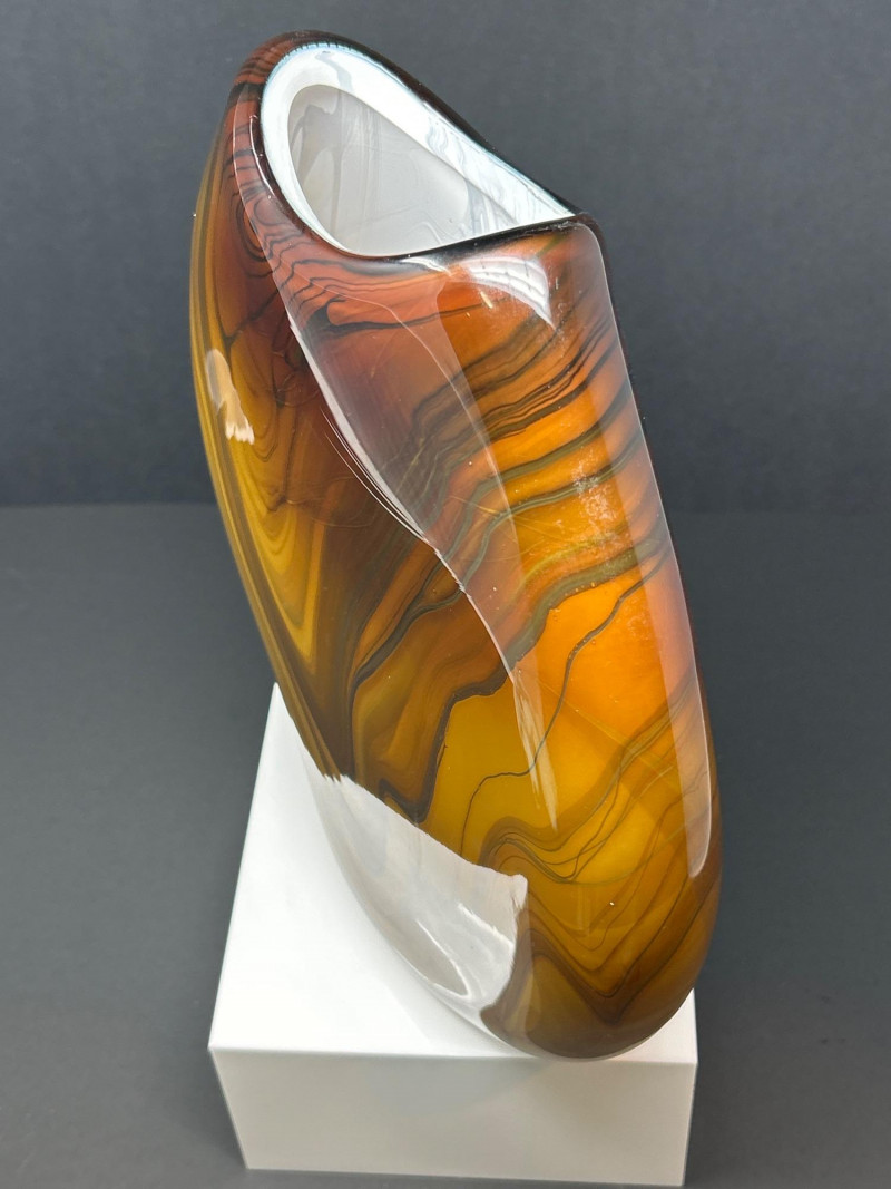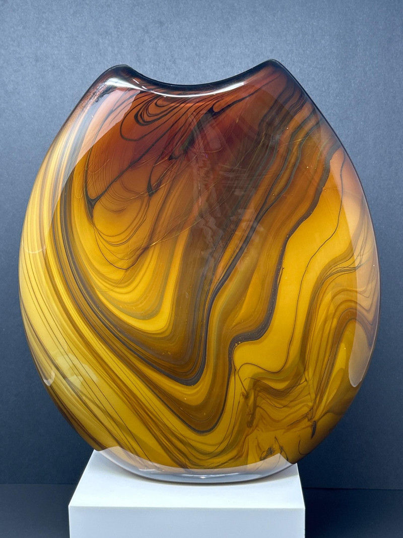 A striking hand‑blown art glass vase by Pacific Northwest glass artist Dan Bergsma, showcasing his signature mastery of color layering and organic movement. The piece features a warm amber body animated by swirling black and deep brown veining that creates a marbled, flame‑like effect throughout the form. The oval silhouette with its softly indented rim enhances the internal patterning, giving the vase strong sculptural presence from every angle. A bold, contemporary studio‑glass work with exceptional depth, craftsmanship, and display impact. 13" tall 11" wide
