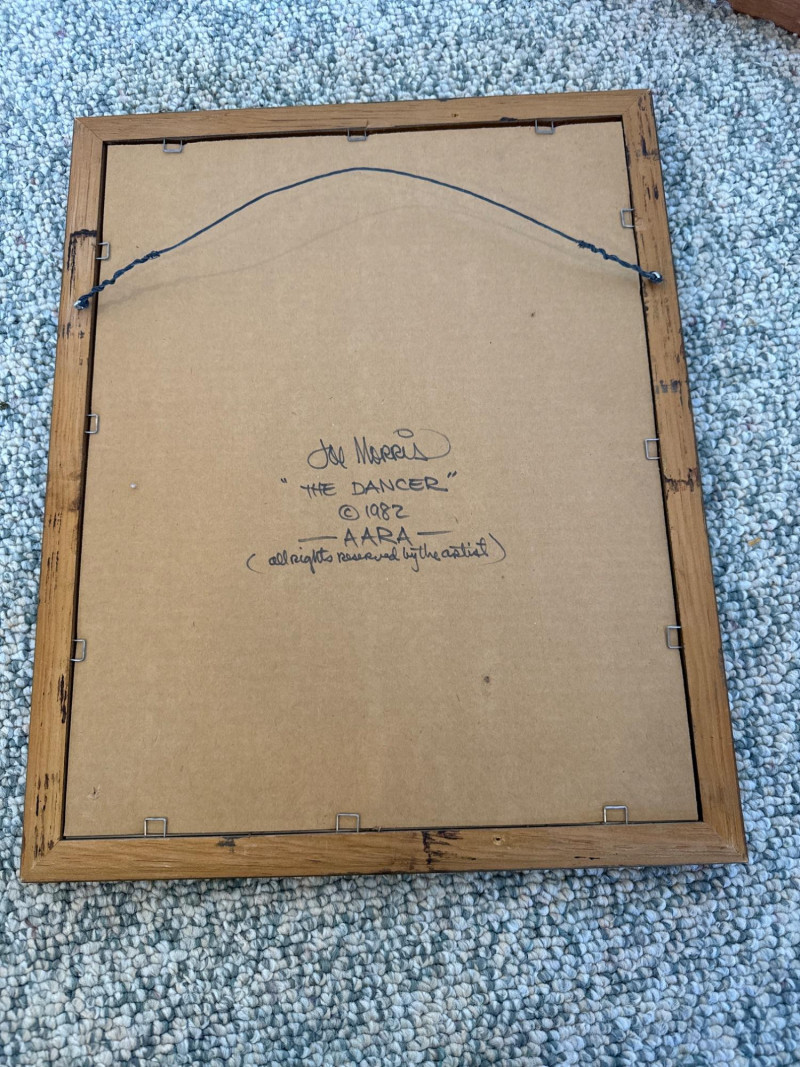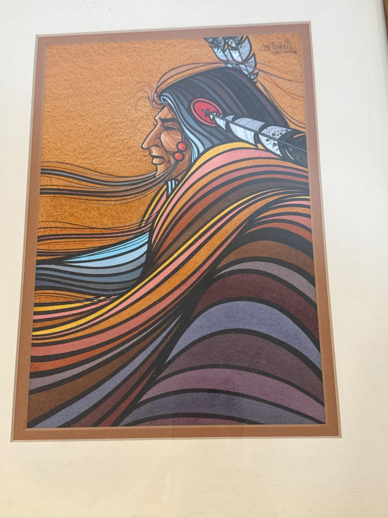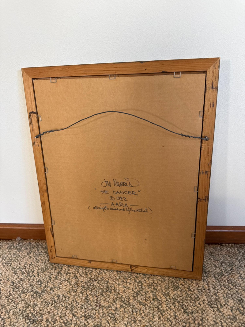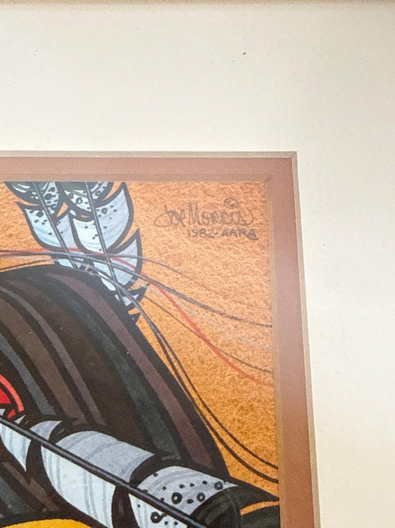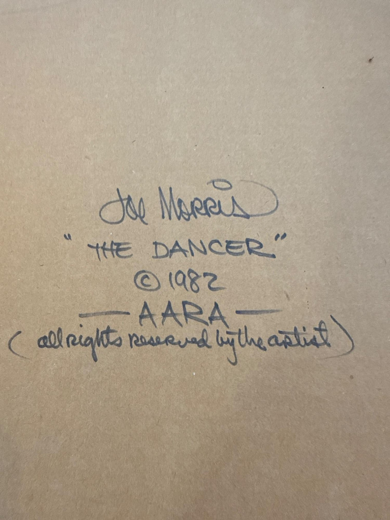 An original 1982 watercolor by Joe Morris, titled “The Dancer,” signed and marked AARA (All Rights Reserved by the Artist). This work showcases Morris’s distinctive visual language: a stylized Native figure in profile, rendered with elongated contours, sweeping hair and feather elements, and rhythmic color transitions that suggest movement and ceremony. Morris layers warm earth tones, violets, blues, and oranges in fluid, interlocking shapes that create a sense of motion radiating through the figure. The composition balances cultural symbolism with a modern graphic sensibility, making this a strong example of Morris’s early‑1980s work. A striking, expressive piece for collectors of Native‑themed modernist art or Morris’s oeuvre. Joe Morris is an American artist known for his stylized portrayals of Native dancers, figures, and ceremonial themes. Active primarily in the 1970s–1980s, Morris developed a recognizable style built on flowing linework, bold color fields, and rhythmic compositions that evoke movement and spiritual resonance. His work appears in private collections across the United States and remains appreciated for its strong graphic presence and contemporary interpretation of Indigenous subject matter.Short Artist Bio — Joe Morris