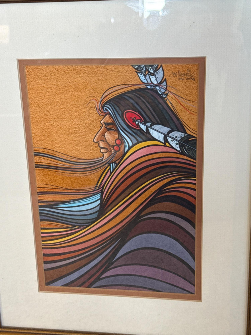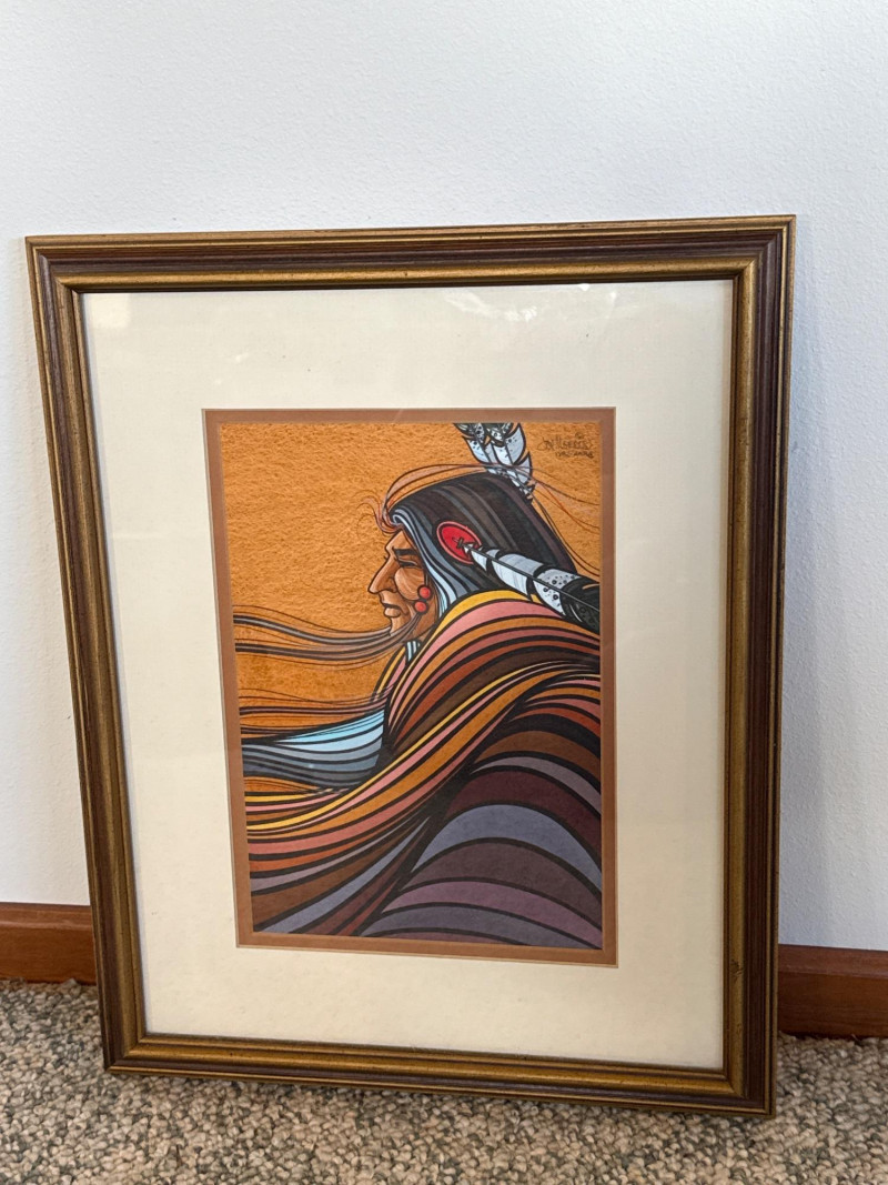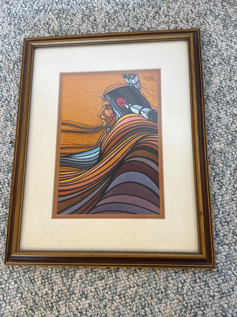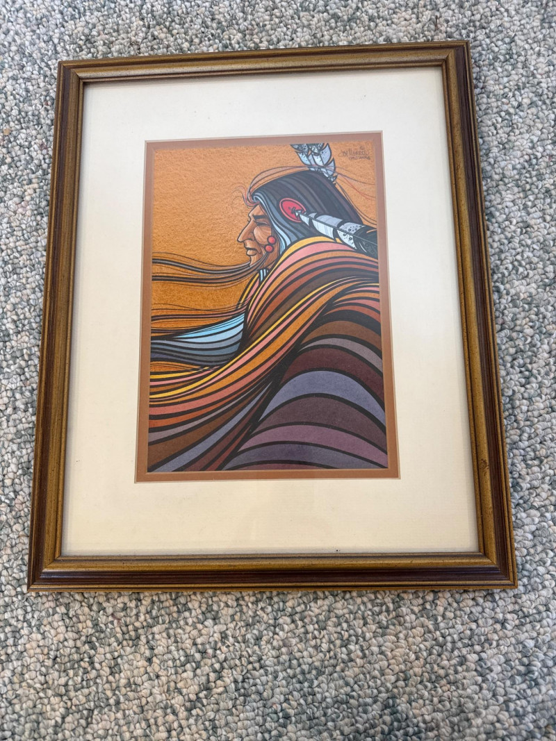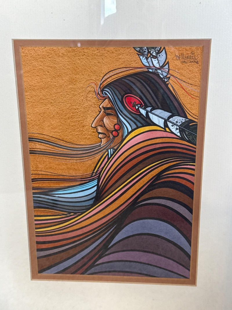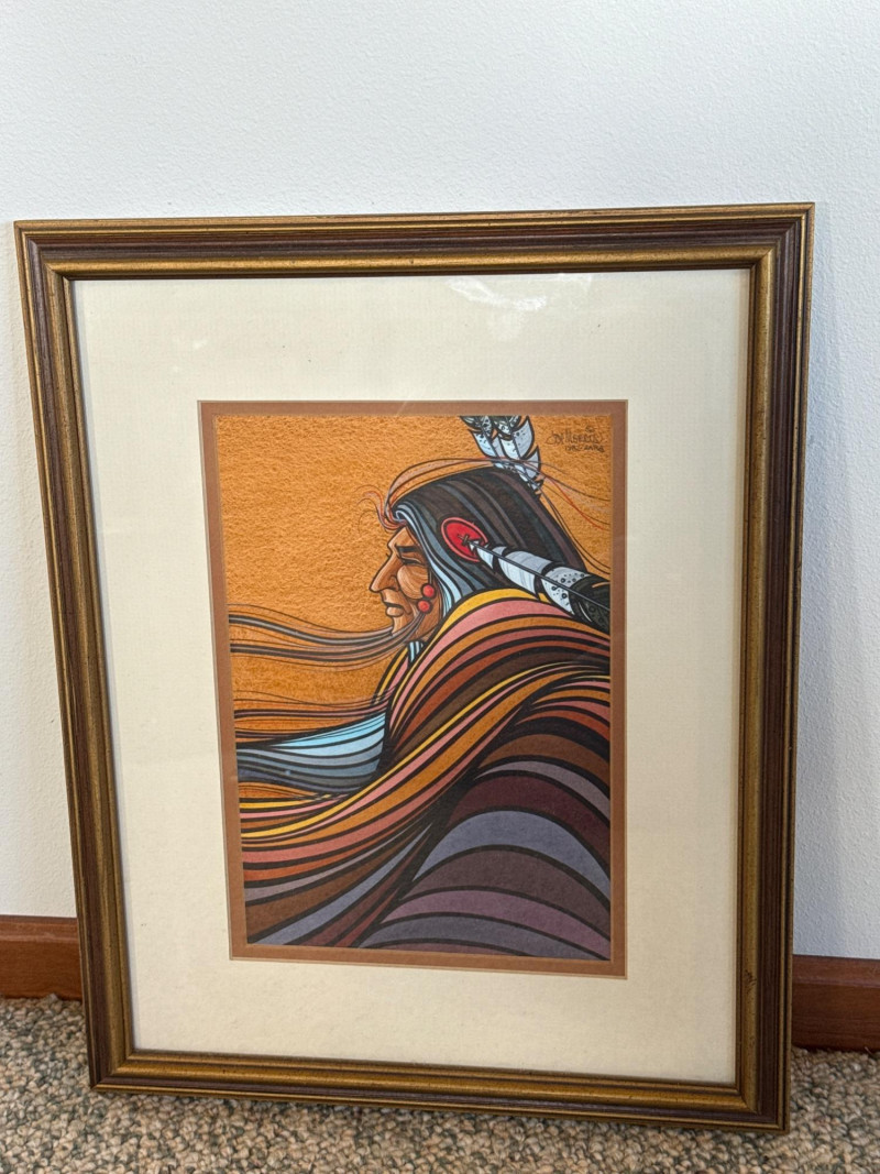 An original 1982 watercolor by Joe Morris, titled “The Dancer,” signed and marked AARA (All Rights Reserved by the Artist). This work showcases Morris’s distinctive visual language: a stylized Native figure in profile, rendered with elongated contours, sweeping hair and feather elements, and rhythmic color transitions that suggest movement and ceremony. Morris layers warm earth tones, violets, blues, and oranges in fluid, interlocking shapes that create a sense of motion radiating through the figure. The composition balances cultural symbolism with a modern graphic sensibility, making this a strong example of Morris’s early‑1980s work. A striking, expressive piece for collectors of Native‑themed modernist art or Morris’s oeuvre. Joe Morris is an American artist known for his stylized portrayals of Native dancers, figures, and ceremonial themes. Active primarily in the 1970s–1980s, Morris developed a recognizable style built on flowing linework, bold color fields, and rhythmic compositions that evoke movement and spiritual resonance. His work appears in private collections across the United States and remains appreciated for its strong graphic presence and contemporary interpretation of Indigenous subject matter.Short Artist Bio — Joe Morris