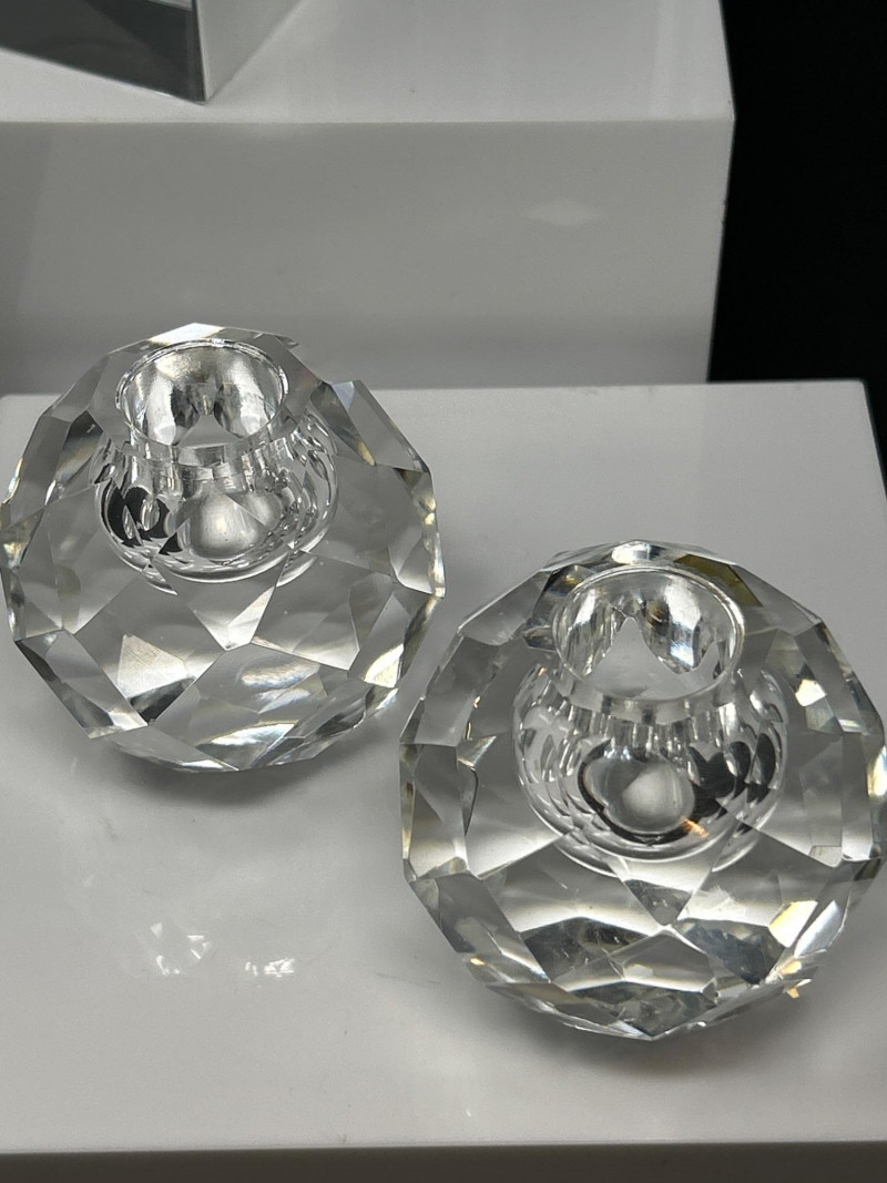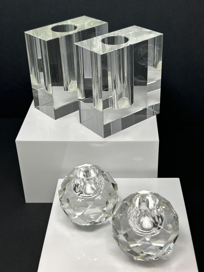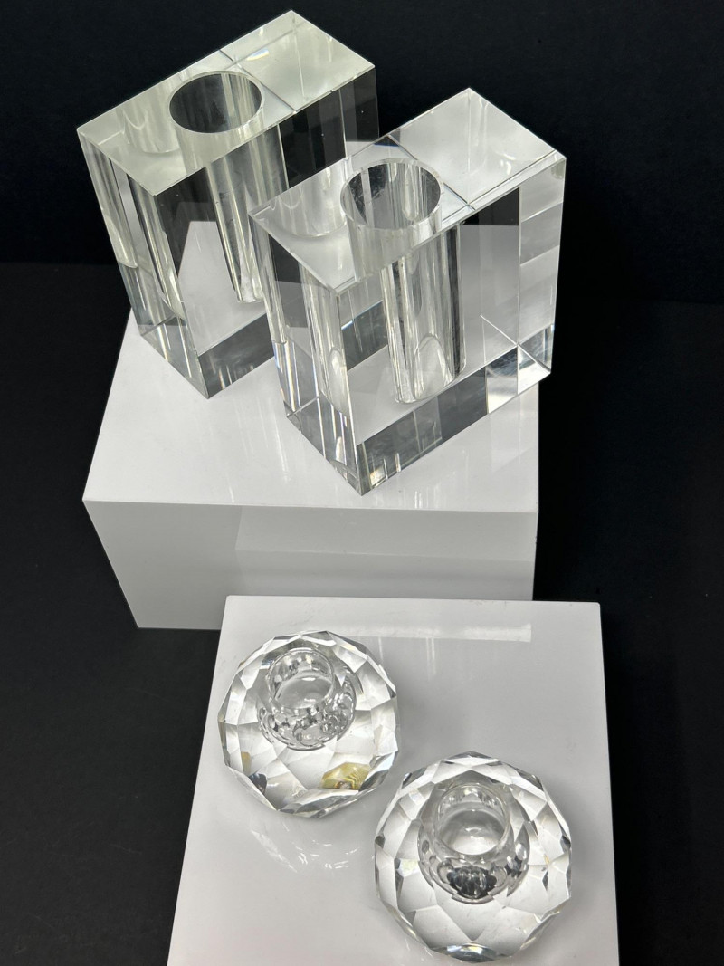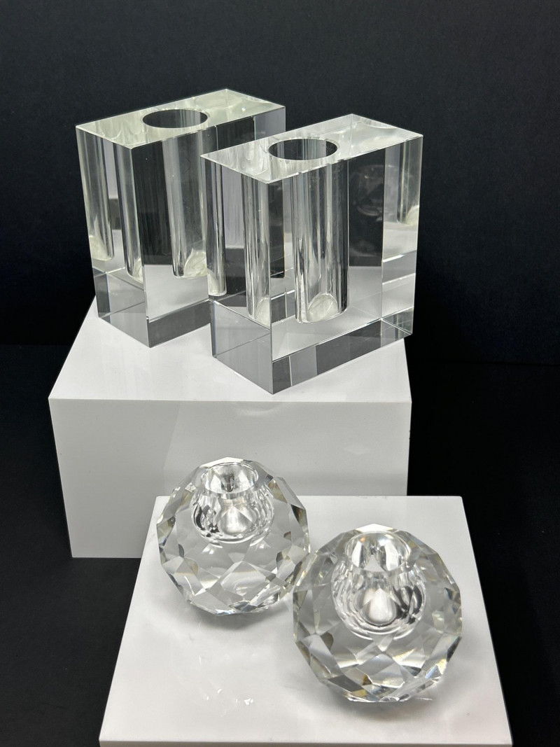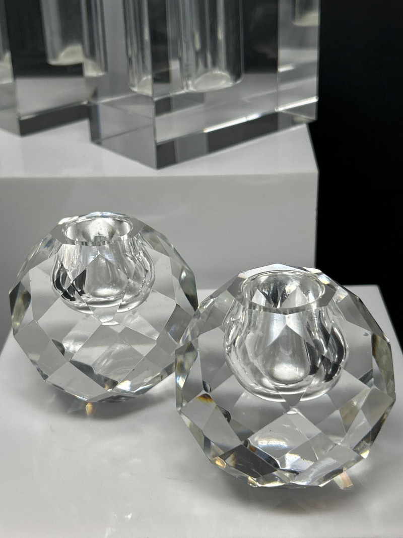 Set of 2 (4 total) clear glass candle holders in two complementary styles. The pair on the upper tier features a rectangular block form with a cylindrical candle well—clean‑lined, modern, and architectural. The lower pair is round and faceted, resembling cut crystal with multi‑angled surfaces that catch and reflect light beautifully. A versatile grouping that works well together or individually, suitable for taper or small pillar candles depending on fit. No maker’s marks noted. Globe 3” 4.5t x 2 x 4