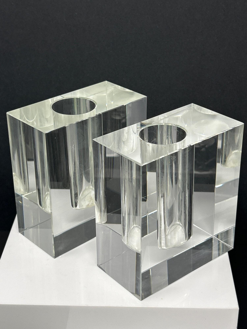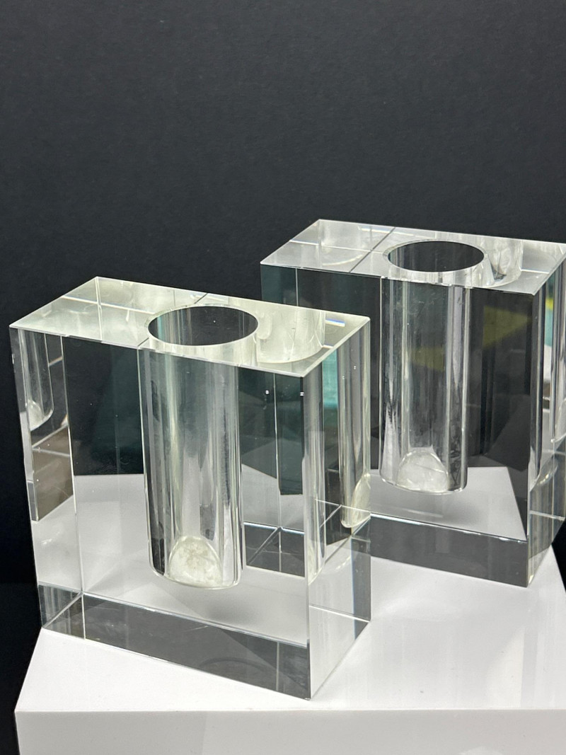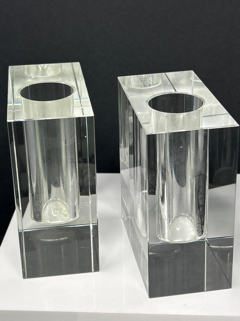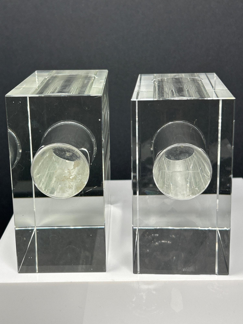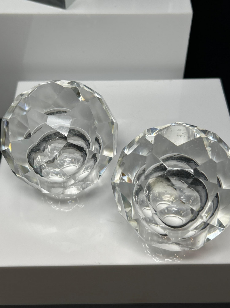 Set of 2 (4 total) clear glass candle holders in two complementary styles. The pair on the upper tier features a rectangular block form with a cylindrical candle well—clean‑lined, modern, and architectural. The lower pair is round and faceted, resembling cut crystal with multi‑angled surfaces that catch and reflect light beautifully. A versatile grouping that works well together or individually, suitable for taper or small pillar candles depending on fit. No maker’s marks noted. Globe 3” 4.5t x 2 x 4
