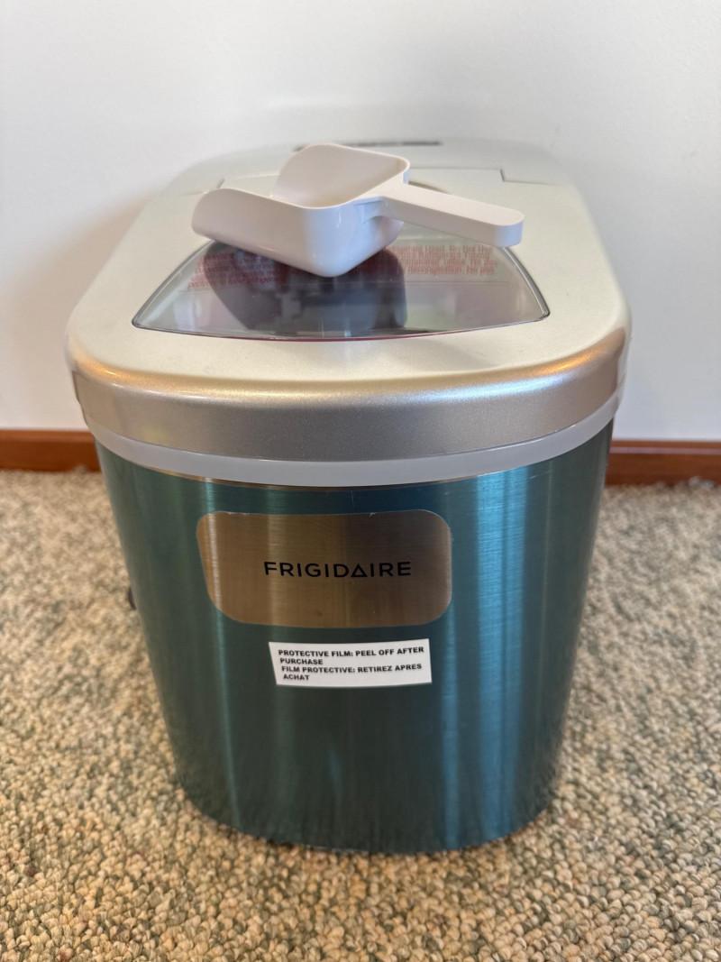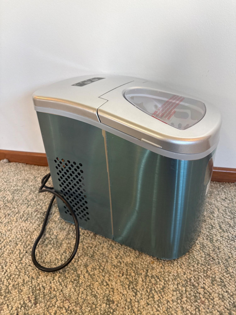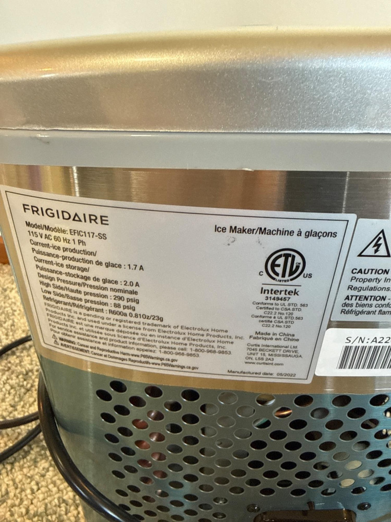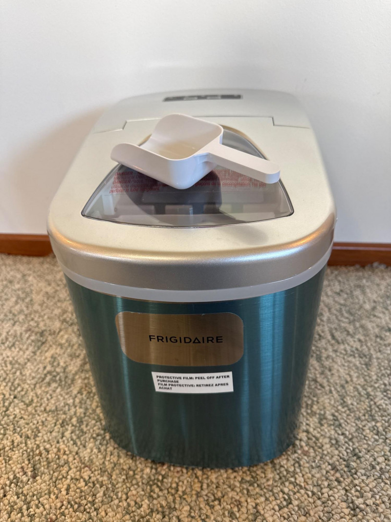 Includes: Ice scoop (visible) A compact Frigidaire EFIC117‑SS countertop ice maker designed for quick, convenient daily ice production. The unit features a stainless‑steel front panel, top‑loading clear lid, and a removable ice scoop. This model is known for fast cycle times, simple one‑button operation, and portability, making it ideal for kitchens, offices, RVs, or entertaining. Powered this on, owner said it had not been used. Like New condition, no box. 11.5 x 9.5 x 12 D