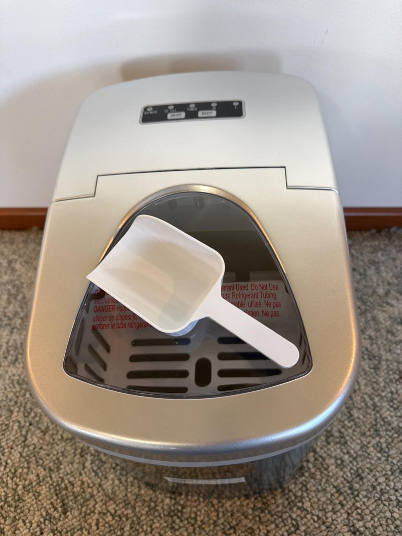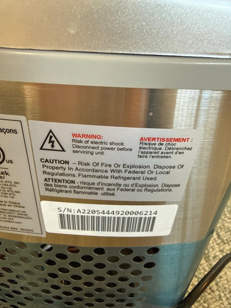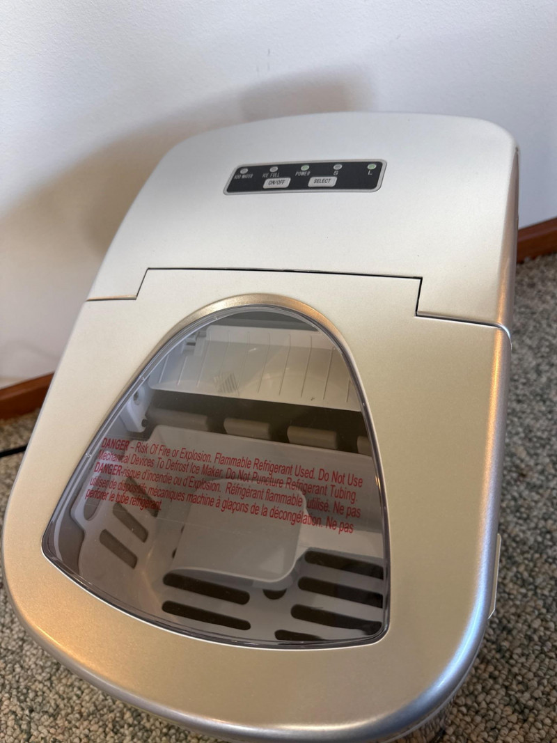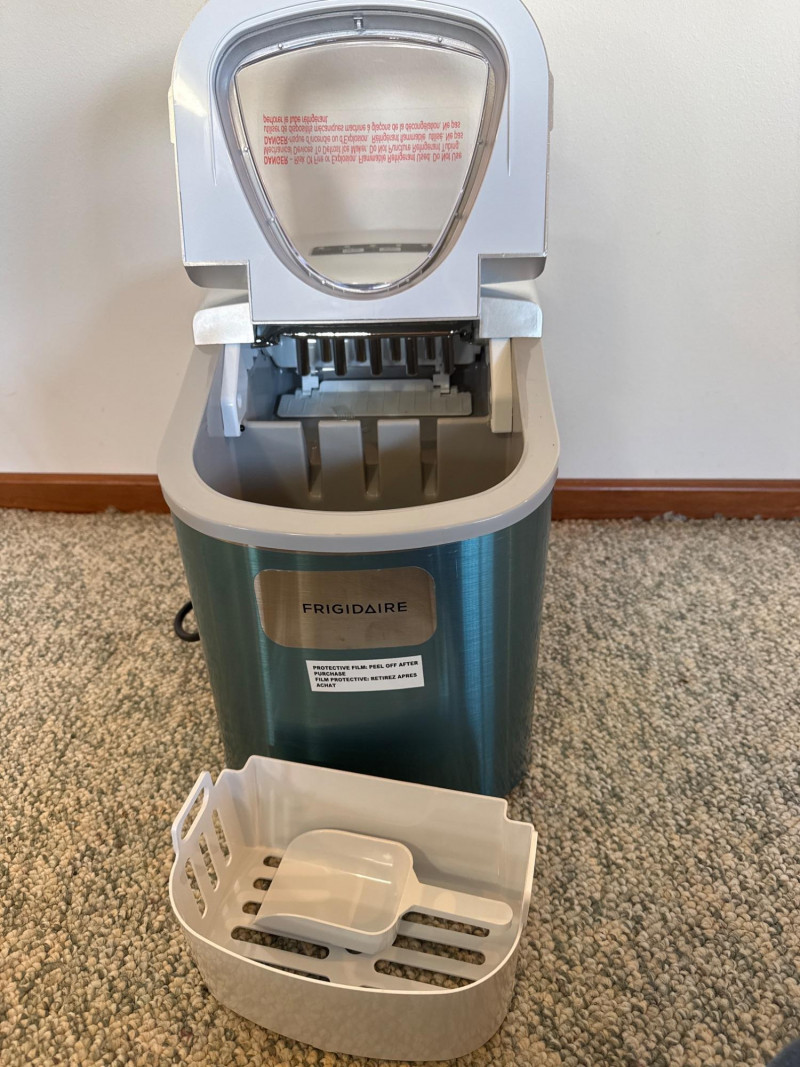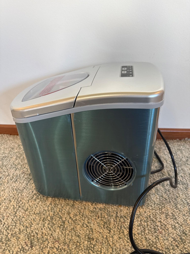 Includes: Ice scoop (visible) A compact Frigidaire EFIC117‑SS countertop ice maker designed for quick, convenient daily ice production. The unit features a stainless‑steel front panel, top‑loading clear lid, and a removable ice scoop. This model is known for fast cycle times, simple one‑button operation, and portability, making it ideal for kitchens, offices, RVs, or entertaining. Powered this on, owner said it had not been used. Like New condition, no box. 11.5 x 9.5 x 12 D