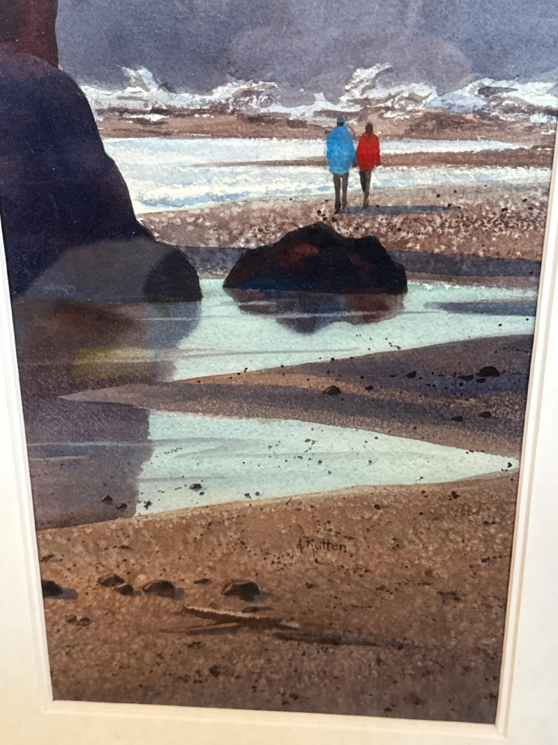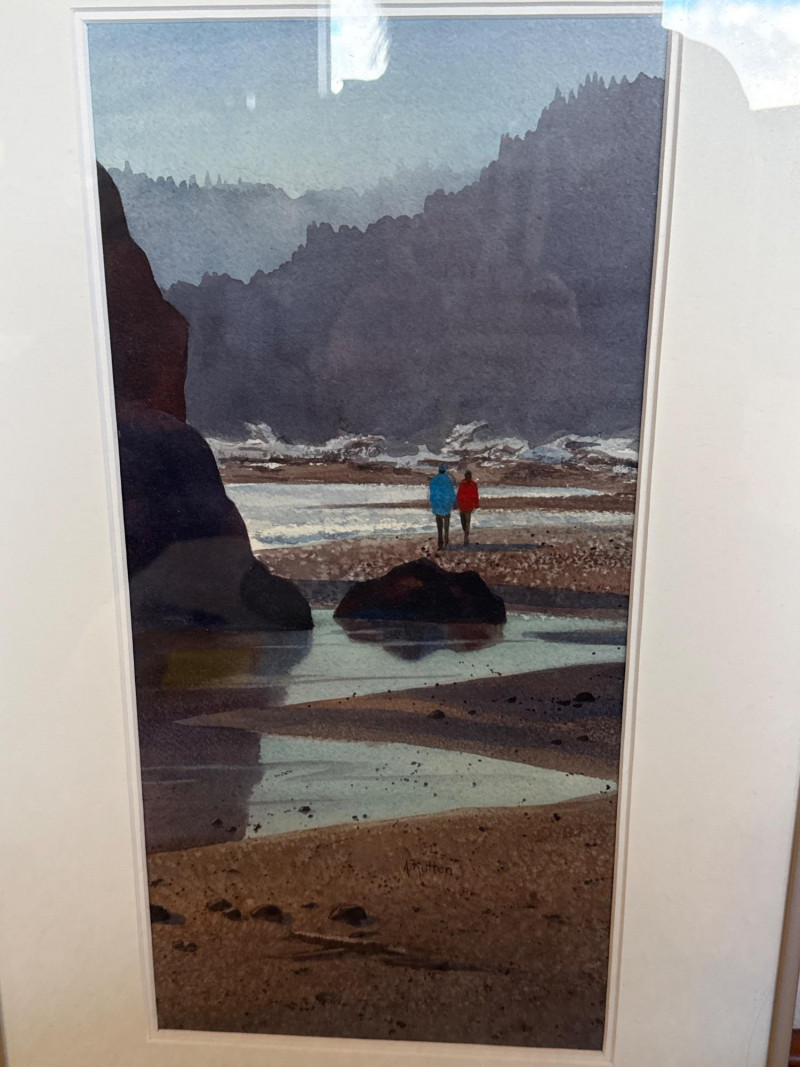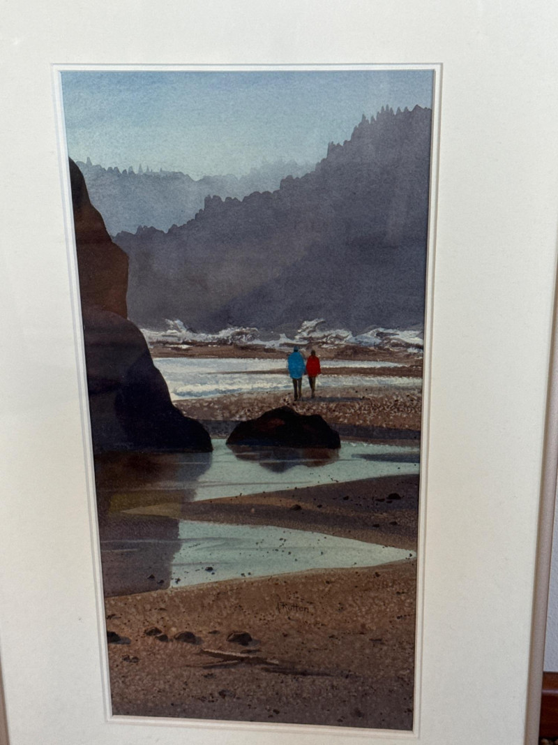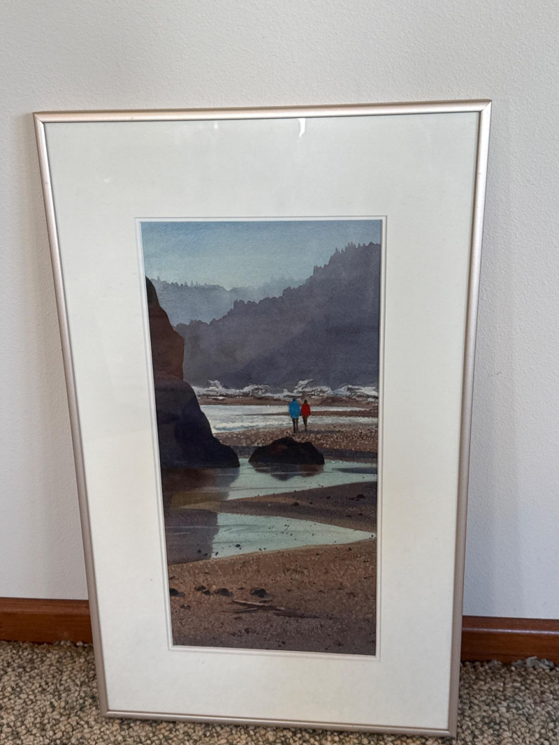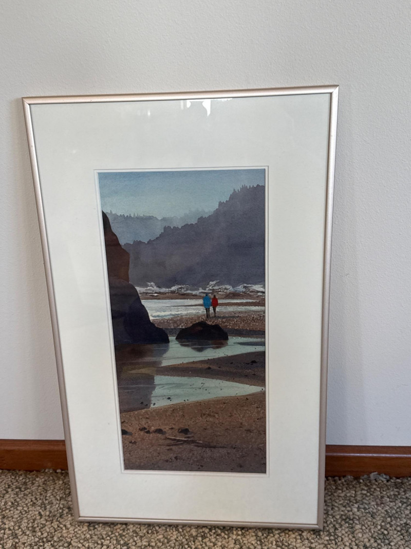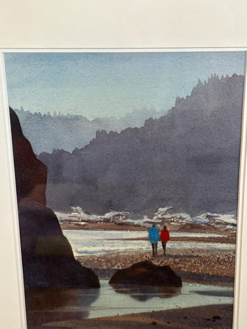 Beach Reflections captures a quiet, contemplative moment along the Washington coast, painted in Ann Rutter’s warm, atmospheric style. Two figures stand on a tide‑washed rock, their bright jackets—one red, one blue—providing a vivid focal point against the soft grays, greens, and misty blues of the shoreline. The reflective water, distant sea stacks, and hazy forested cliffs create a serene sense of depth and place. Rutter’s brushwork is gentle and impressionistic, emphasizing mood over detail. The scene feels both intimate and expansive, a familiar Northwest moment rendered with tenderness and calm. Framed and ready for display, it’s a lovely example of Rutter’s ability to capture the quiet poetry of everyday landscapes.
