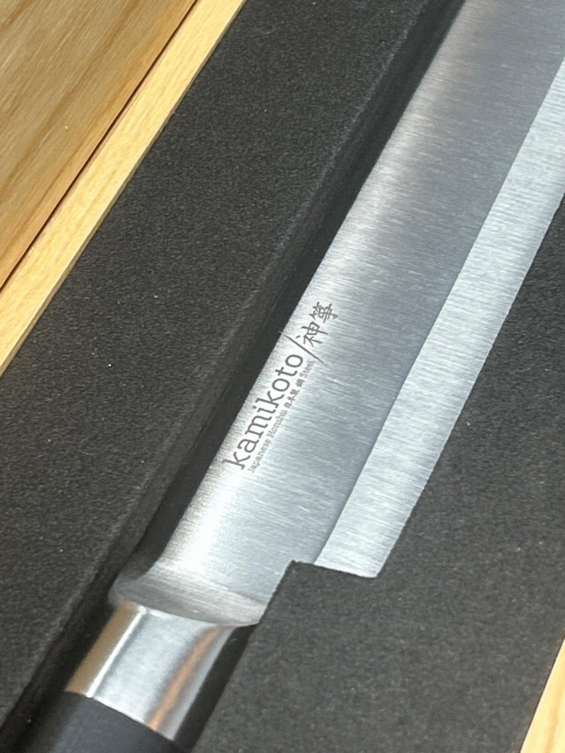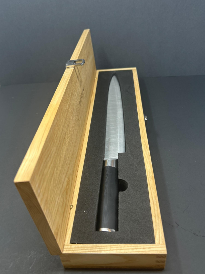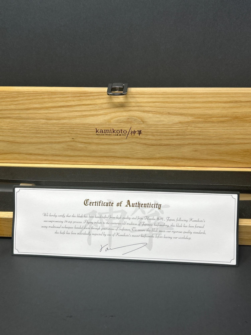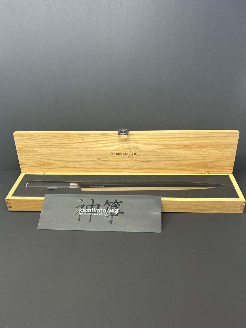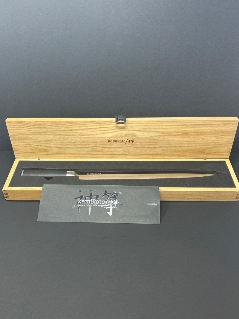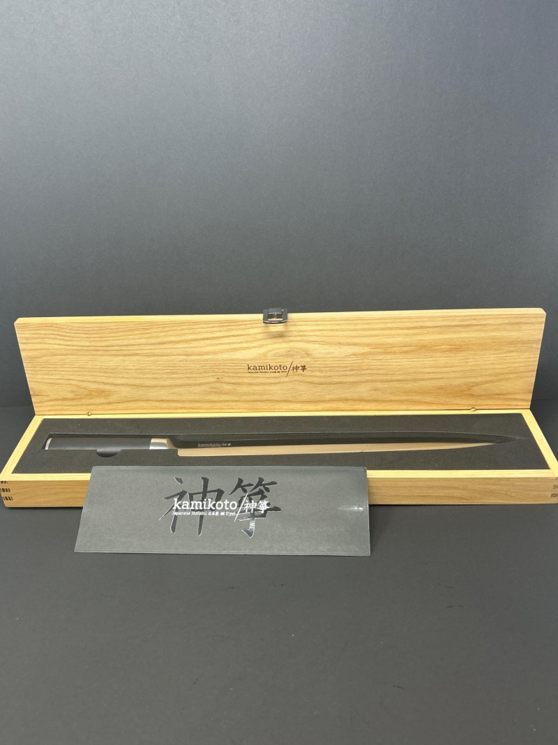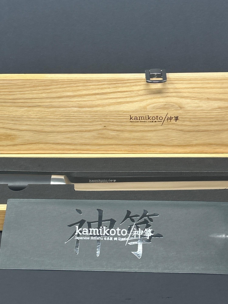 A premium Kamikoto chef’s knife featuring a 12‑inch stainless steel blade with a satin finish and a classic black handle capped in metal. The knife is housed in its original wooden presentation box with custom‑cut foam for secure storage. Known for their weight, balance, and clean single‑bevel edge, Kamikoto knives are favored for precision slicing and professional‑grade performance. A striking, display‑worthy example of contemporary Japanese‑inspired cutlery craftsmanship. 12" Blade