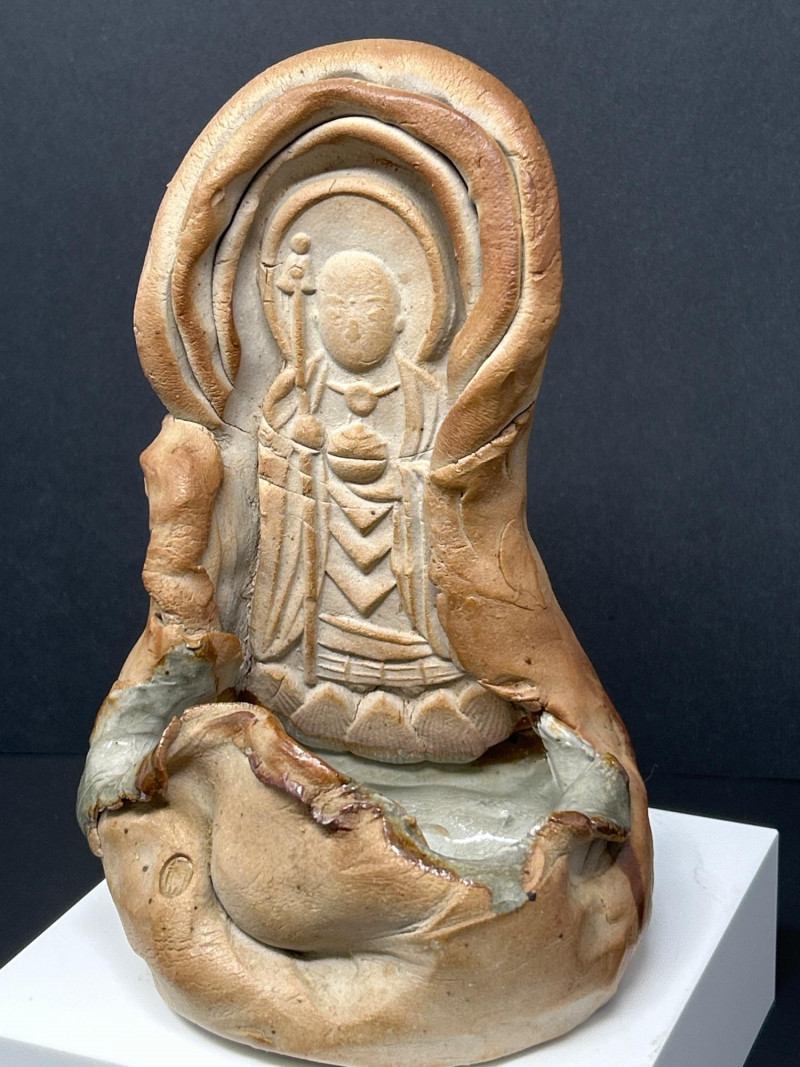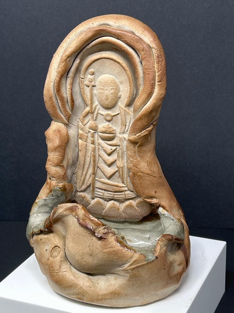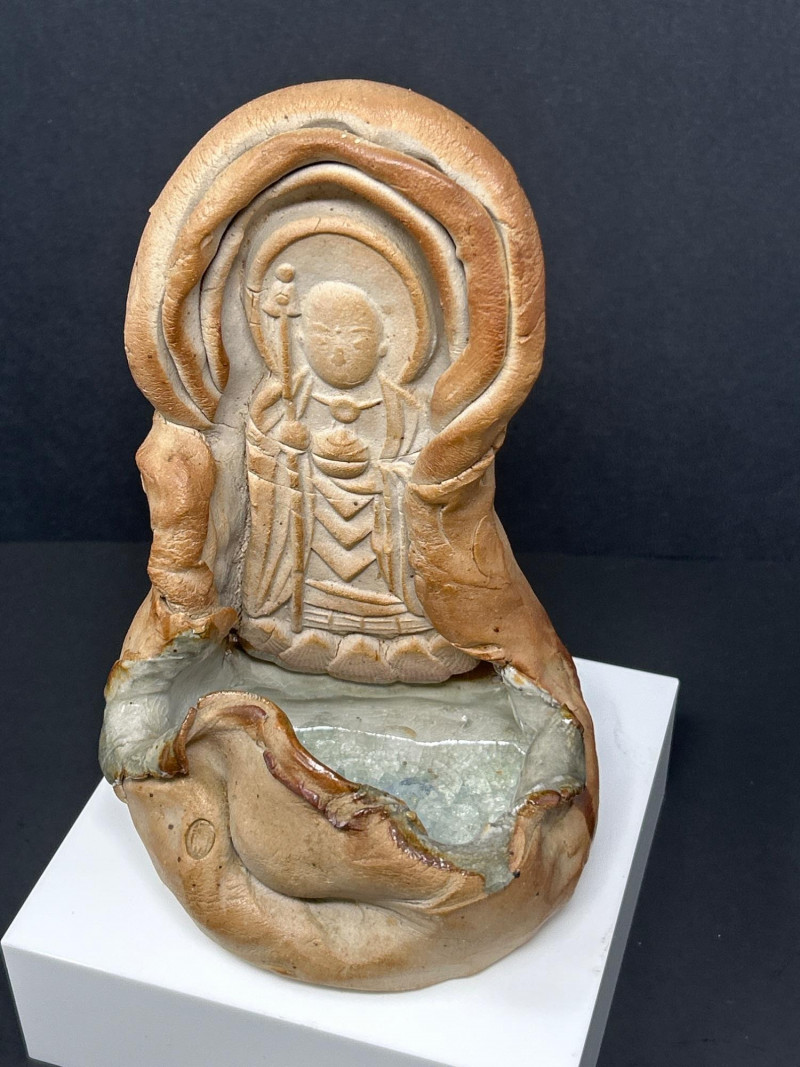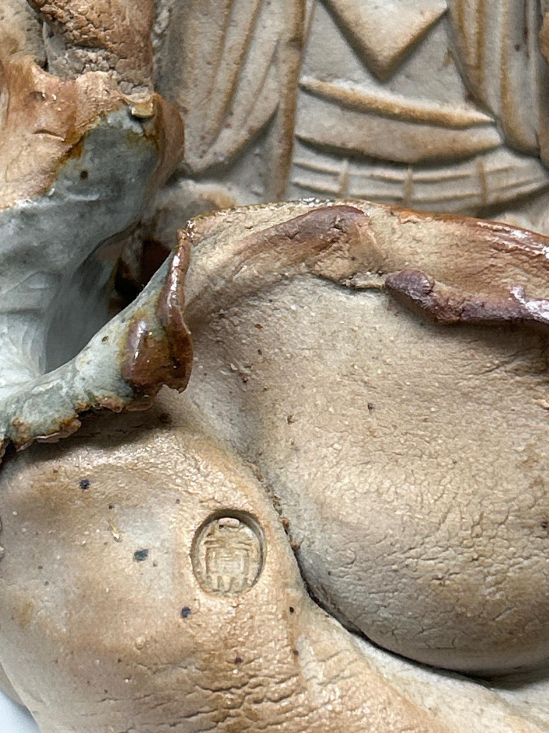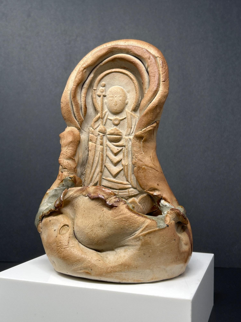 This expressive ceramic sculpture by Richard Kirsten‑Daiensai features a seated, meditative figure with a halo‑like form rising behind the head—an unmistakable nod to Kirsten’s lifelong engagement with Buddhist imagery and temple iconography. The figure holds a staff and is robed in flowing, stylized garments, rendered with Kirsten’s characteristic blend of abstraction and spiritual symbolism. The surface shows intentional textural variation and organic irregularities, giving the piece a timeless, almost archaeological presence. The muted earth‑tone glaze and sculptural fragmentation are consistent with Kirsten’s later ceramic work, where he explored themes of enlightenment, guardianship, and inner stillness. A powerful, contemplative example of his sculptural practice.