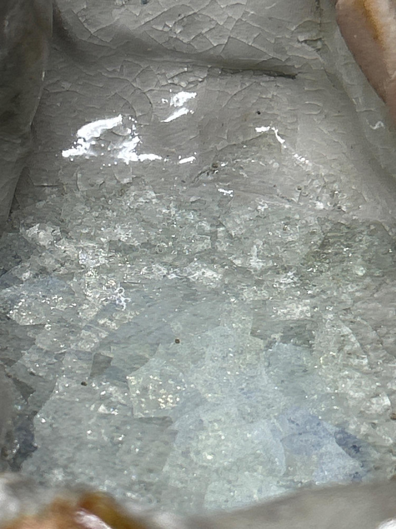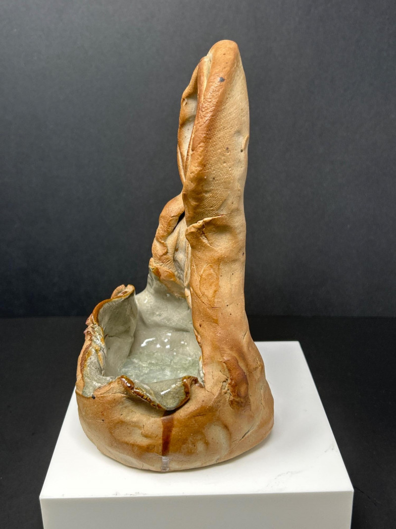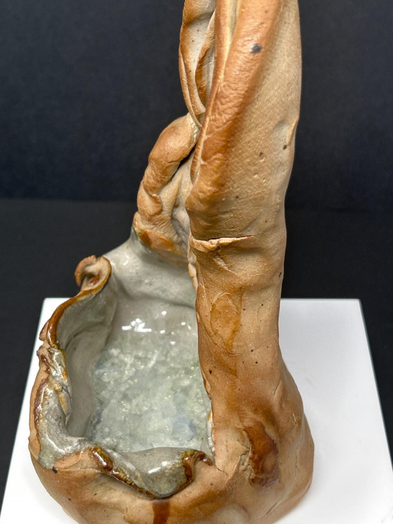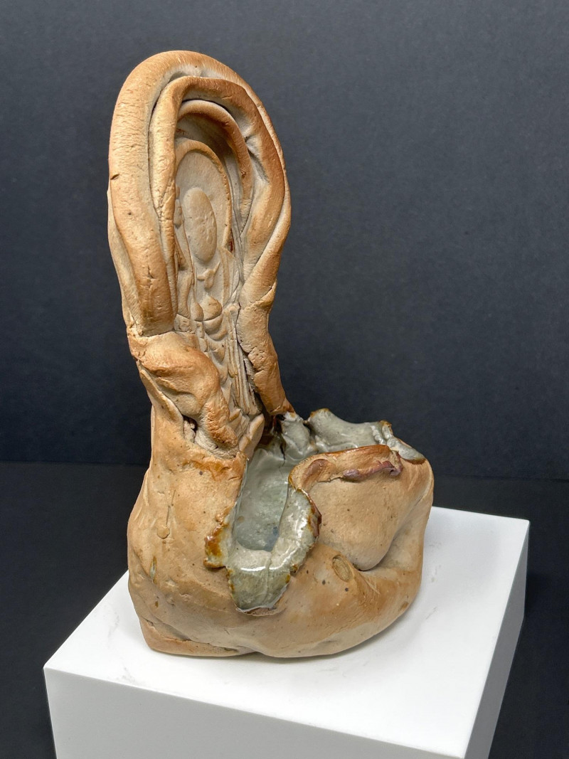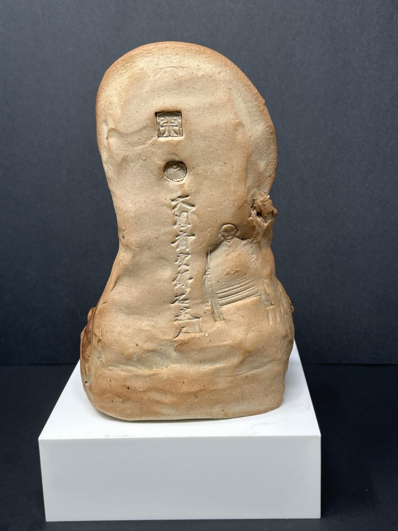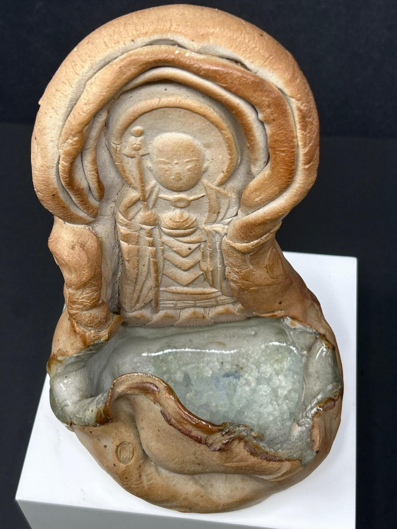 This expressive ceramic sculpture by Richard Kirsten‑Daiensai features a seated, meditative figure with a halo‑like form rising behind the head—an unmistakable nod to Kirsten’s lifelong engagement with Buddhist imagery and temple iconography. The figure holds a staff and is robed in flowing, stylized garments, rendered with Kirsten’s characteristic blend of abstraction and spiritual symbolism. The surface shows intentional textural variation and organic irregularities, giving the piece a timeless, almost archaeological presence. The muted earth‑tone glaze and sculptural fragmentation are consistent with Kirsten’s later ceramic work, where he explored themes of enlightenment, guardianship, and inner stillness. A powerful, contemplative example of his sculptural practice.