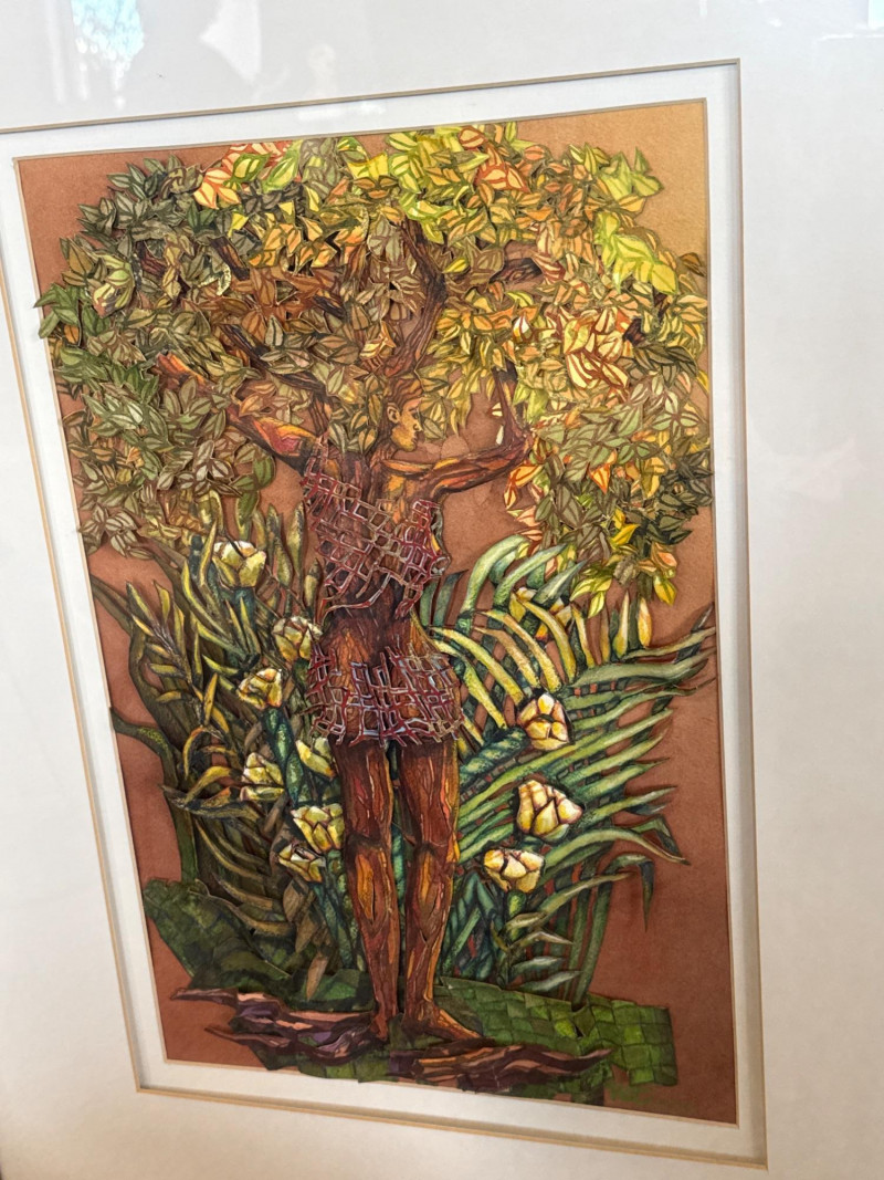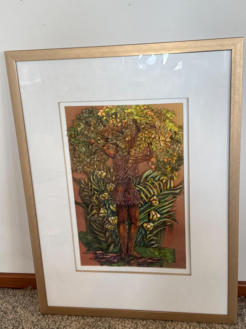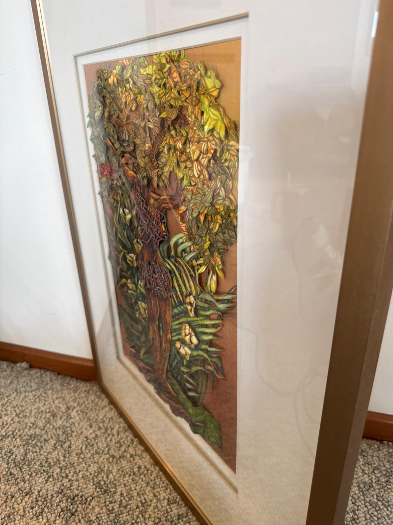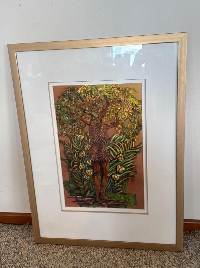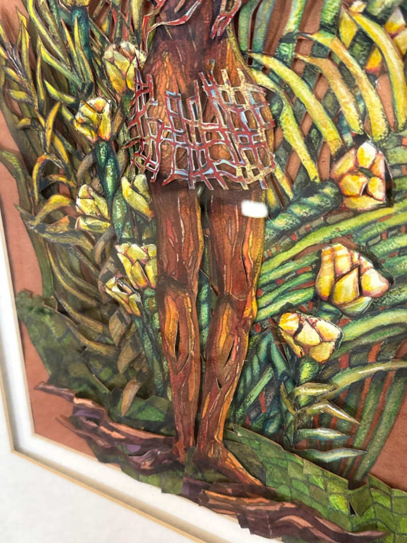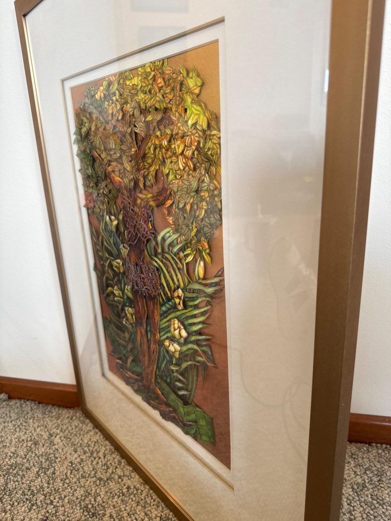 This original work by Willadene Torbenson is a striking example of her 3‑D contemporary realism technique, blending watercolor painting with dimensional, sculptural elements. The central figure stands within a lush environment of layered foliage, where painted surfaces and raised textural components merge to create depth and a sense of immersion. The upper body dissolves into a canopy of leaves and blossoms, while the lower figure remains more defined, grounding the composition. Torbenson’s palette of greens, golds, and earth tones enhances the organic feel, and the dimensional layering gives the piece a tactile presence that lifts it beyond traditional watercolor. The result is a visually rich, nature‑driven work that feels both intimate and mythic — a hallmark of Torbenson’s exploration of the human form intertwined with the natural world.