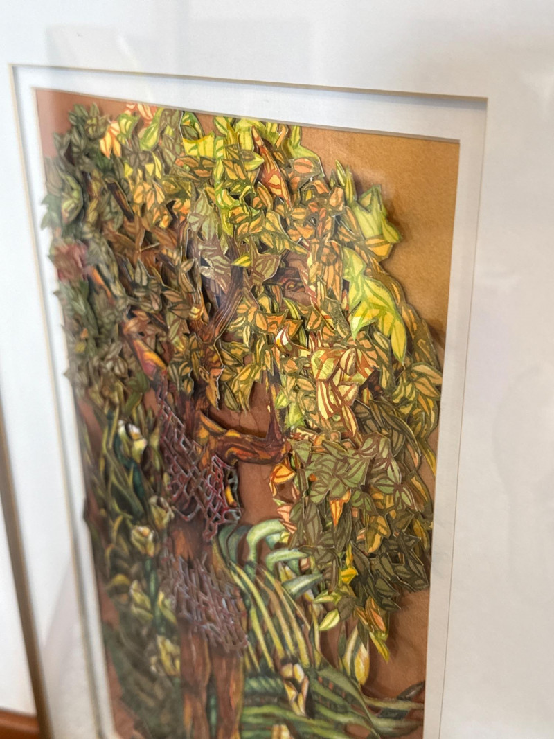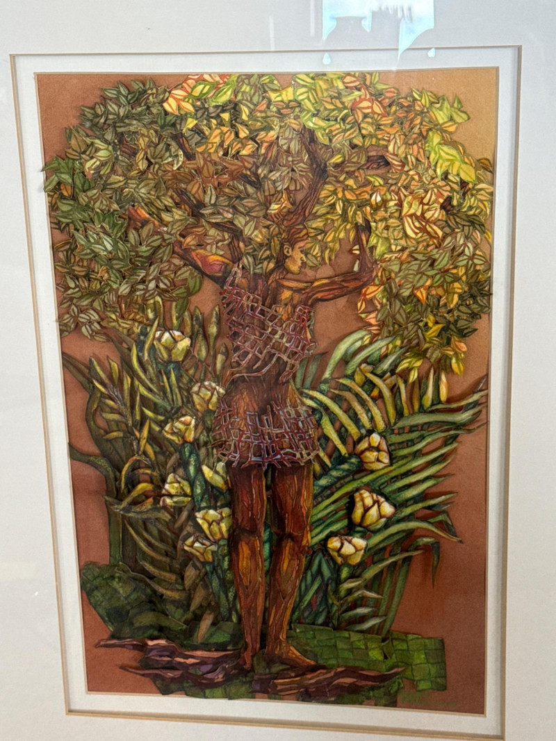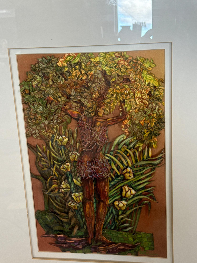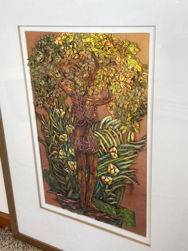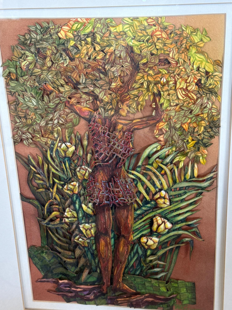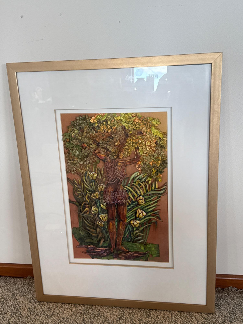 This original work by Willadene Torbenson is a striking example of her 3‑D contemporary realism technique, blending watercolor painting with dimensional, sculptural elements. The central figure stands within a lush environment of layered foliage, where painted surfaces and raised textural components merge to create depth and a sense of immersion. The upper body dissolves into a canopy of leaves and blossoms, while the lower figure remains more defined, grounding the composition. Torbenson’s palette of greens, golds, and earth tones enhances the organic feel, and the dimensional layering gives the piece a tactile presence that lifts it beyond traditional watercolor. The result is a visually rich, nature‑driven work that feels both intimate and mythic — a hallmark of Torbenson’s exploration of the human form intertwined with the natural world.