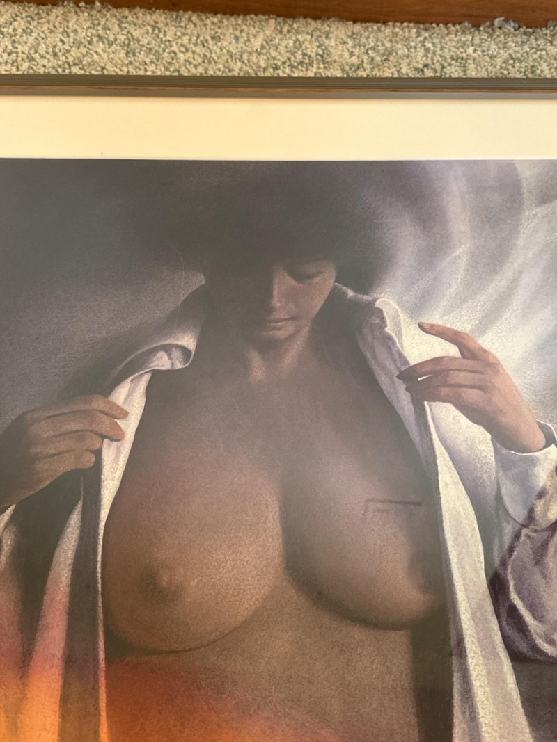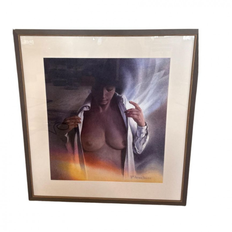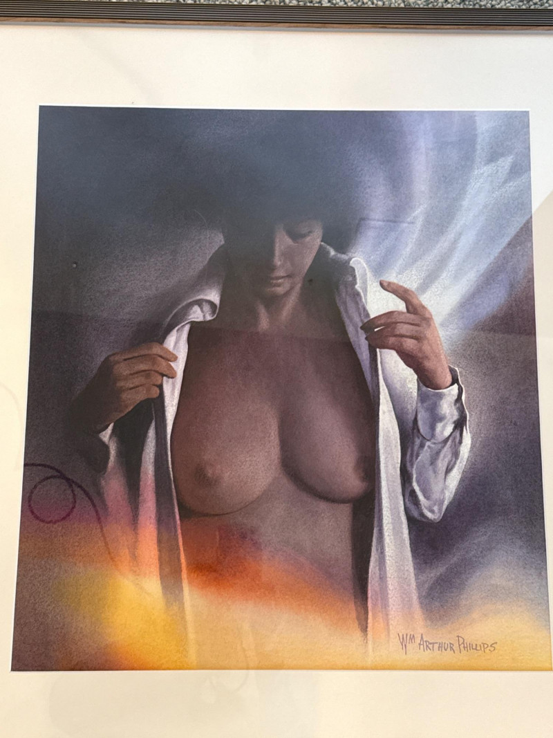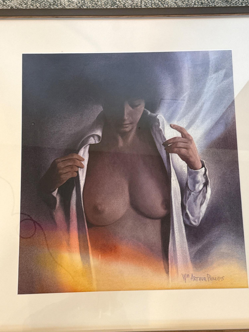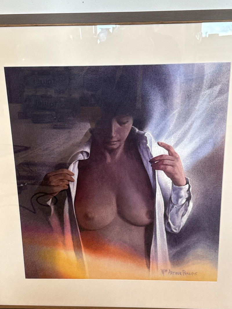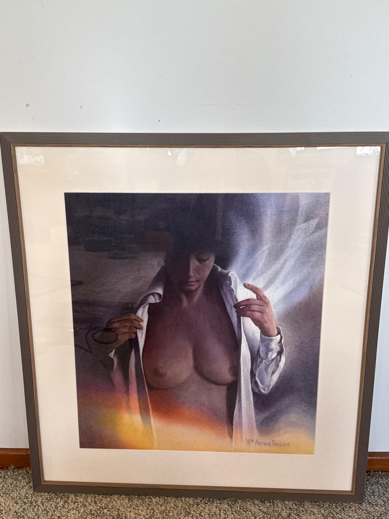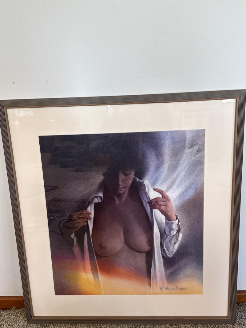 The woman stands in the foreground wearing a white shirt worn open, giving her a relaxed, informal presence against the landscape. Her short hair frames her face simply, adding to the understated, natural feel of the scene. Phillips paints her with soft, minimal detail—enough to give her character without overwhelming the composition. She appears calm and observant, positioned as a quiet human counterpoint to the expansive mountains and water behind her. Her posture and styling contribute to the painting’s overall sense of ease and contemplation. W.M. Arthur Phillips was an American landscape painter active throughout the mid‑20th century, known for his serene mountain, lake, and coastal scenes. Working primarily in watercolor and oil, he favored cool palettes, gentle atmospheric light, and compositions that evoke stillness and reflection. Phillips’ paintings often include small human or architectural elements—figures, boats, cabins—to give scale and narrative without disrupting the tranquility of the natural setting. His work appears in private collections across the United States and remains appreciated for its traditional realism, calm mood, and ability to capture the quiet beauty of the American landscape. 27.5 x 29.5 Short Artist Bio — W.M. Arthur Phillips