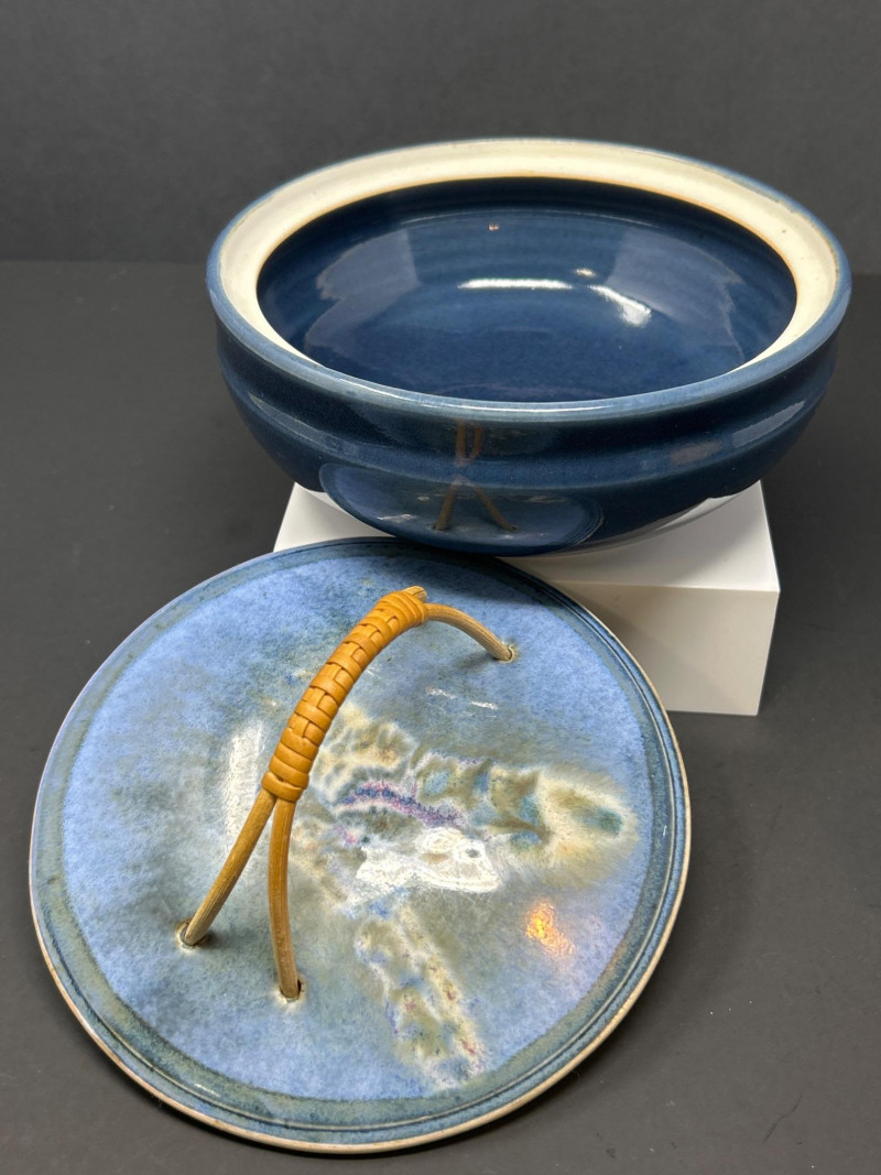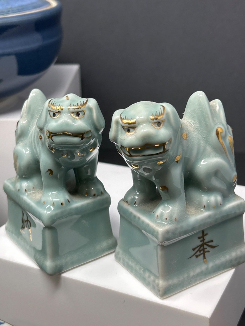 A large, deep blue ceramic bowl with matching lid and a woven rattan‑style handle. Bold color and traditional form make it an excellent accent or storage piece. Pair of Ceramic Guardian Lions (Foo Dogs)