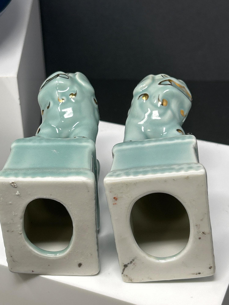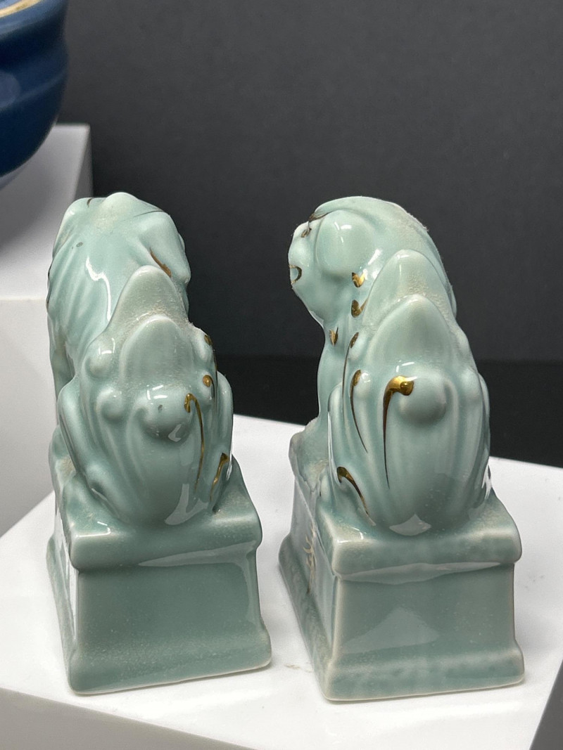 Two light‑blue guardian lions with gold accents and raised bases featuring Chinese characters. Classic protective symbols traditionally placed at entryways or altars. Strong sculptural detail and good shelf presence. Green Ceramic Vase with Bamboo Motif