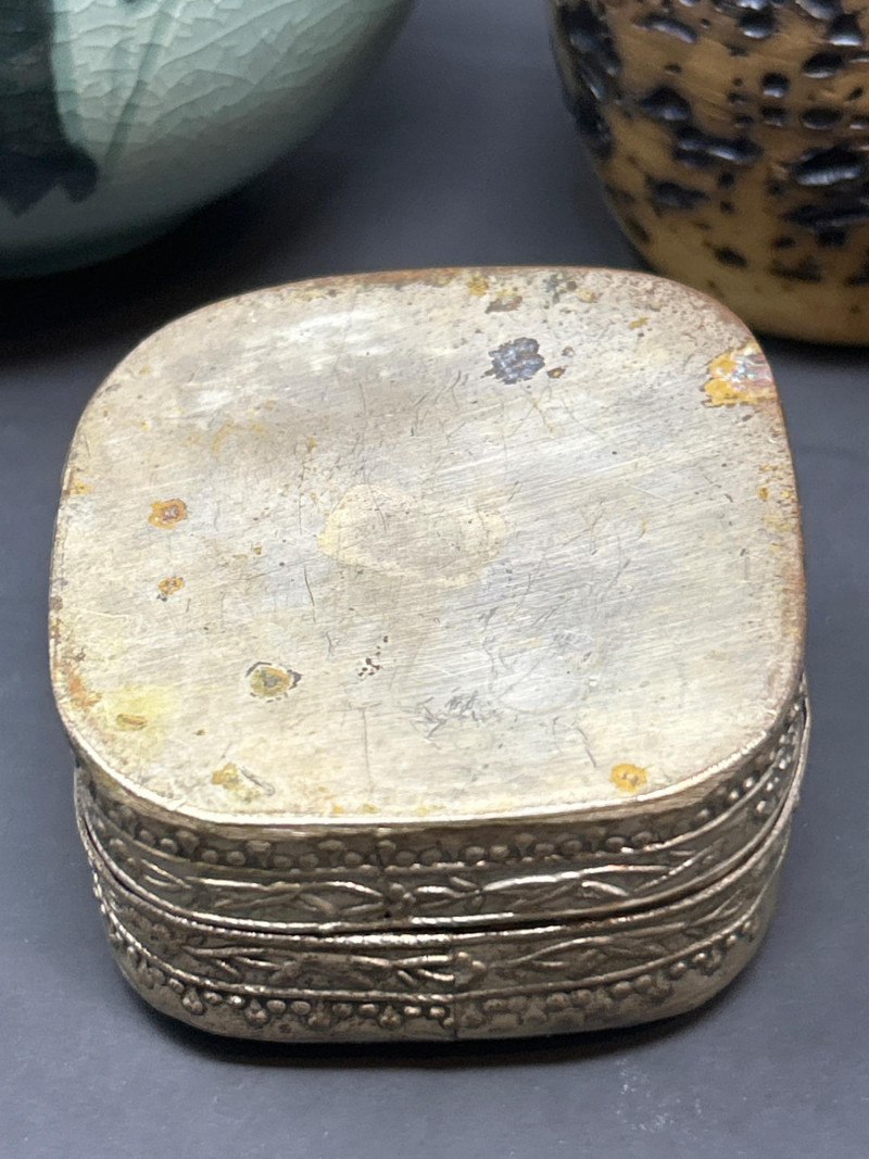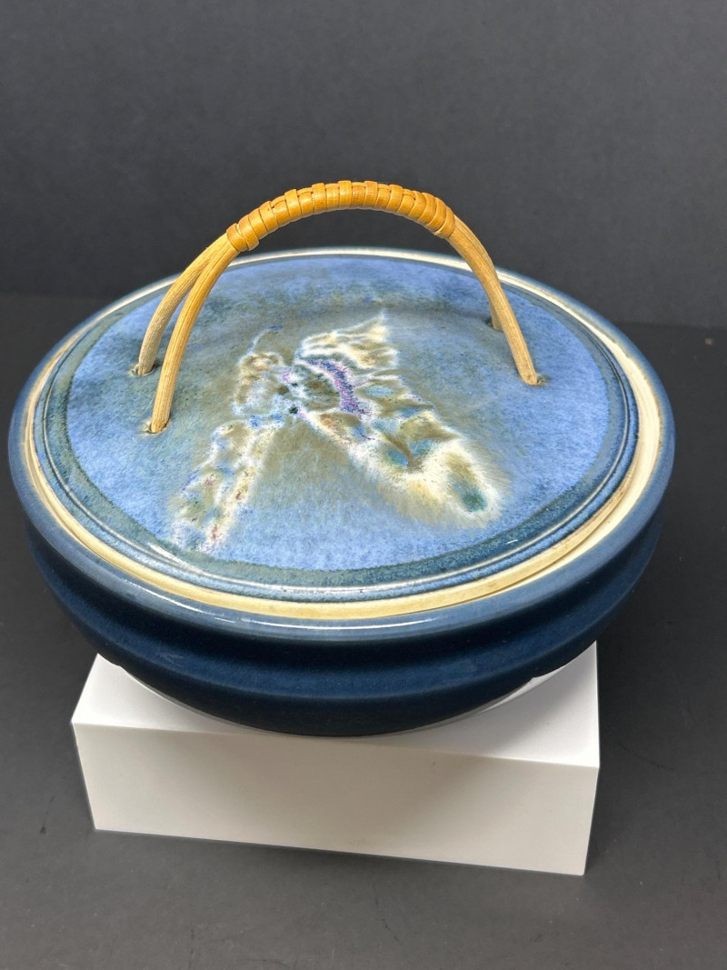 A petite lidded porcelain box with blue floral decoration and a metallic‑tone base. Perfect for jewelry, trinkets, or decorative stacking.Included in the Lot