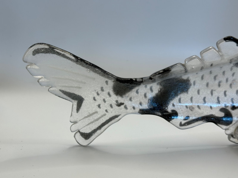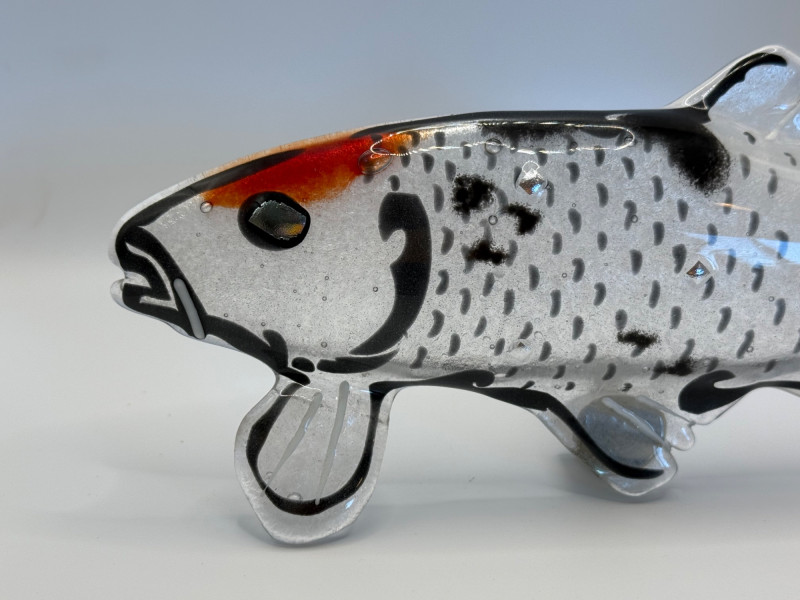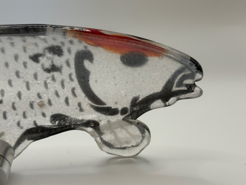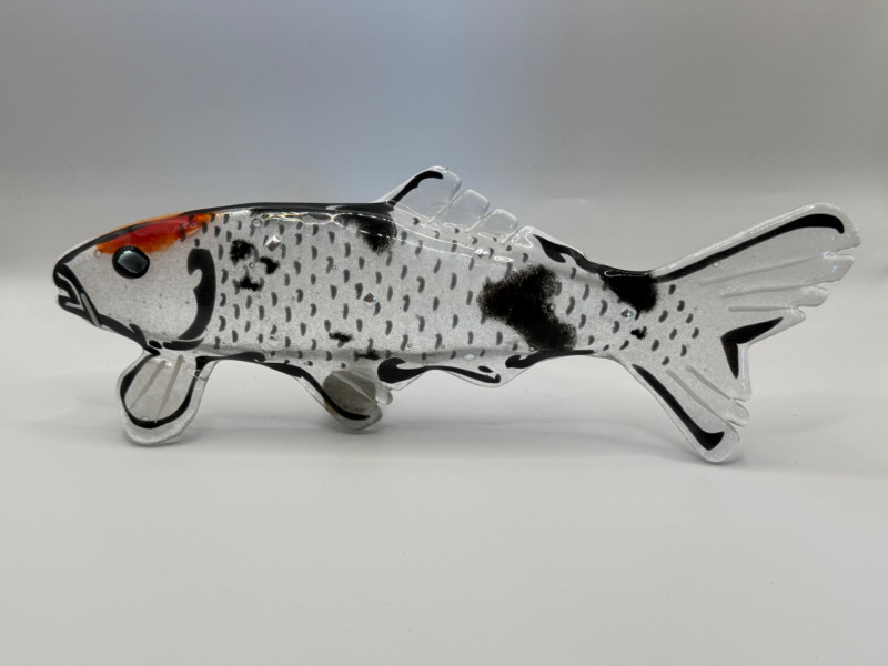 Hand‑blown glass koi fish wall art. Clear glass with orange and black details. Contemporary studio glass. 8” × 10” × 3”.”