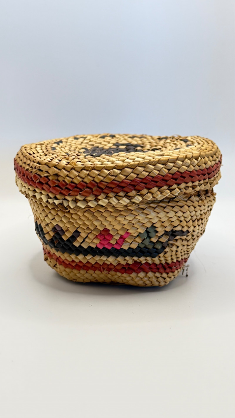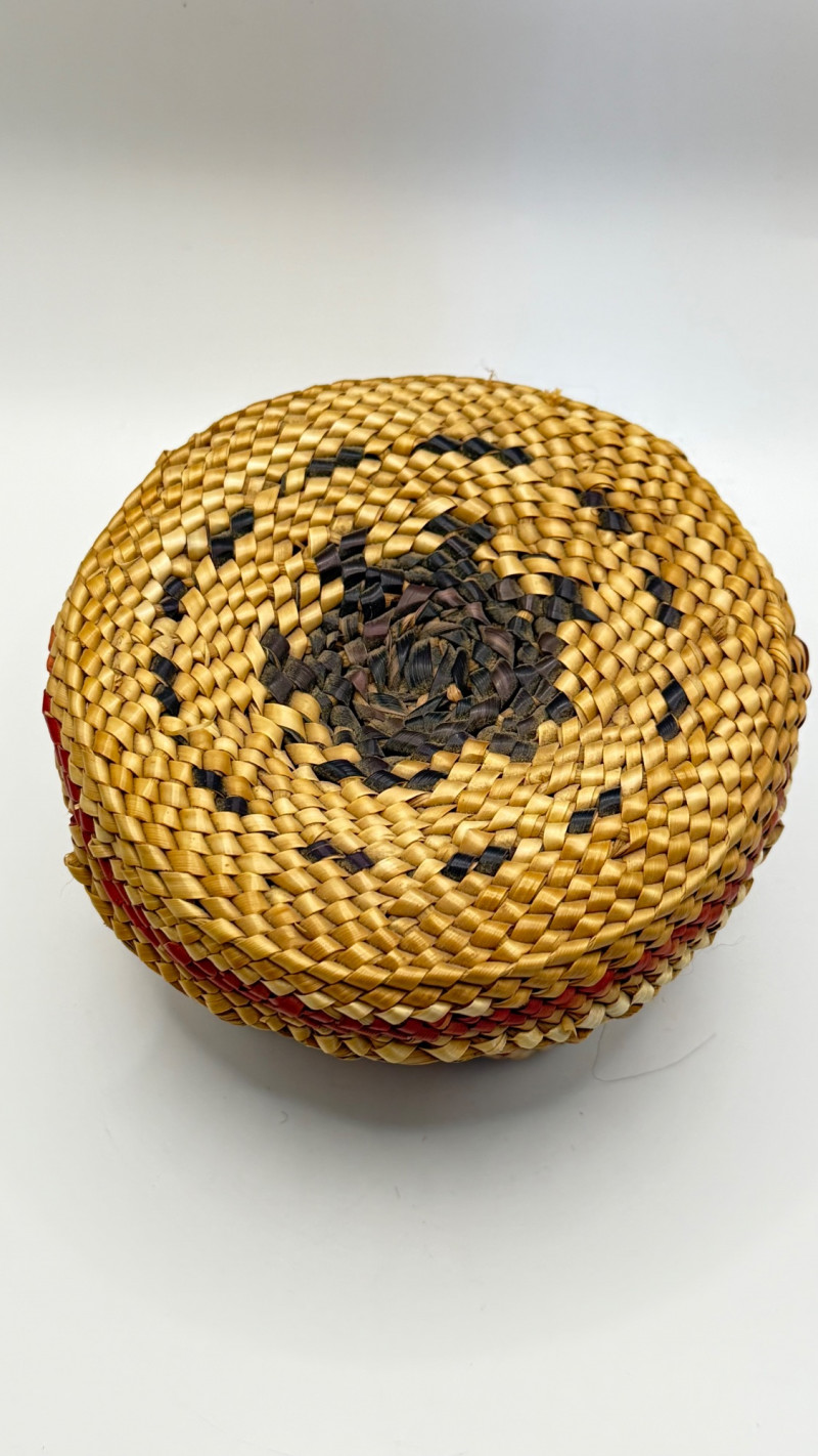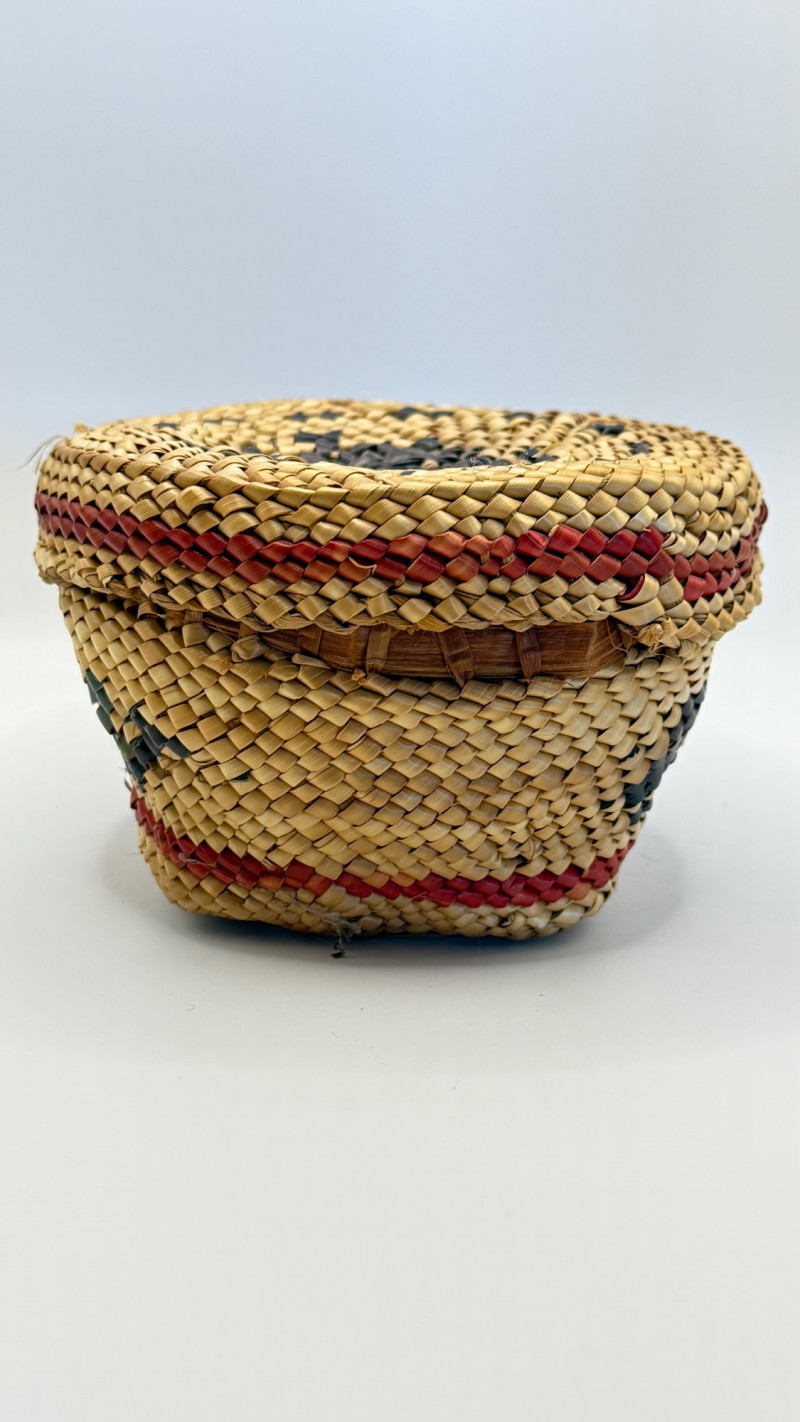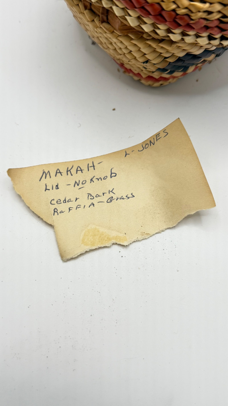 This is a hand‑woven Makah basket made from split Western red cedar with cedar bark and dyed weft elements. The Makah Tribe (Neah Bay, Washington) is renowned for its finely woven cedar baskets, often incorporating geometric patterns and tight, durable stitching. This basket is signed “L. Jones”, which corresponds to a known family name among Makah weavers.